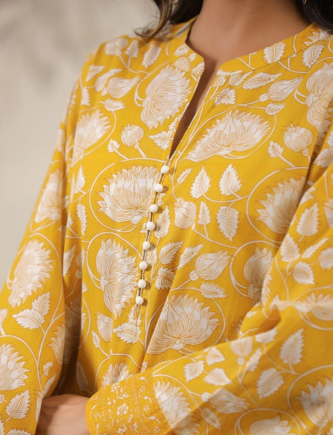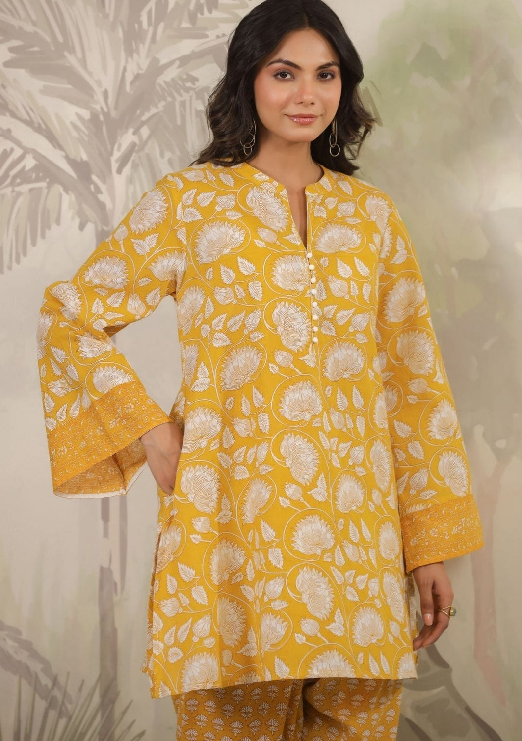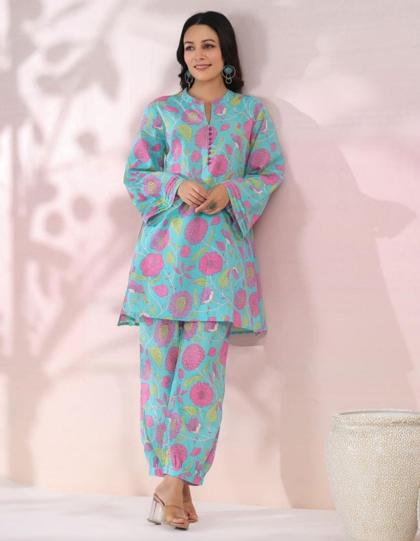 Beautiful Digital Designer Floral Print Cotton Dobby Two Piece Co-ord Set With Designer Sleeves Paired With Digital Designer Floral Print Bottom