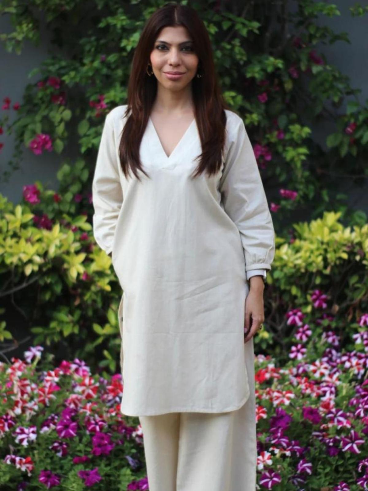 A traditional outfit with alya cut kurti with work on the yoke. The floral print is perfect for all the gorgeous ladies. This two piece set with kurta and Palazzo will look amazing with a pair of heels.