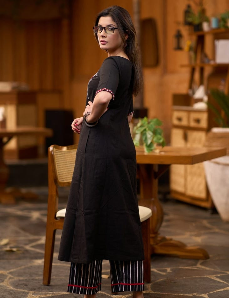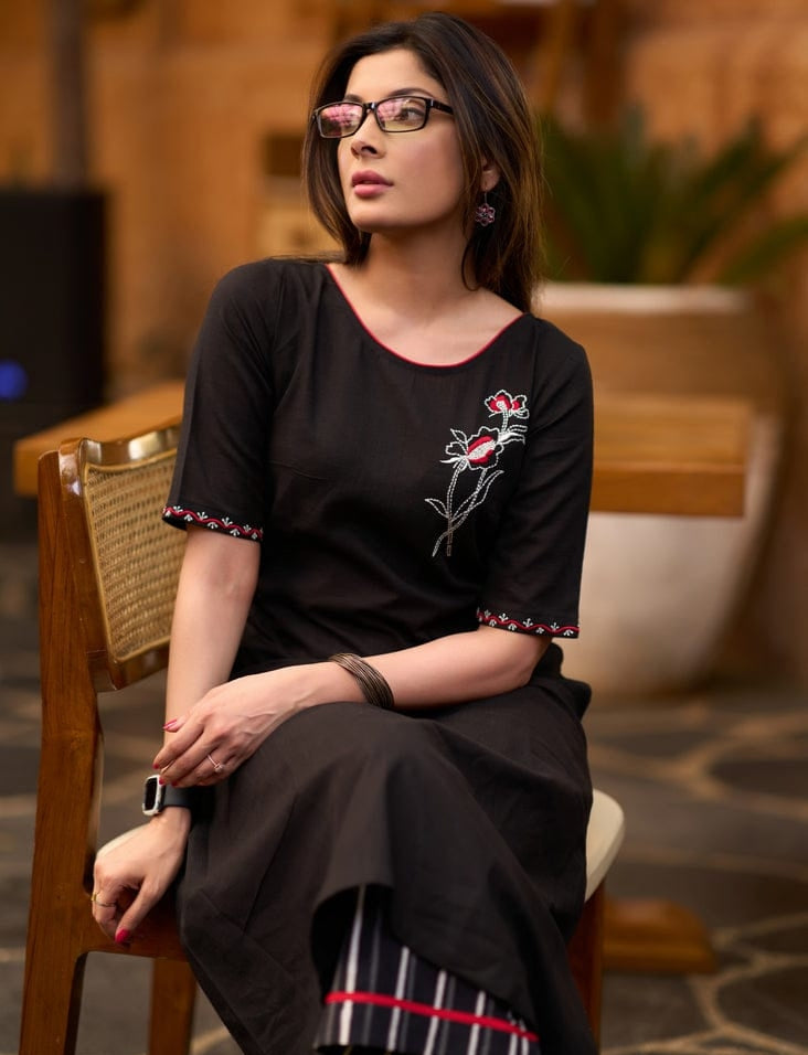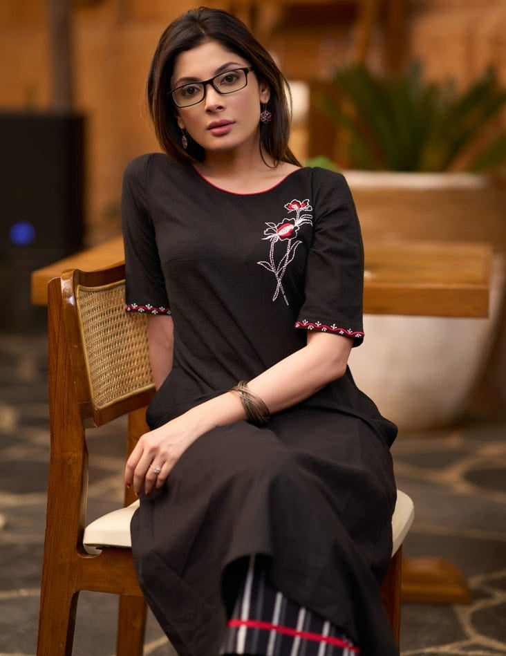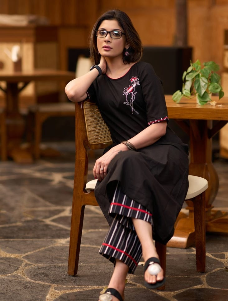Classy Cotton Flex Black Beauty Kurta With One Side Pocket and Hand Embroidered Work on Yoke And Sleeves Paired With Printed Pant