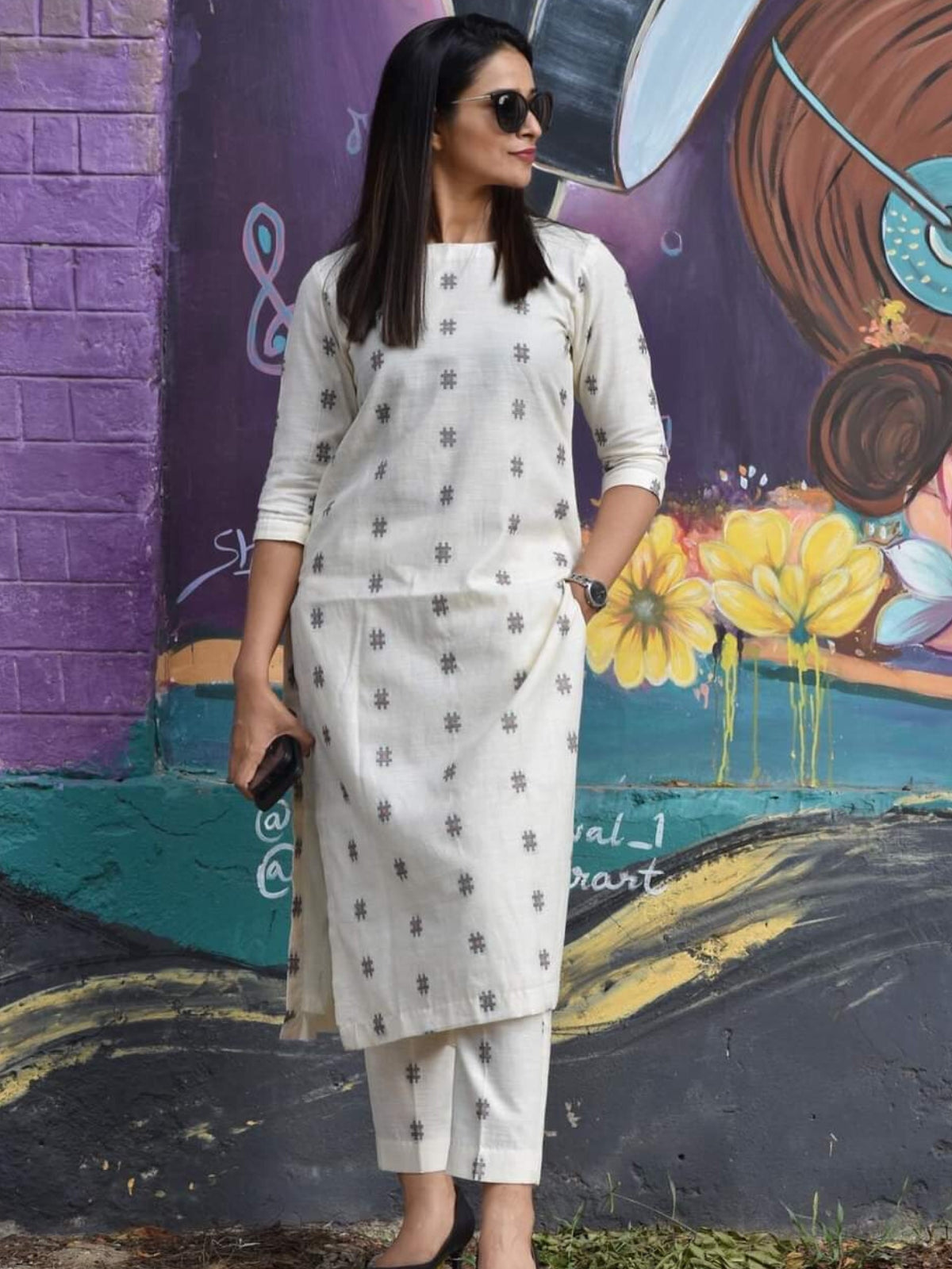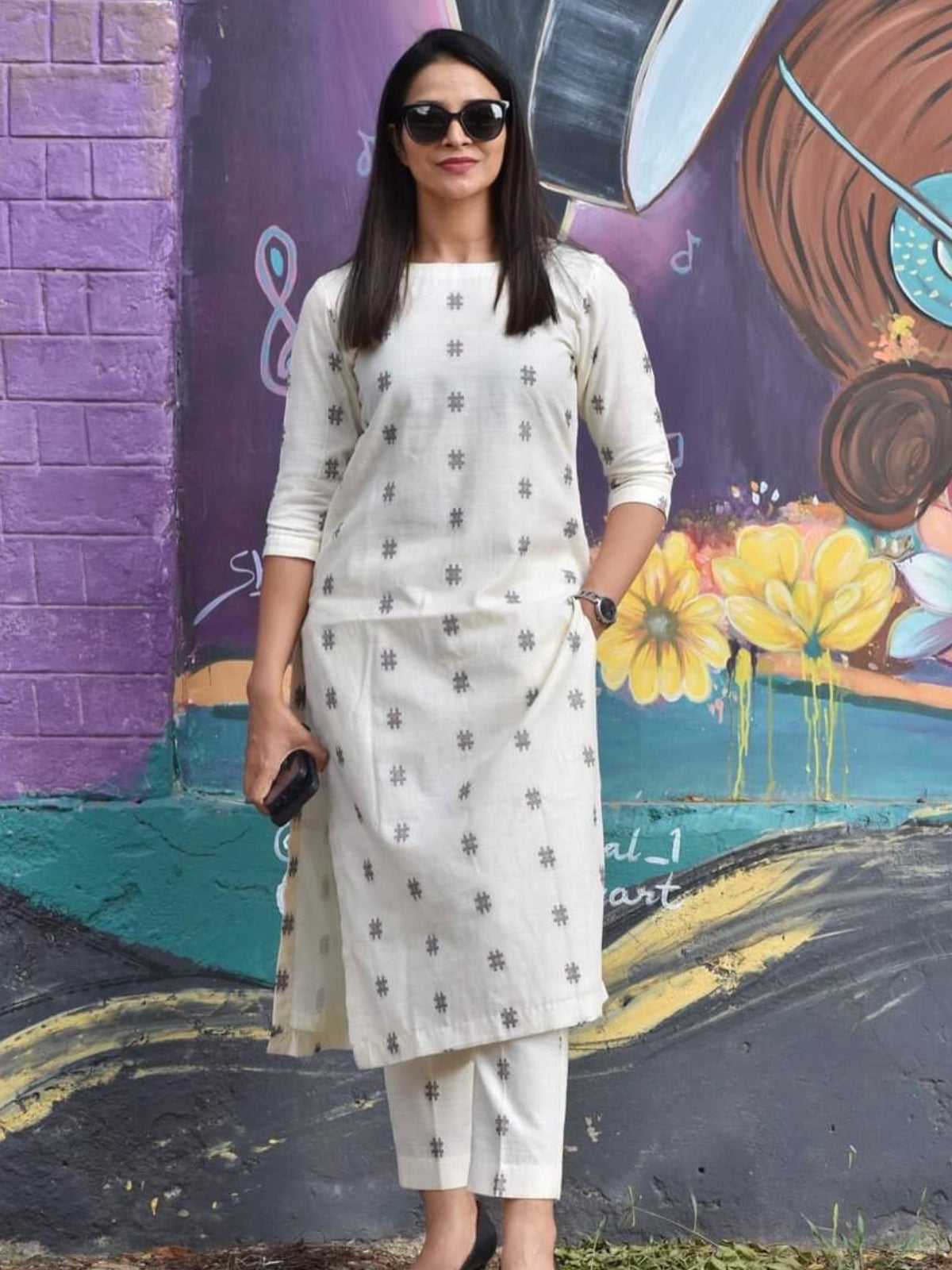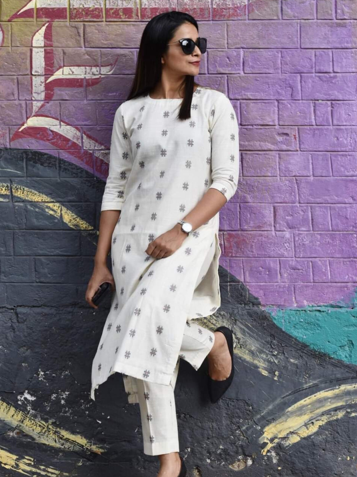 A smart kurta set in up and down print in white is an excellent choice for your work everyday. Let everyone admire and adore you
