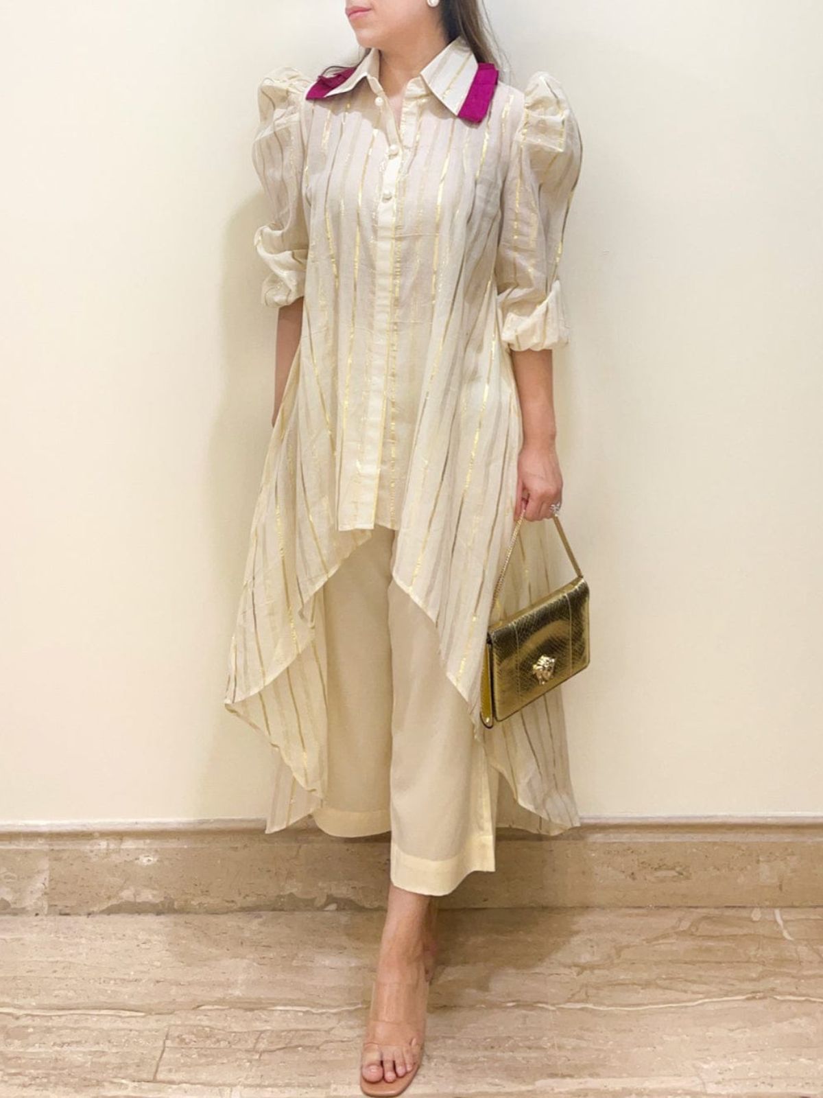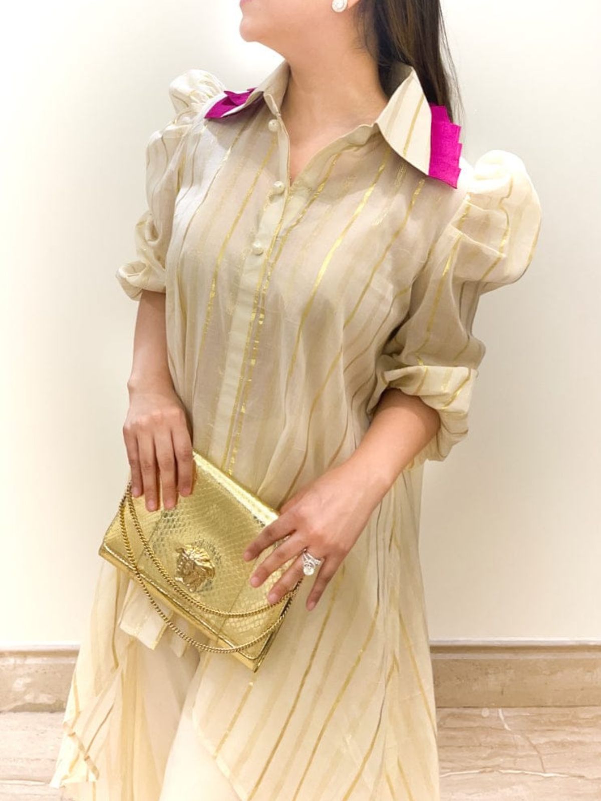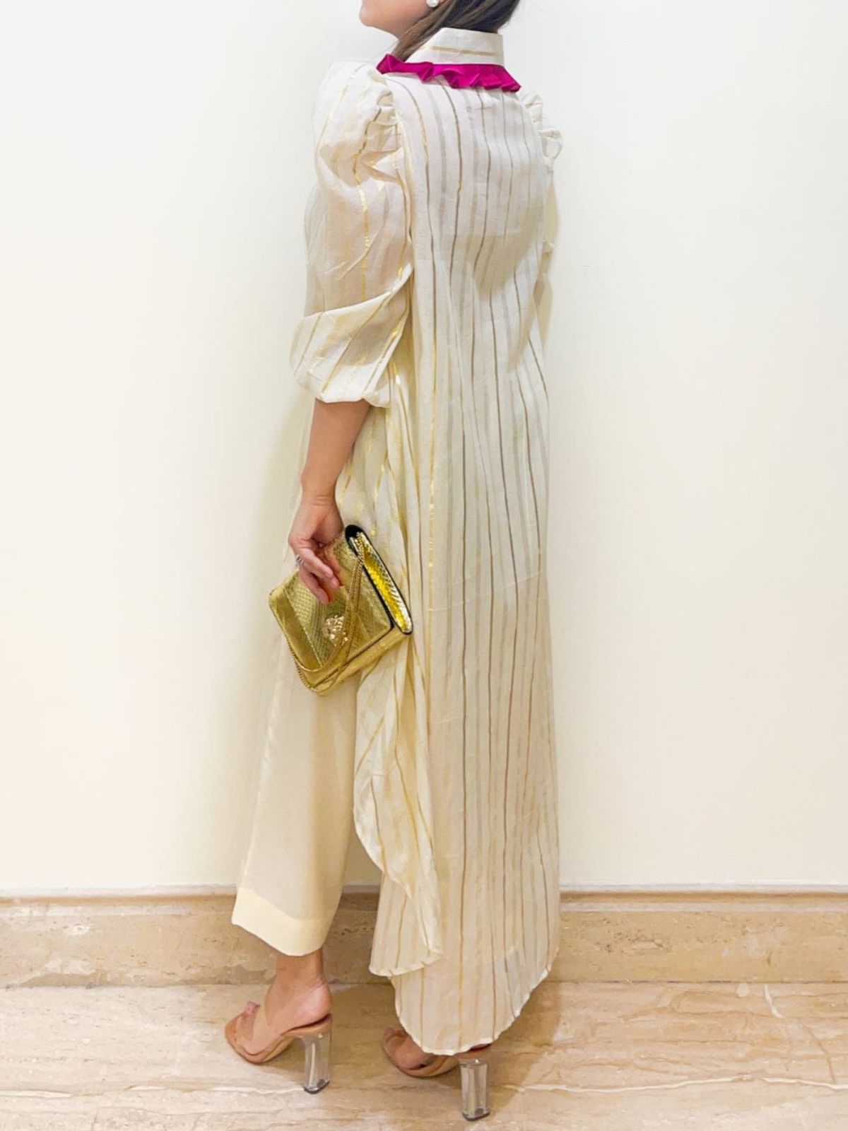 New in collection, self golden thread work kurta Plazzo set. Get your hands on our beautiful kurti with intricate thread golden work detailing in bright tone perfect for any auspicious occasion.