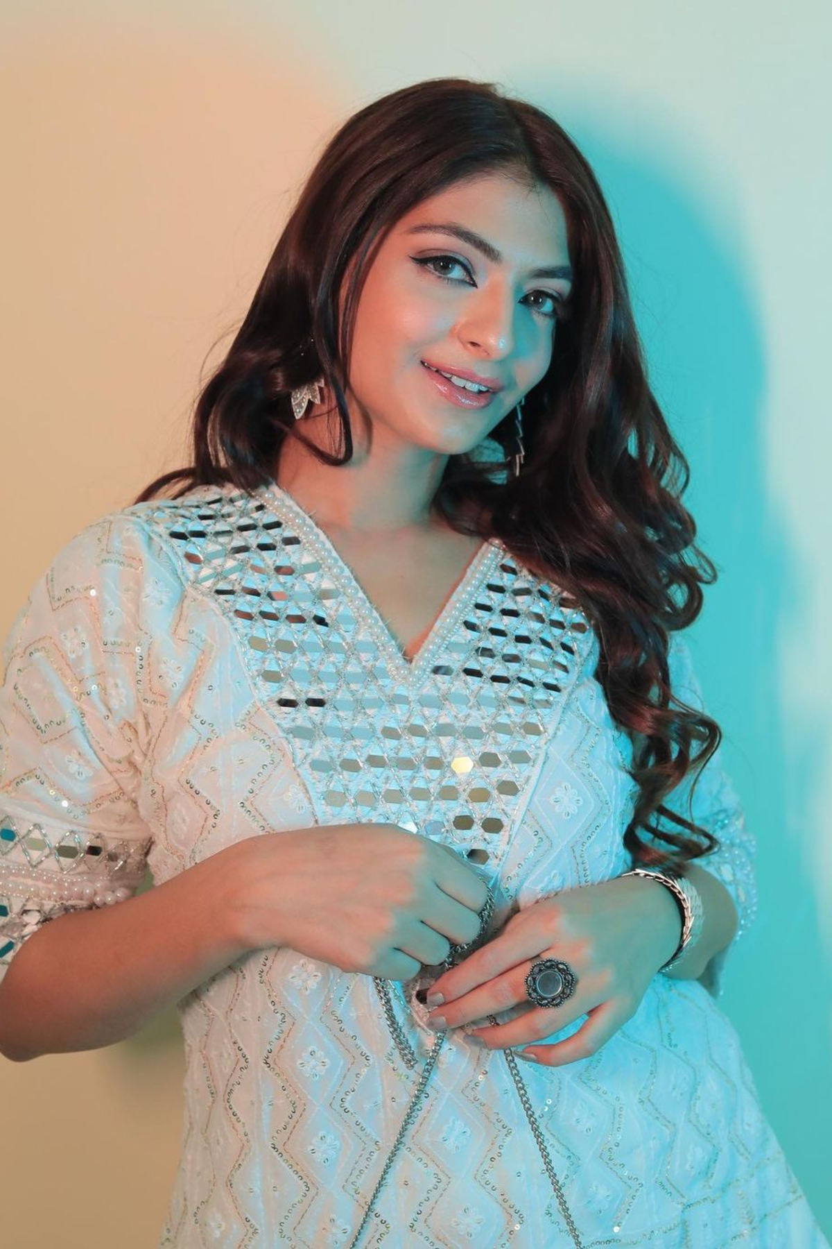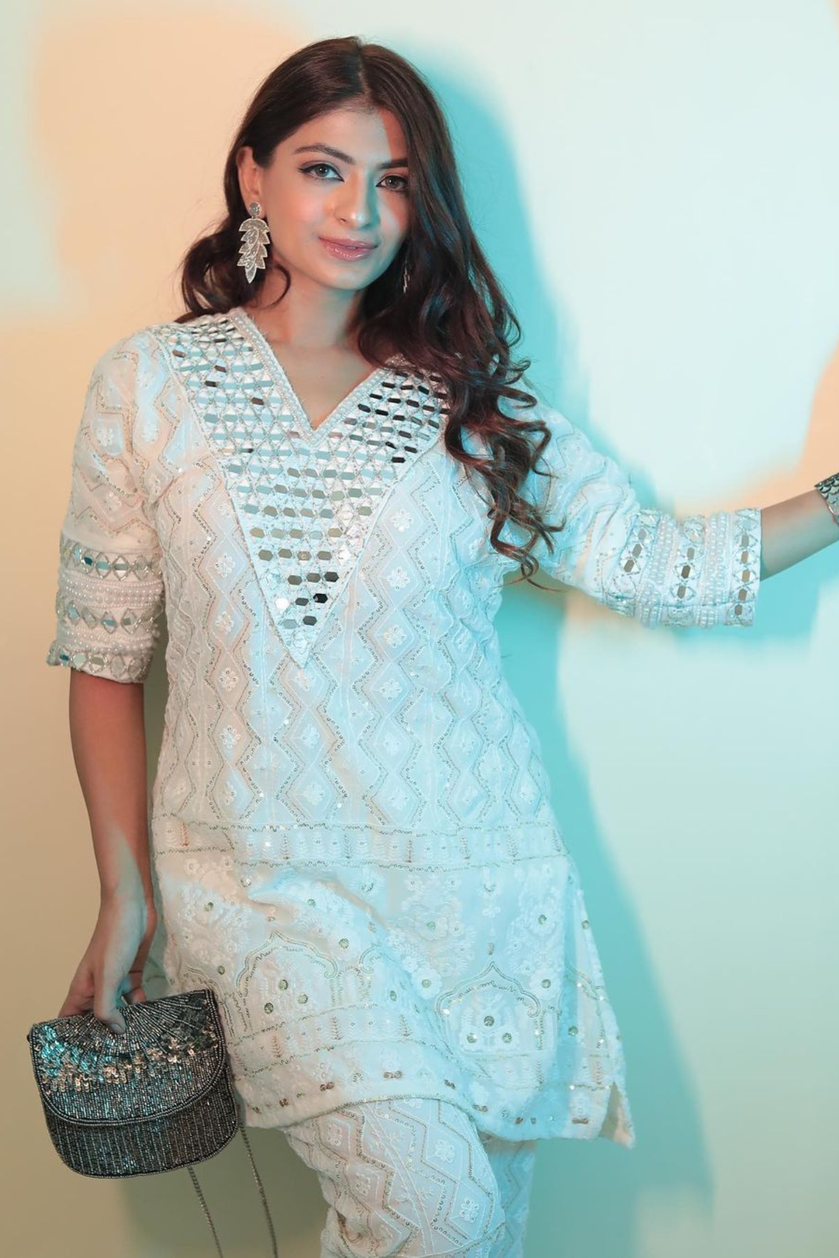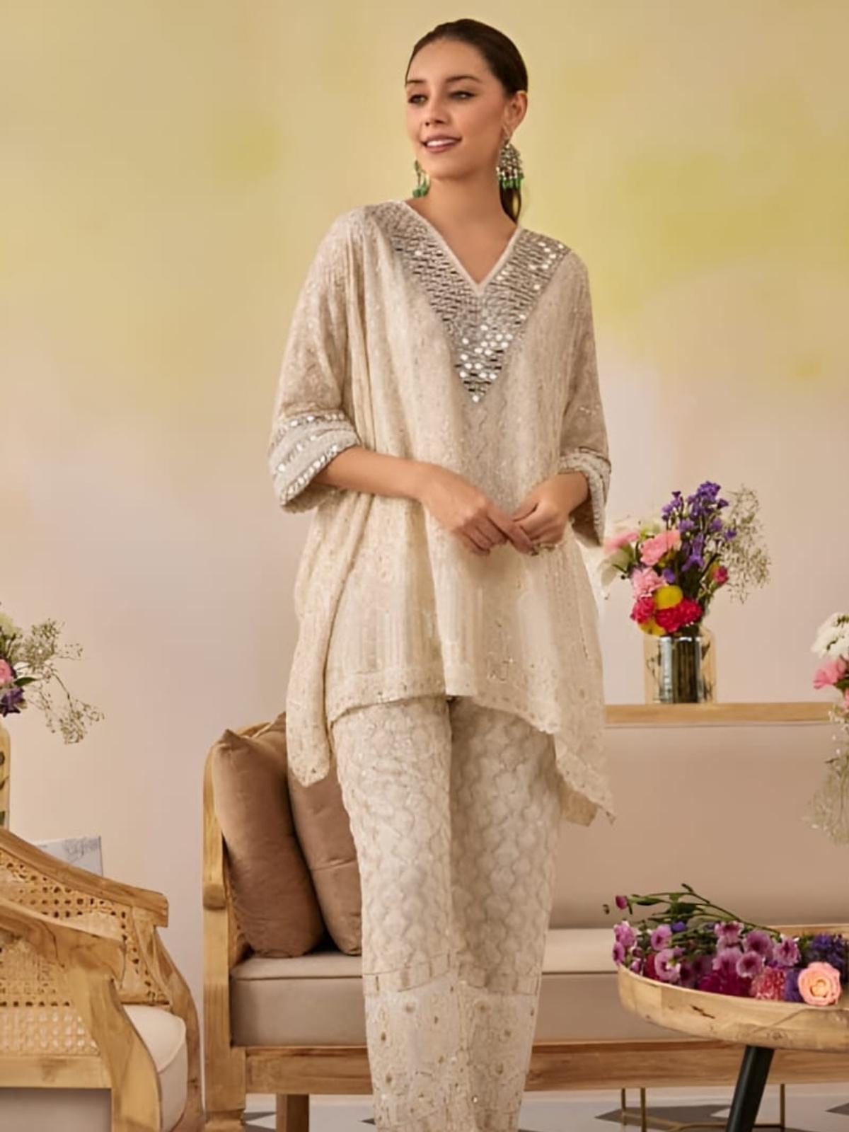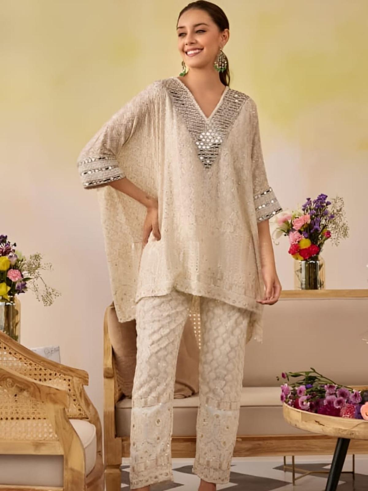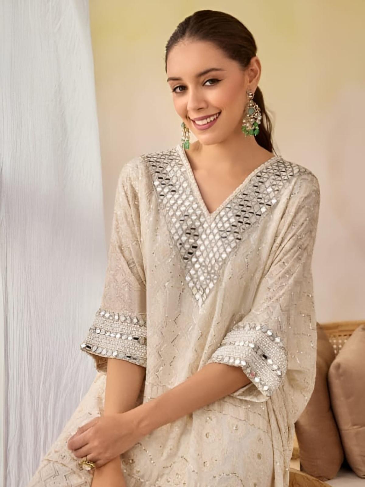 This designer kaftaan set has a beautiful moti and mirror work on the yoke and sleeves. The outfit is made with chikankari fabric with beautiful handcrafted work.