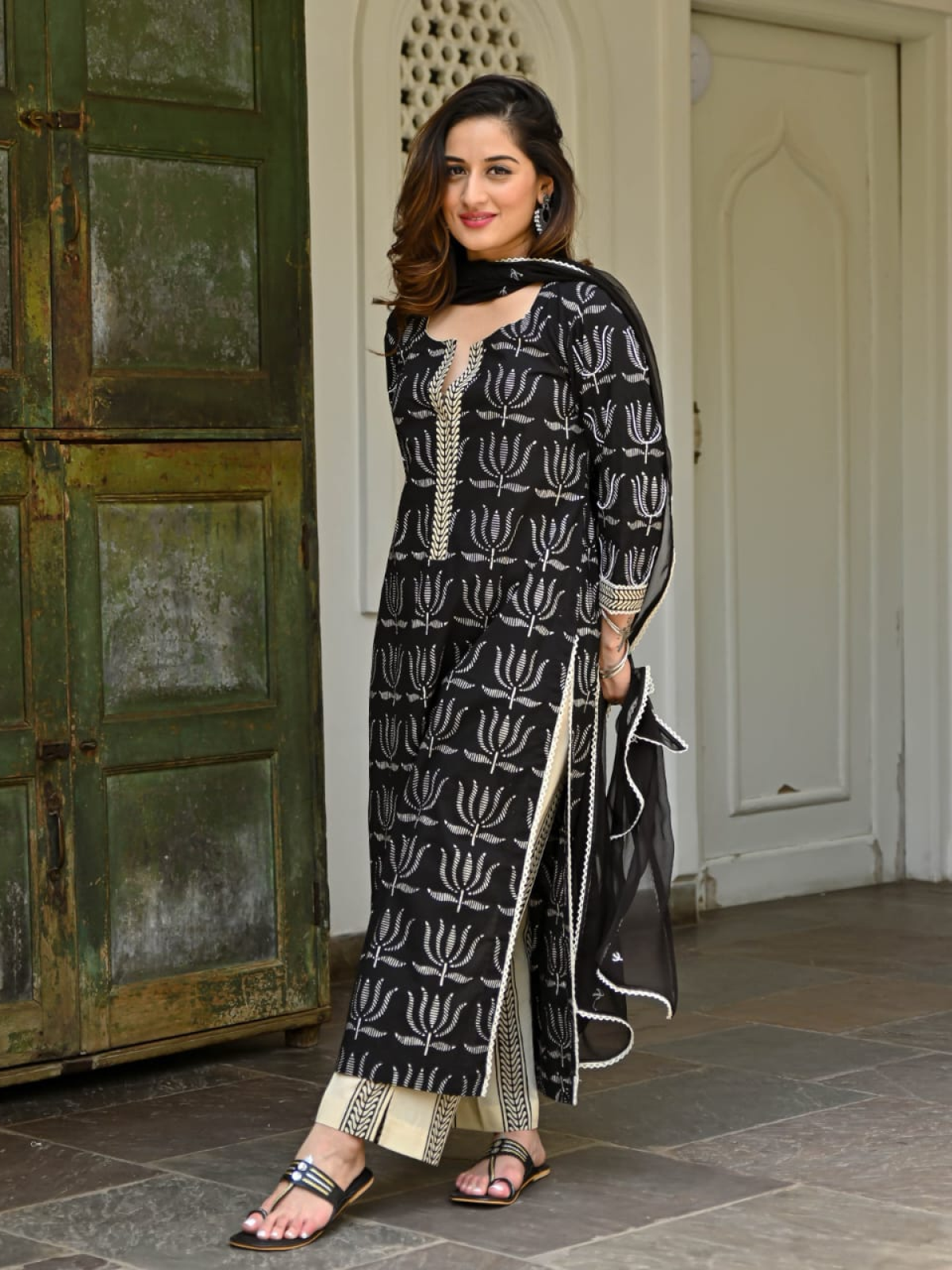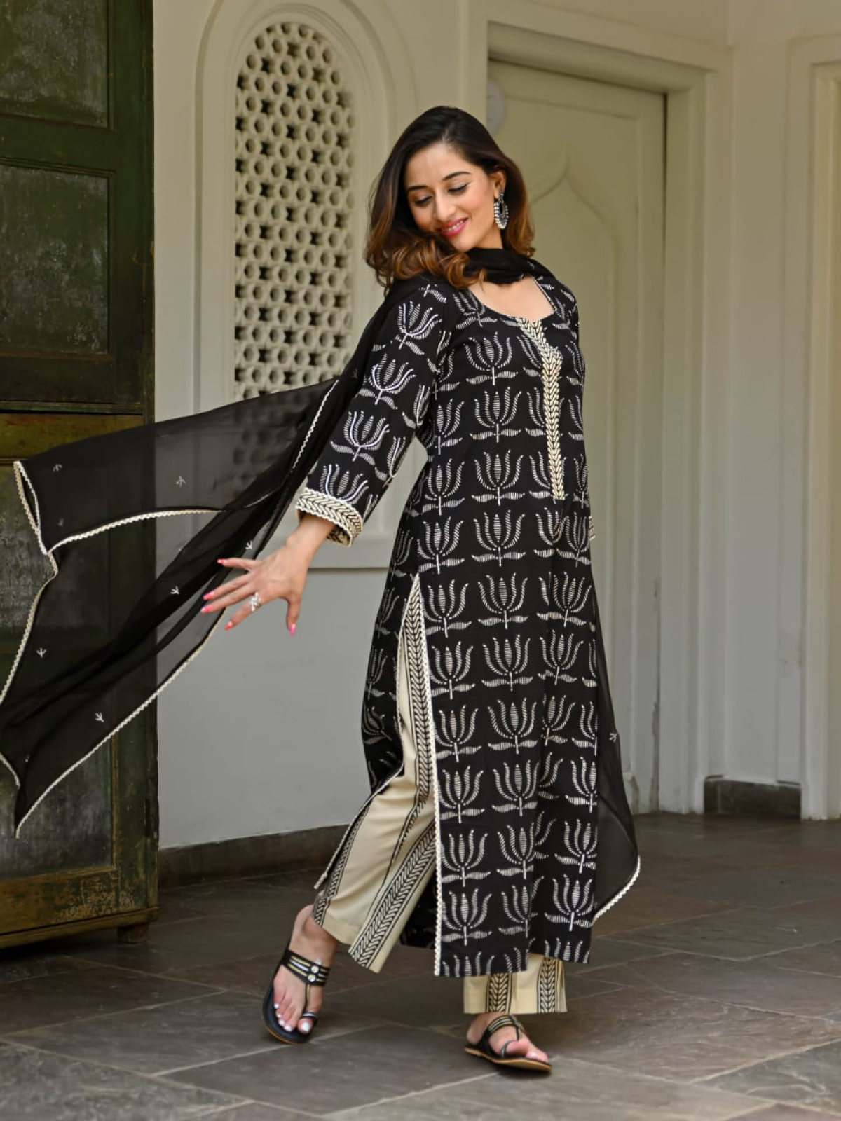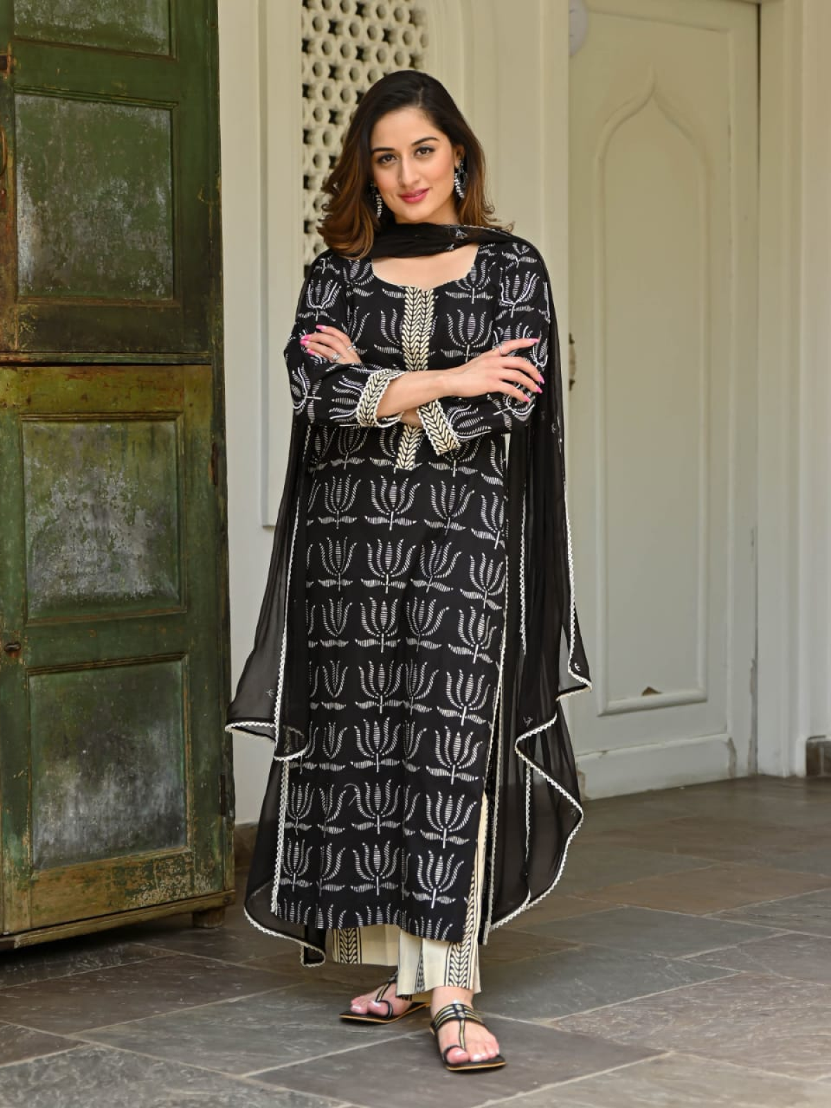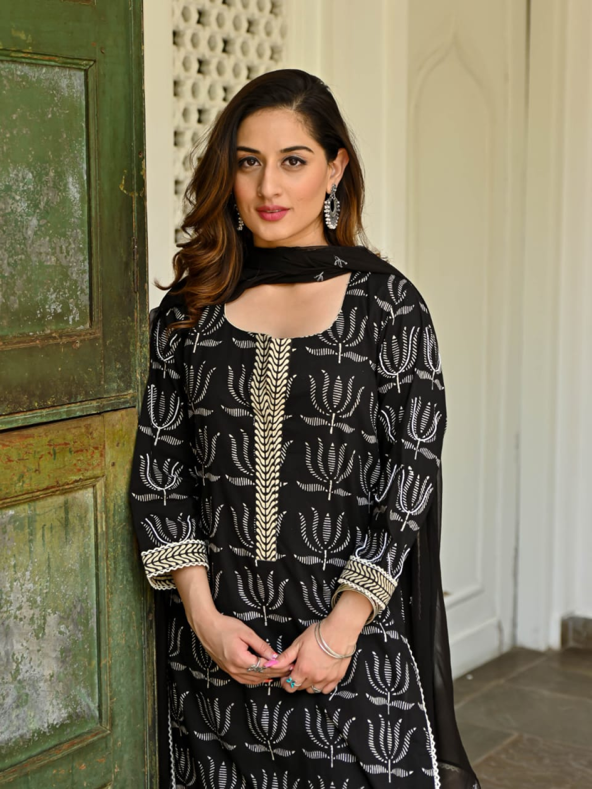 Black outfit is a must in every wardrobe. This three piece sut set with long kurta is something you can never go wrong with. Just perfect for your evening get togethers.