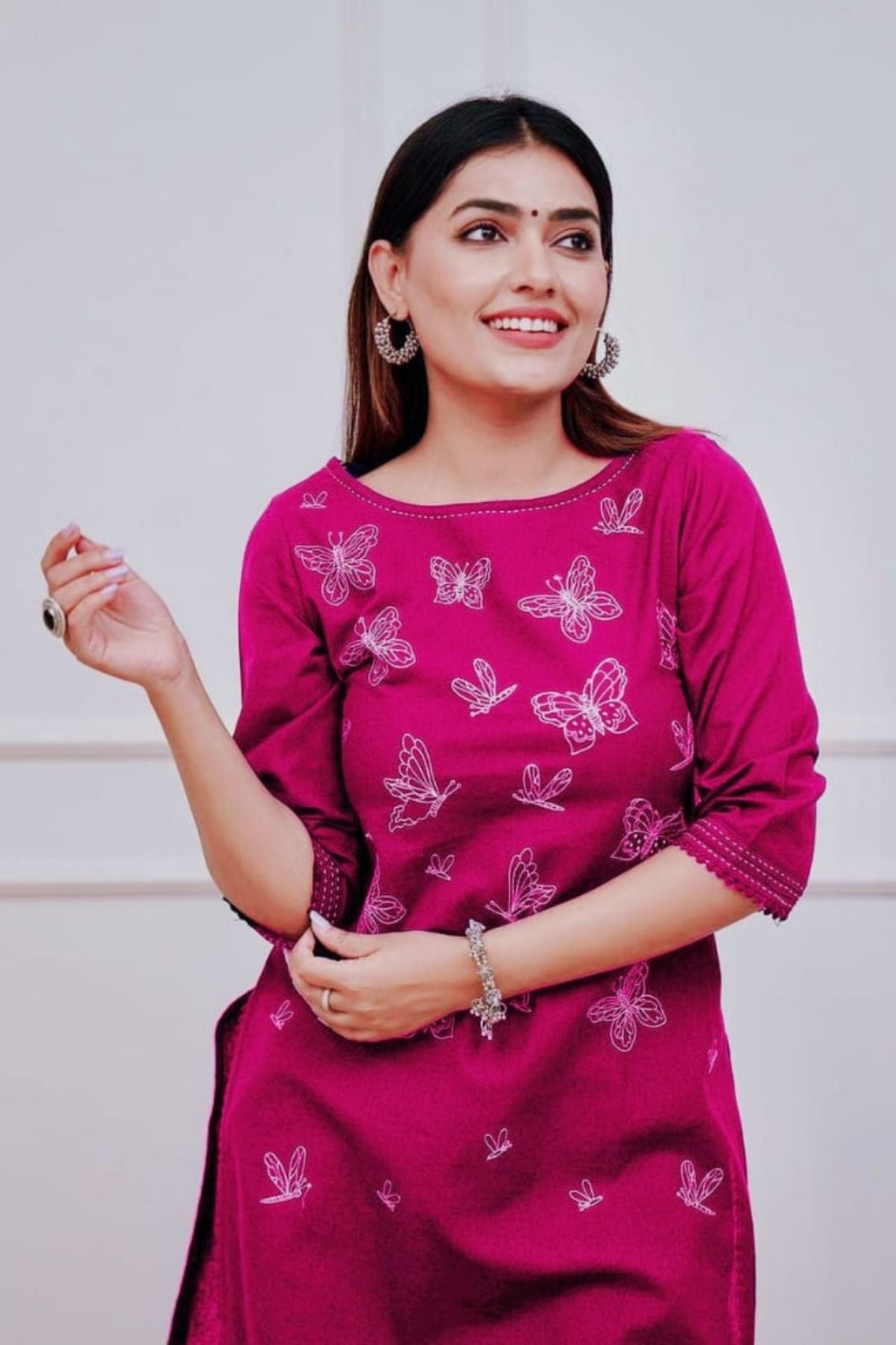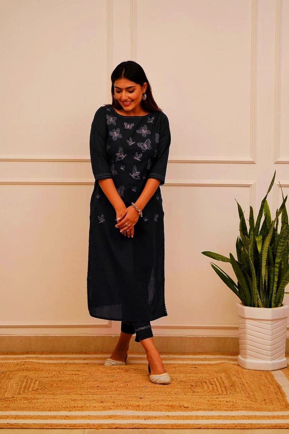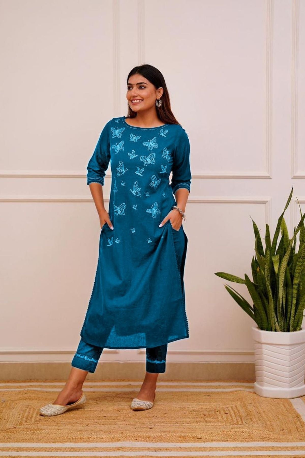 Upgrade your office wear wardrobe with this classy (teal blue, hot pink , black,) kurti pant with beautiful butterfly embroidery & lace work detailing for all day comfort and trendy look