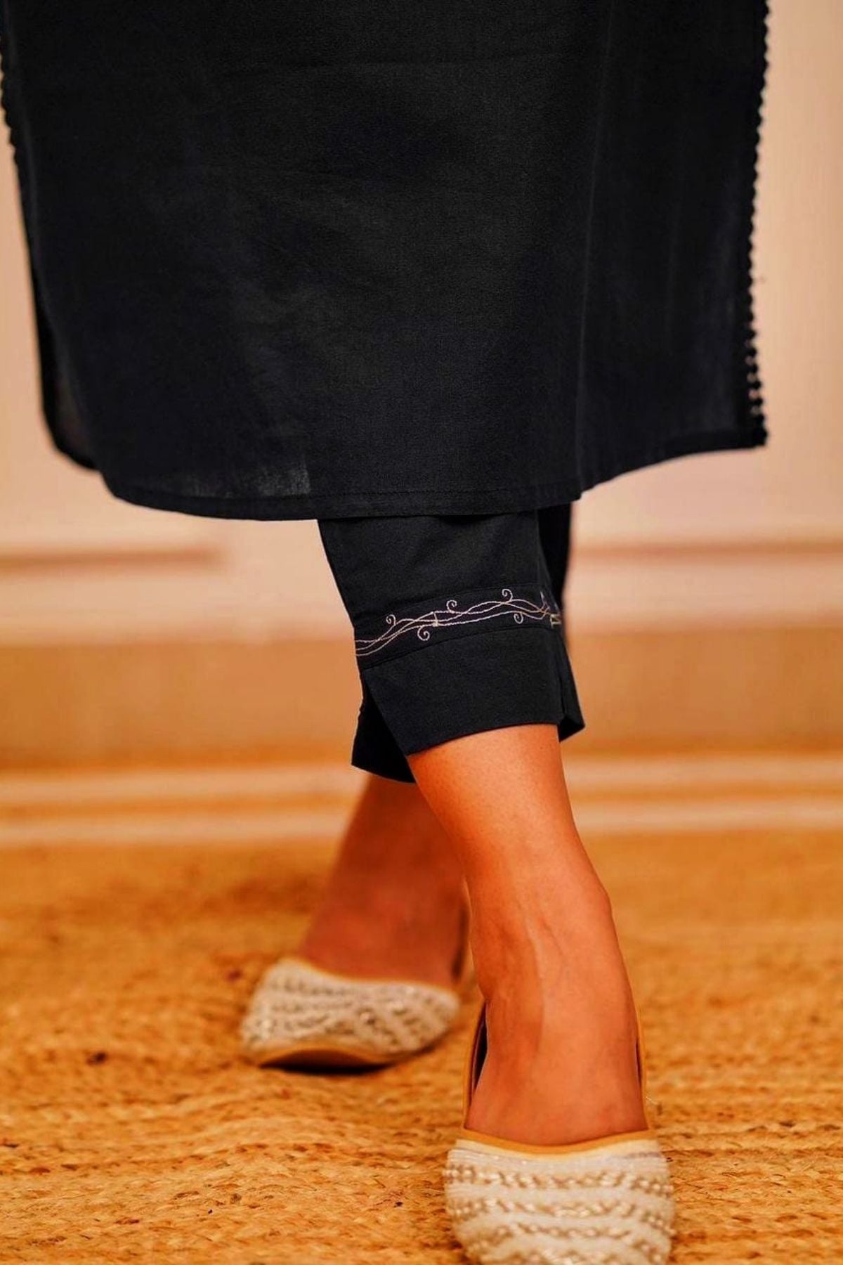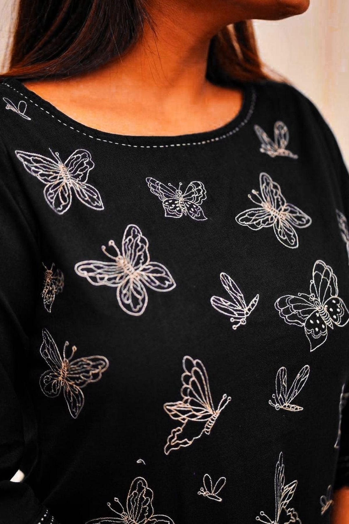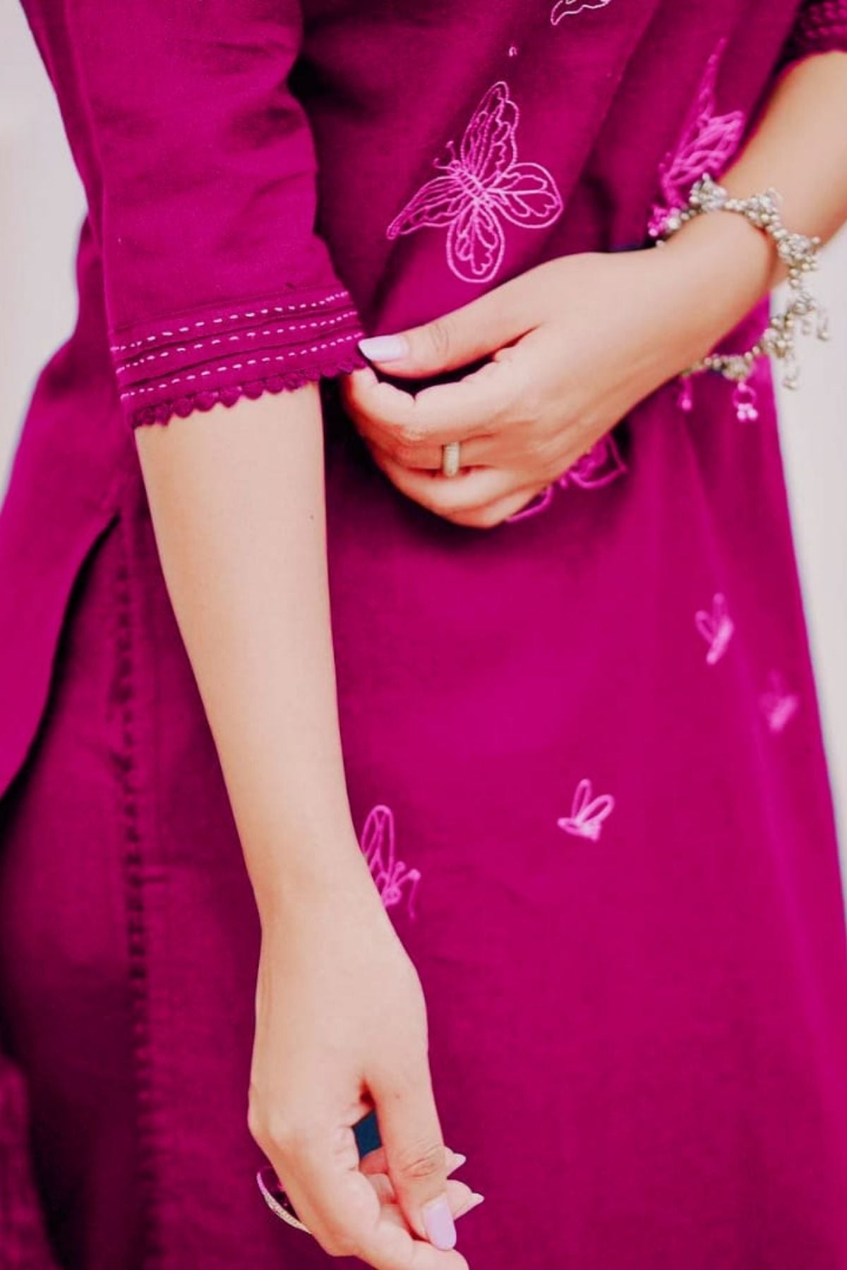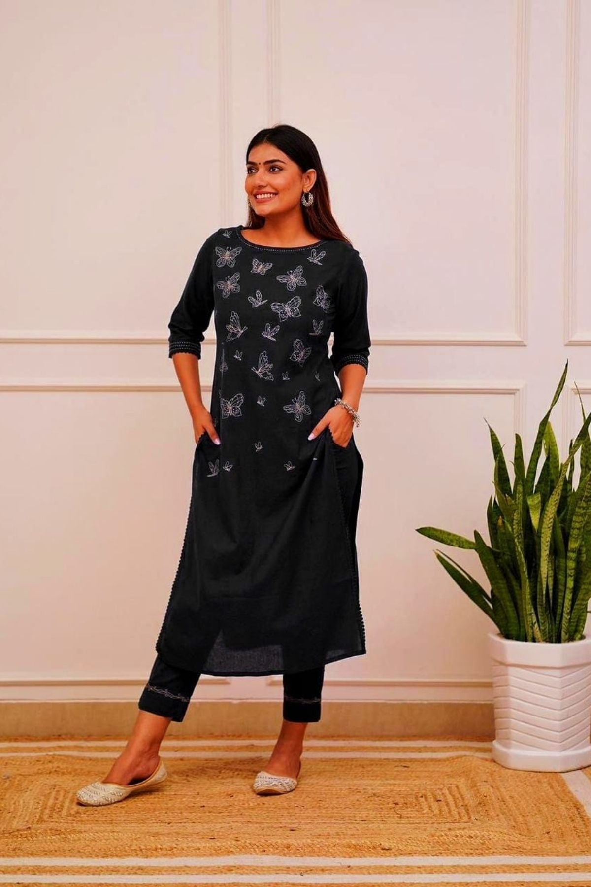 Upgrade your office wear wardrobe with this classy (teal blue, hot pink , black,) kurti pant with beautiful butterfly embroidery & lace work detailing for all day comfort and trendy look