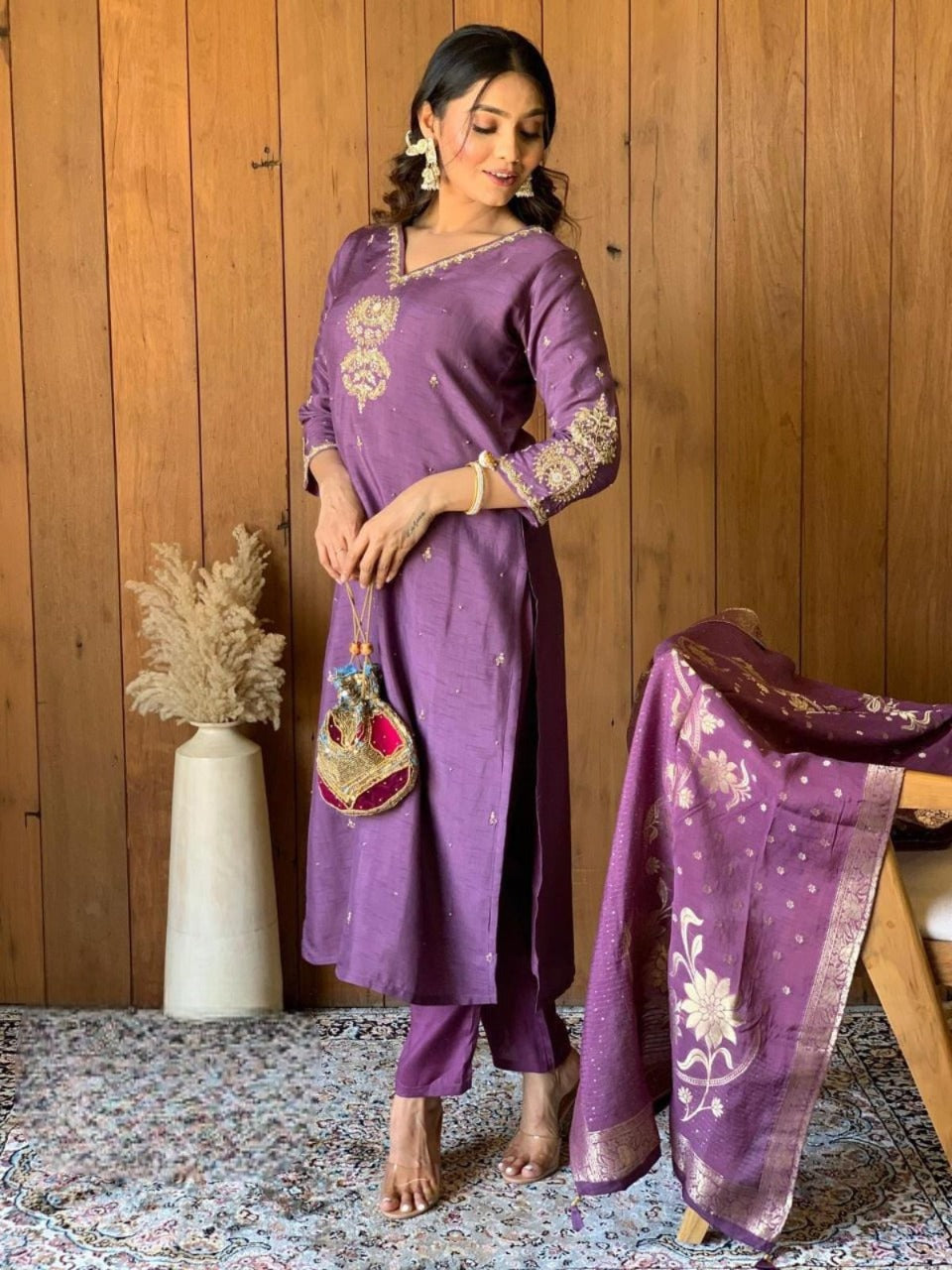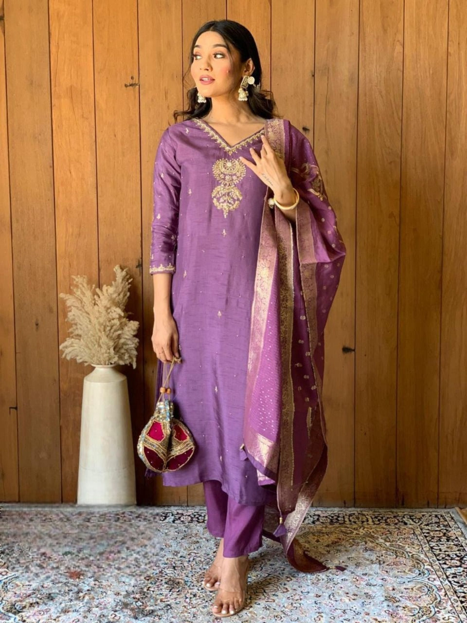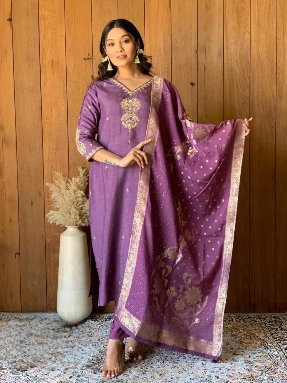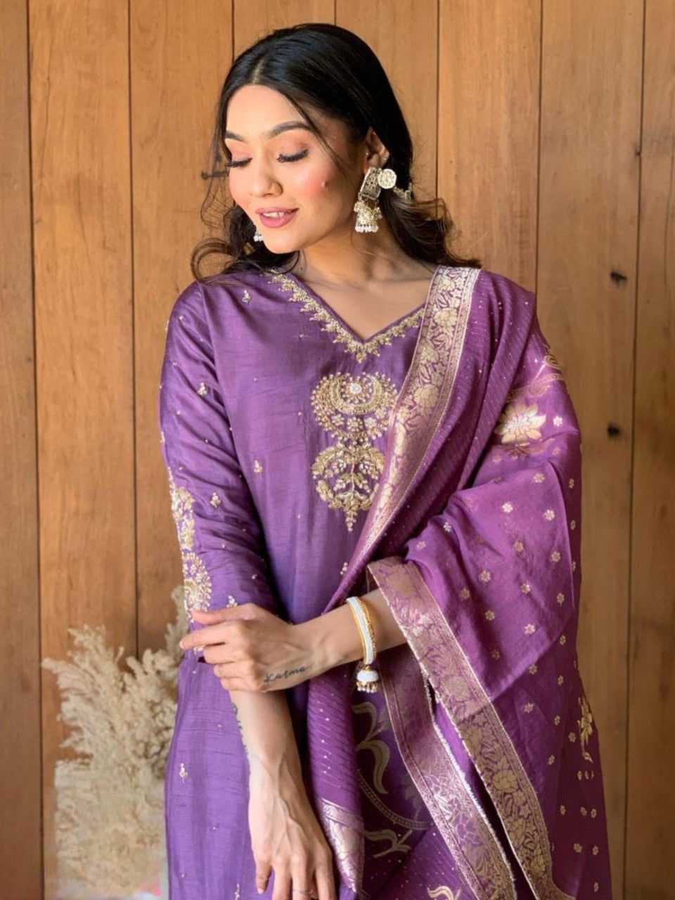 Beautiful Premium Dola silk kurti with work on yoke and sleeves paired with pant and premium Dola Silk Banarasi duppat