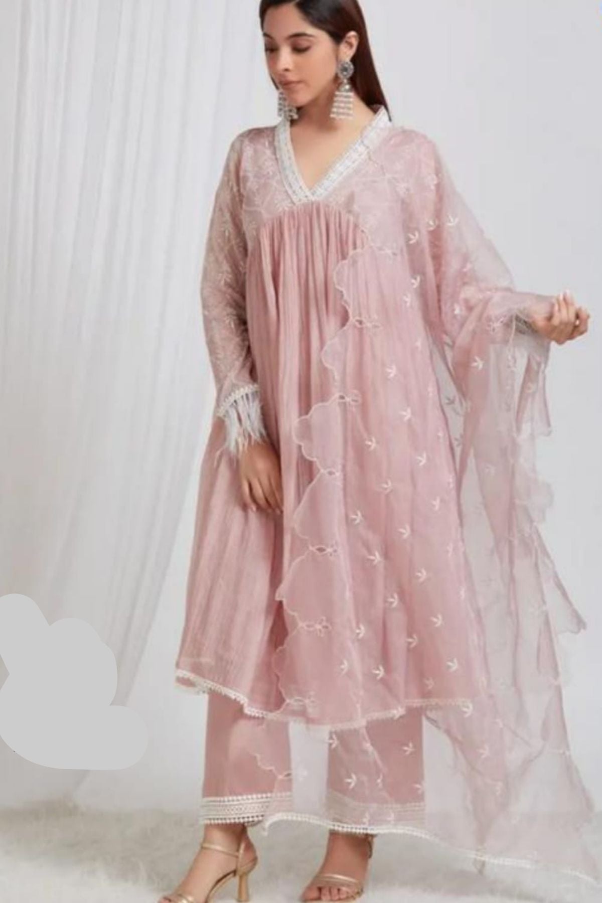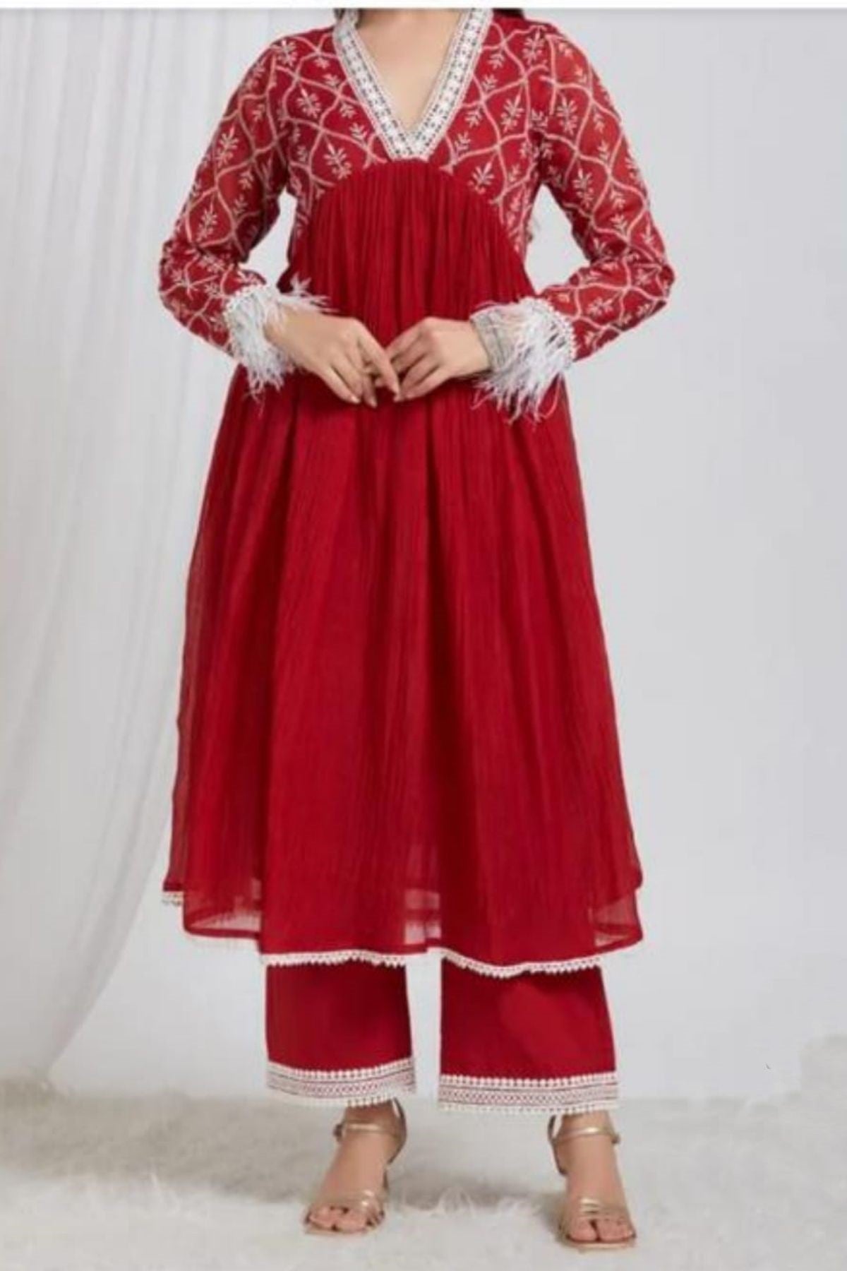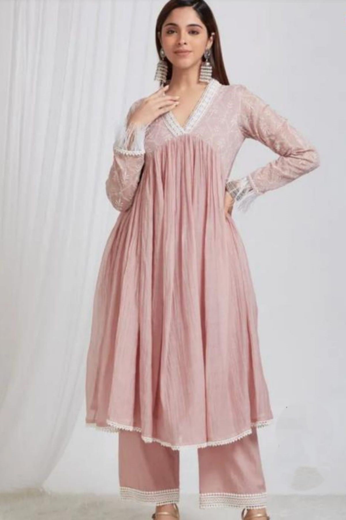 Pure viscose Chanderi Kurta with cotton Pants. Curated in premium quality silk chanderi fabric full sleeves, lace detailing at overall