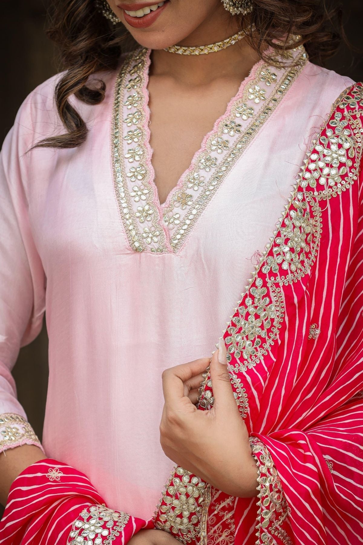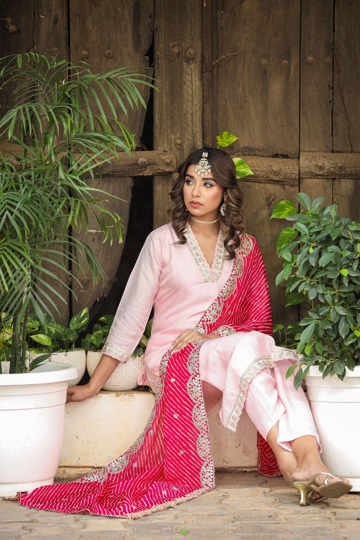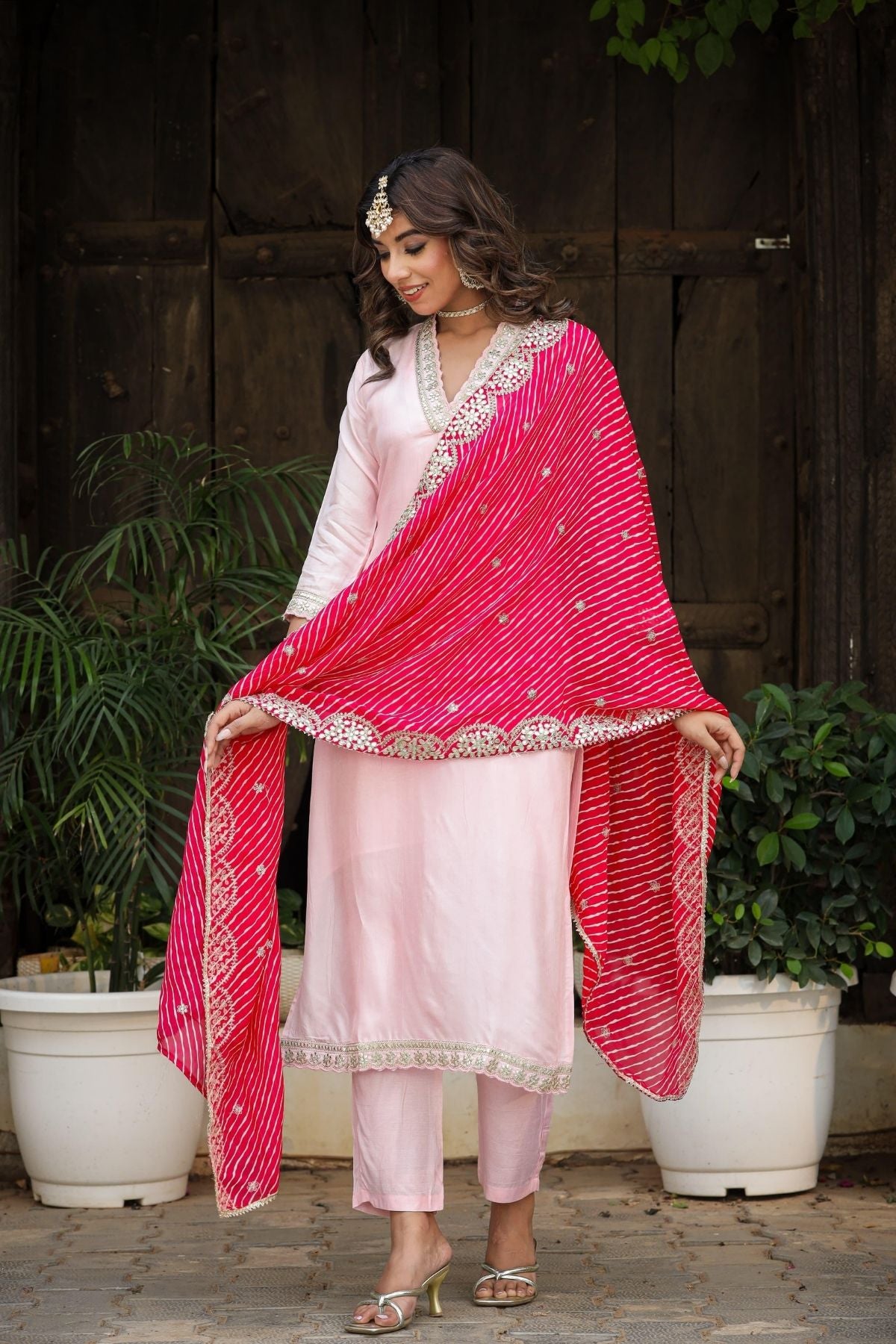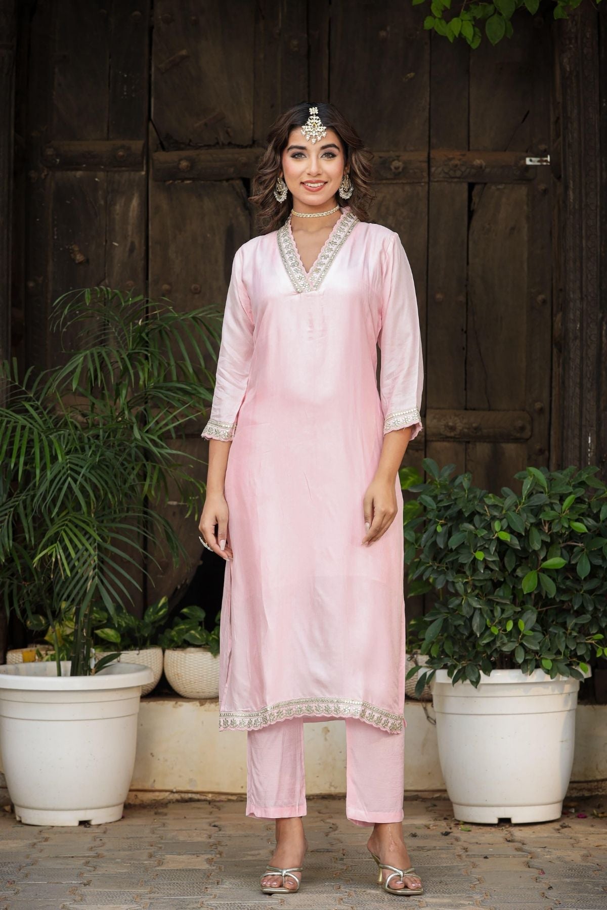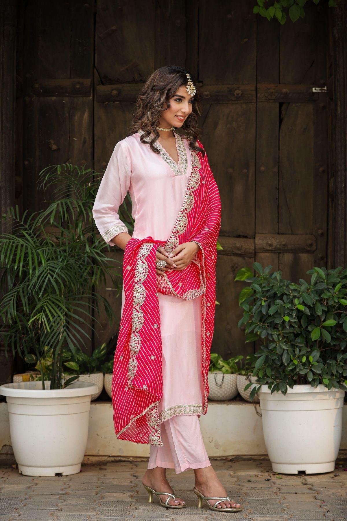 Beautiful chinnon kurti with hand work on yoke and sleeves paired with pant and pure chiffon duppata with work