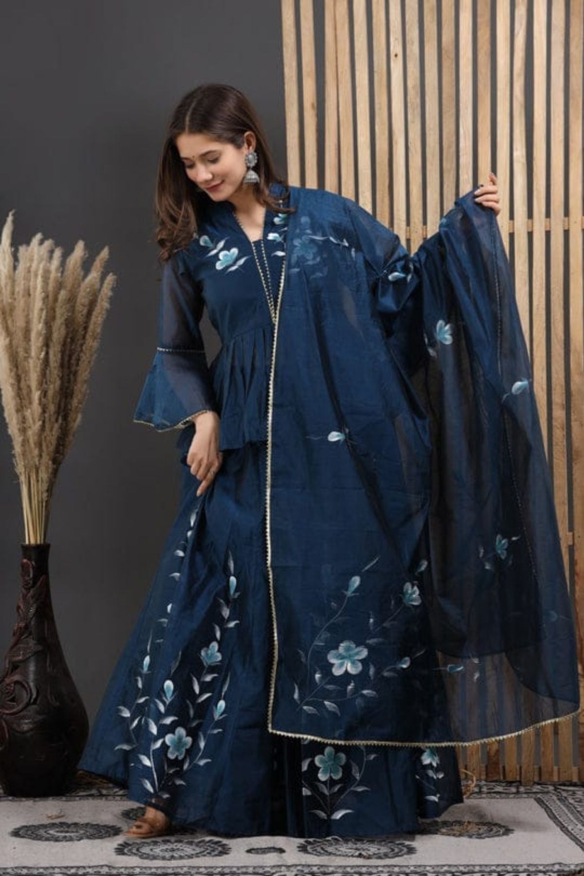 Manifest Yourself Into An Amazing Long-Lasting Impression In This Hand Painted Chanderi Lehenga Set. The Chanderi Blouse Comes With An All-Over Hand Paint, Bell Sleeves, A Sweetheart Neckline . The Chanderi Lehenga Comes With An All-Over Hand Paint And Frill Detailing. The Chanderi Dupatta