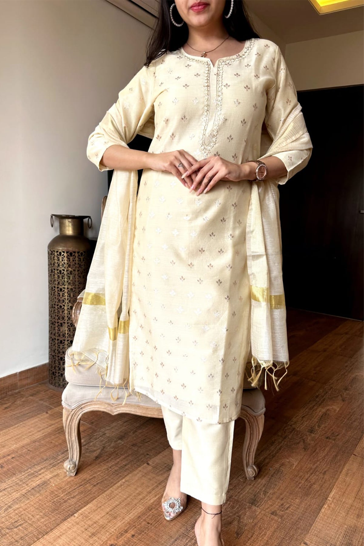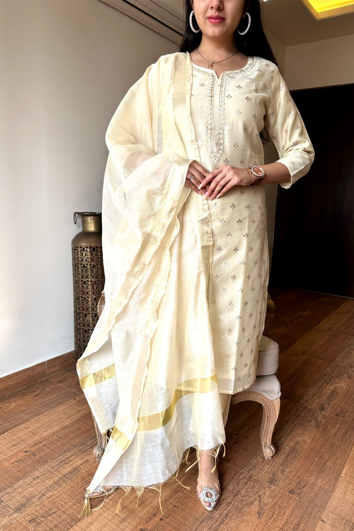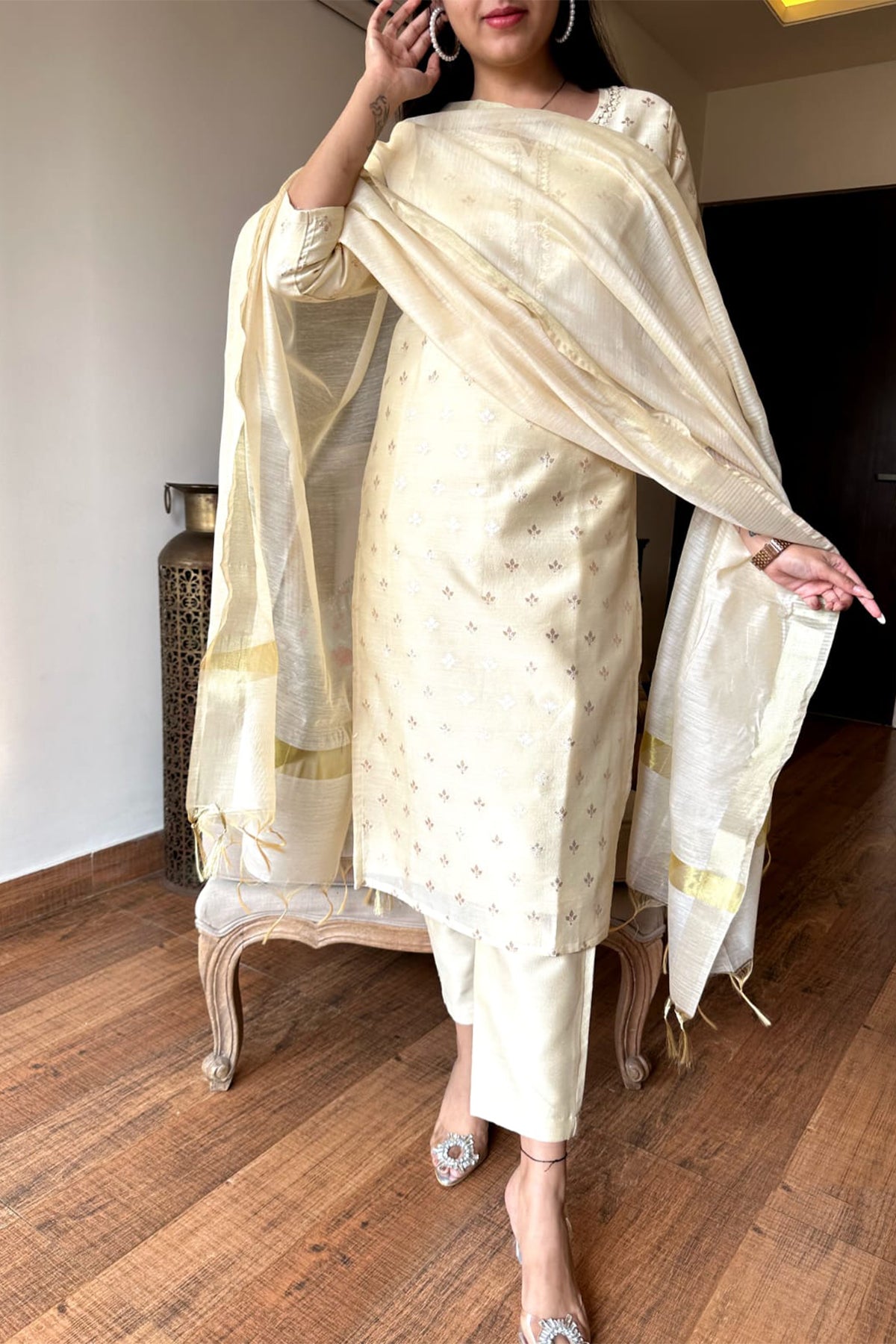 Top in pure modal chanderi self moonga zari work with cotton lining. Style with chanderi slik pant with lining and paired with self chanderi golden zari duppata.