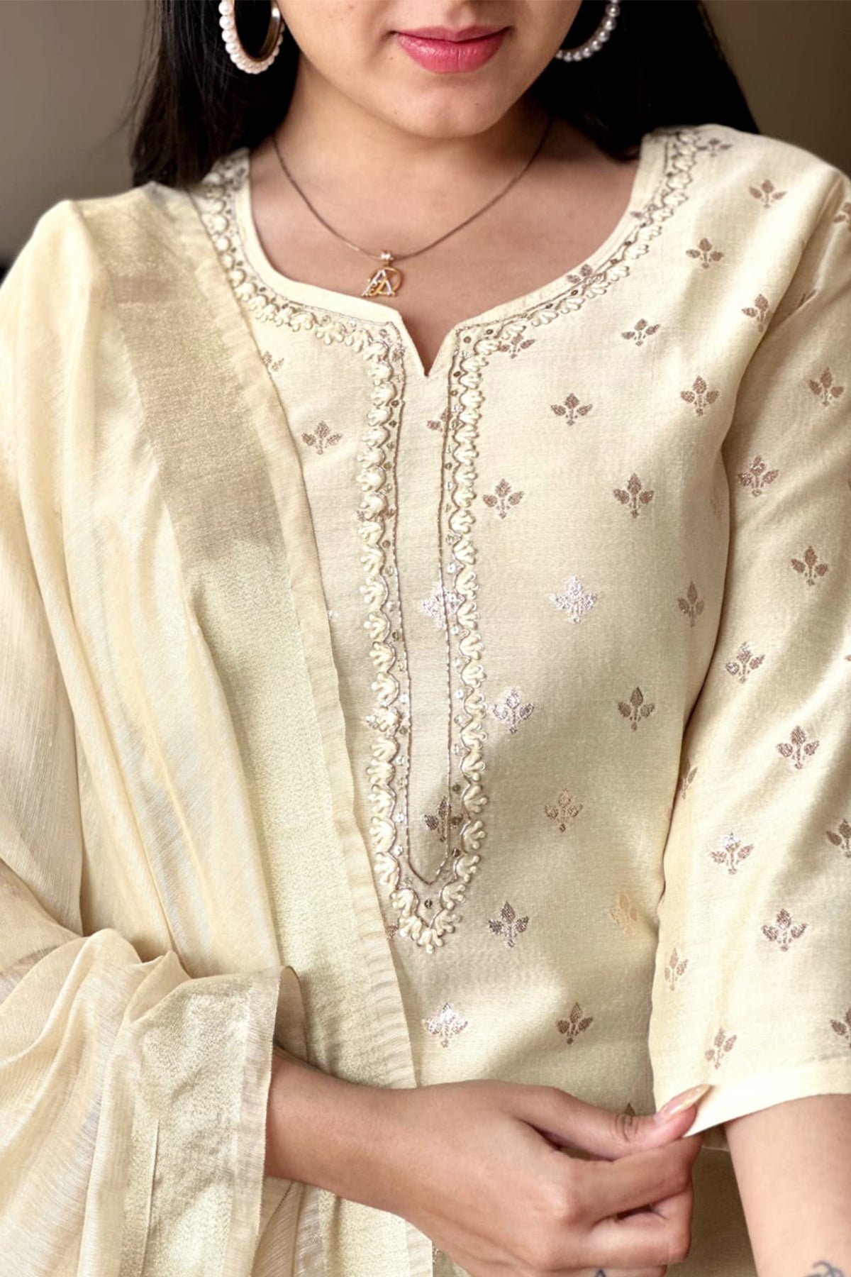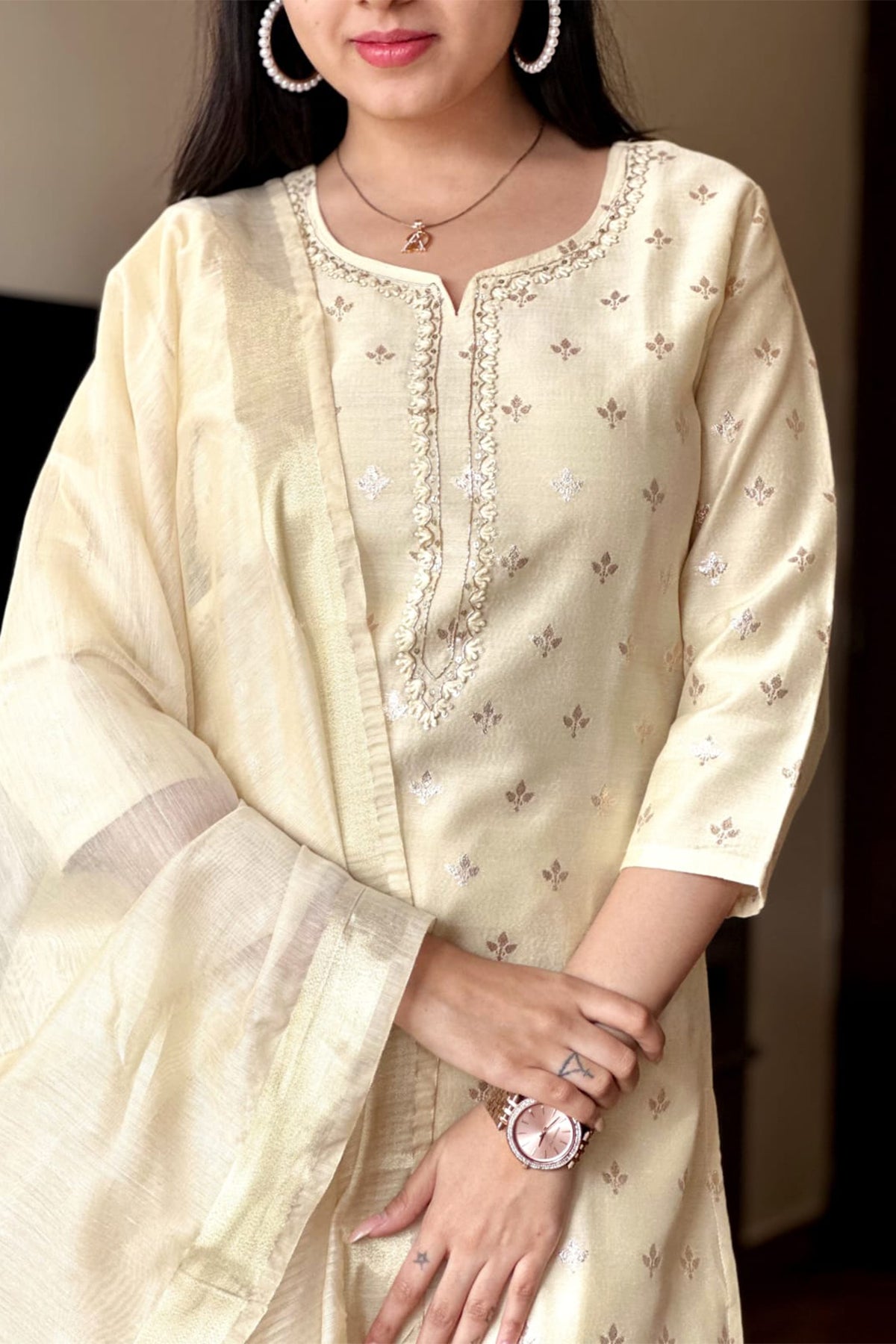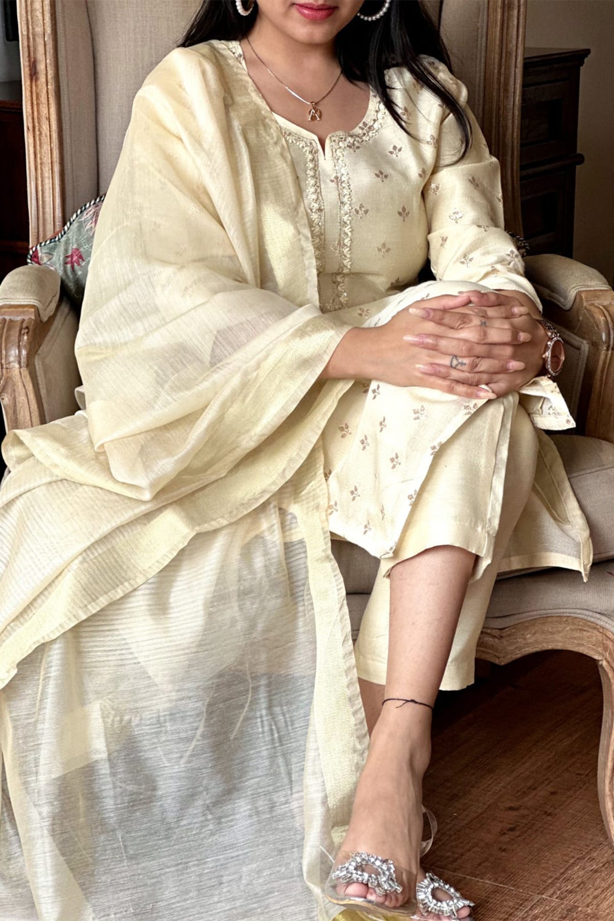 Top in pure modal chanderi self moonga zari work with cotton lining. Style with chanderi slik pant with lining and paired with self chanderi golden zari duppata.