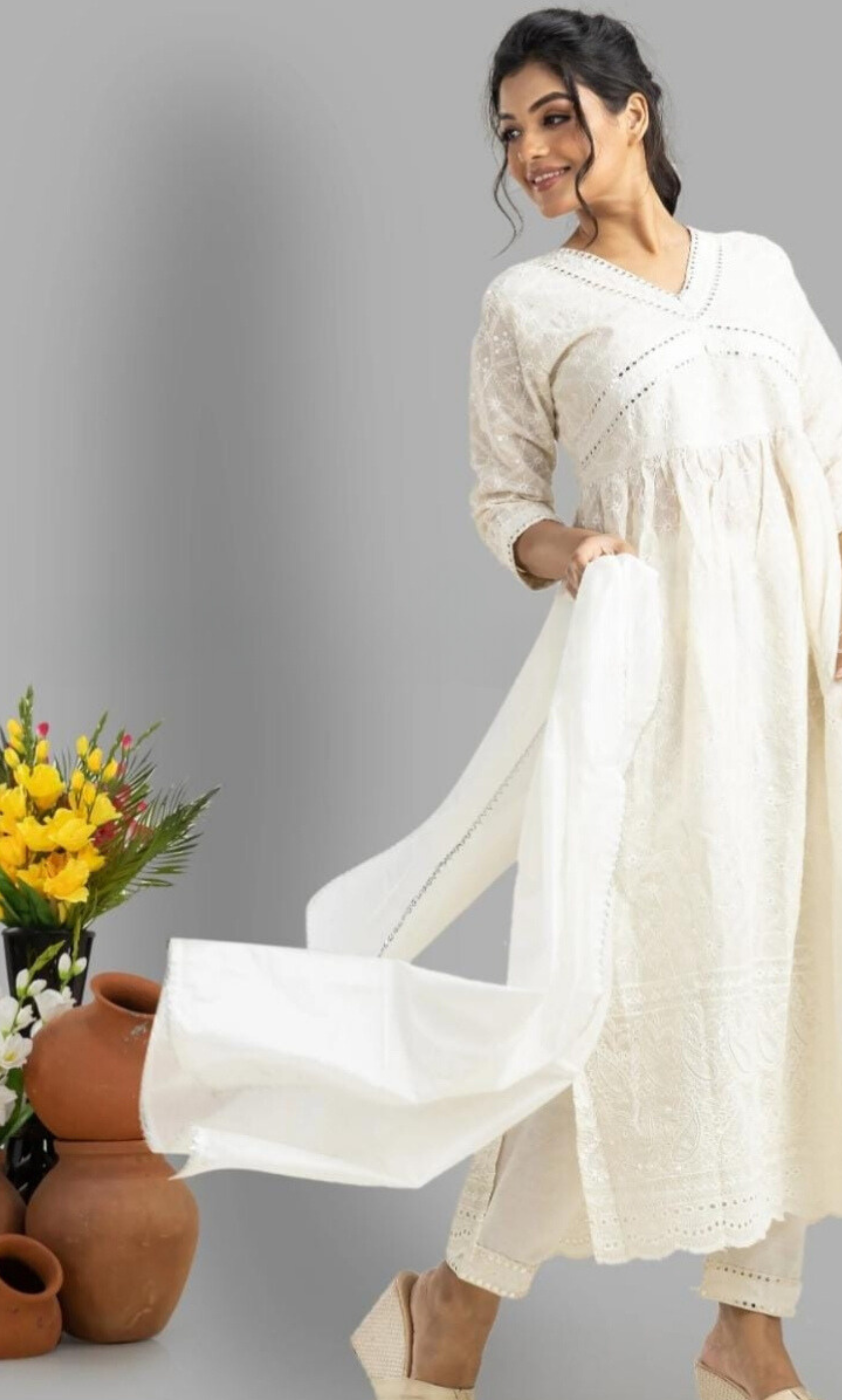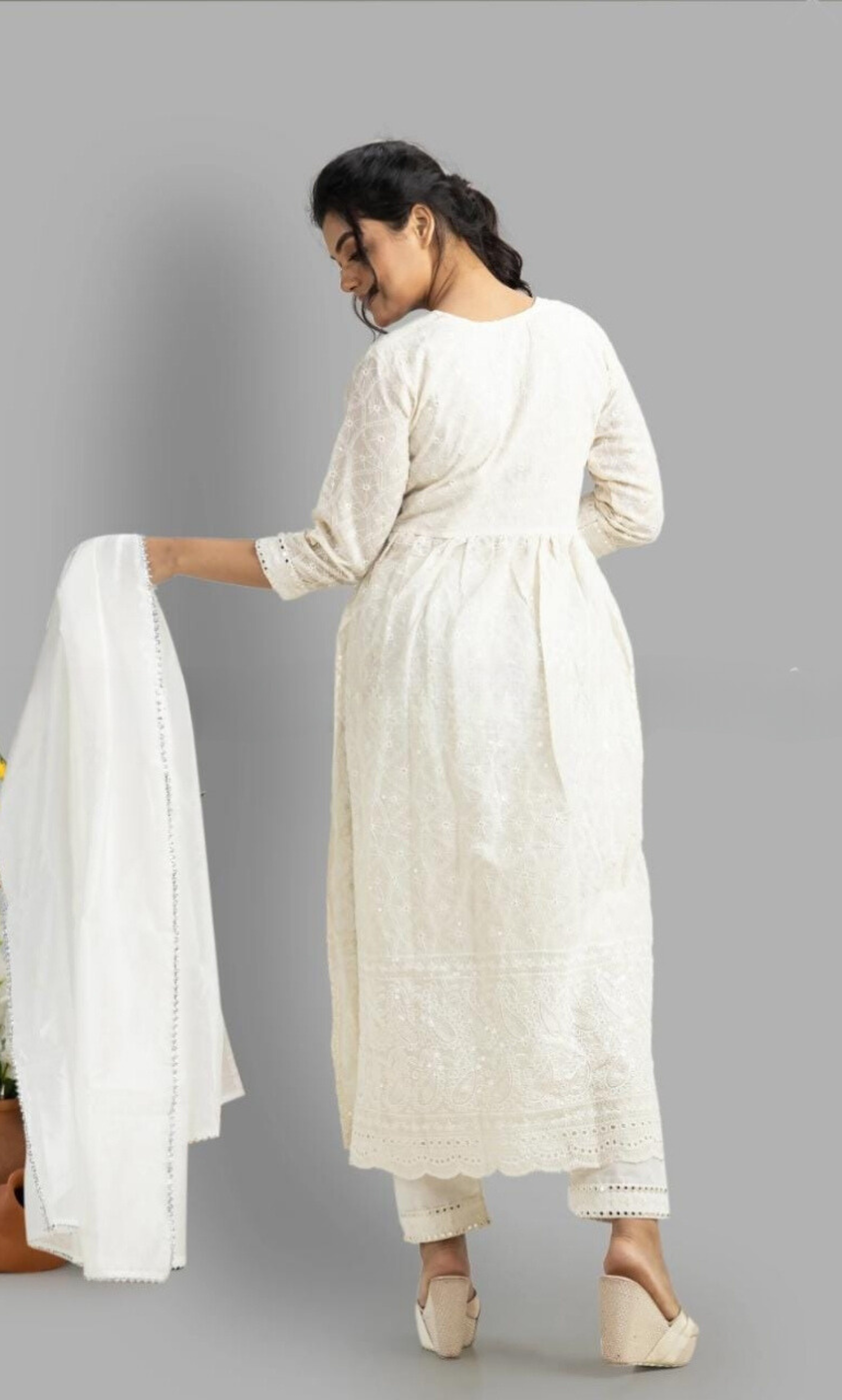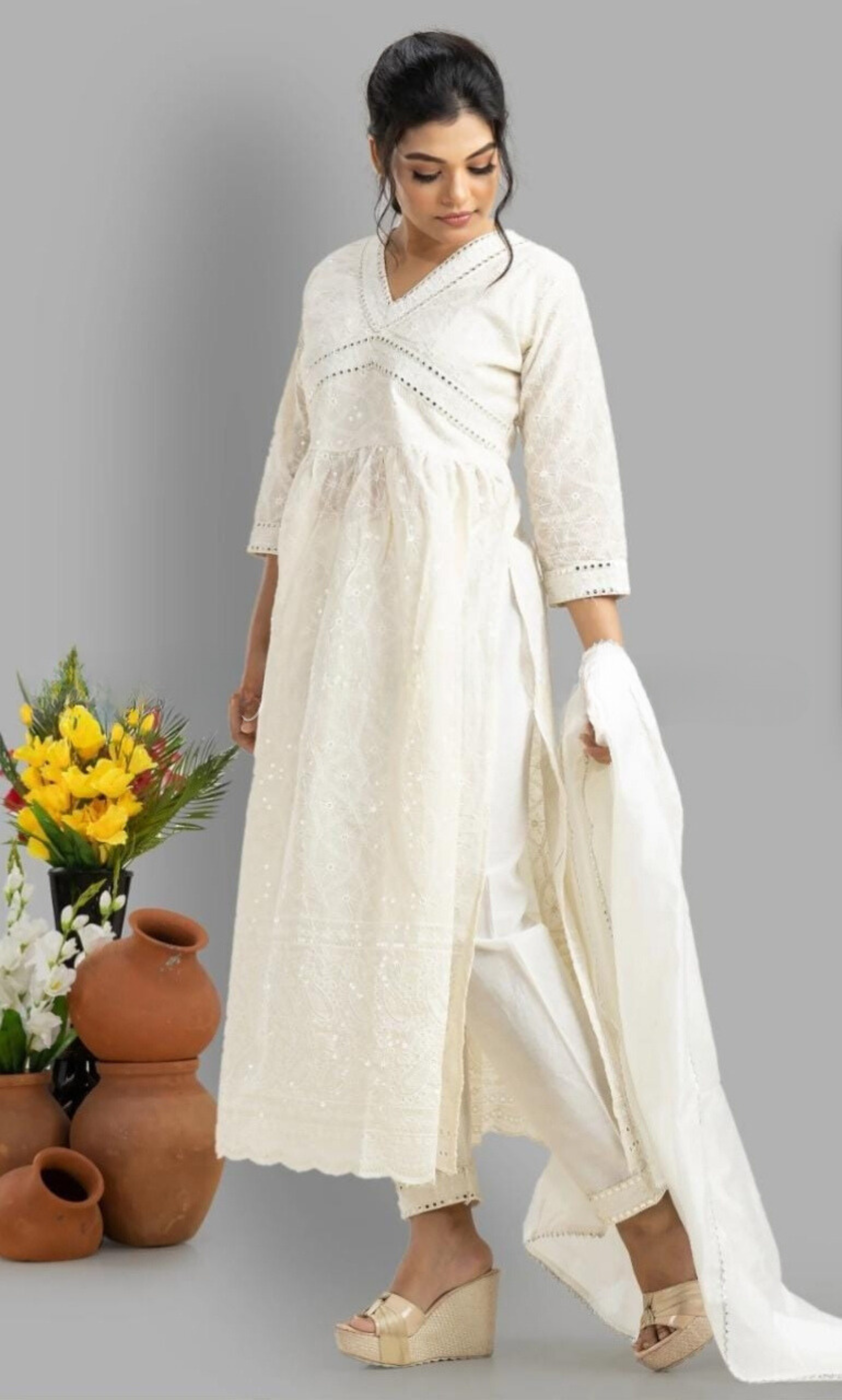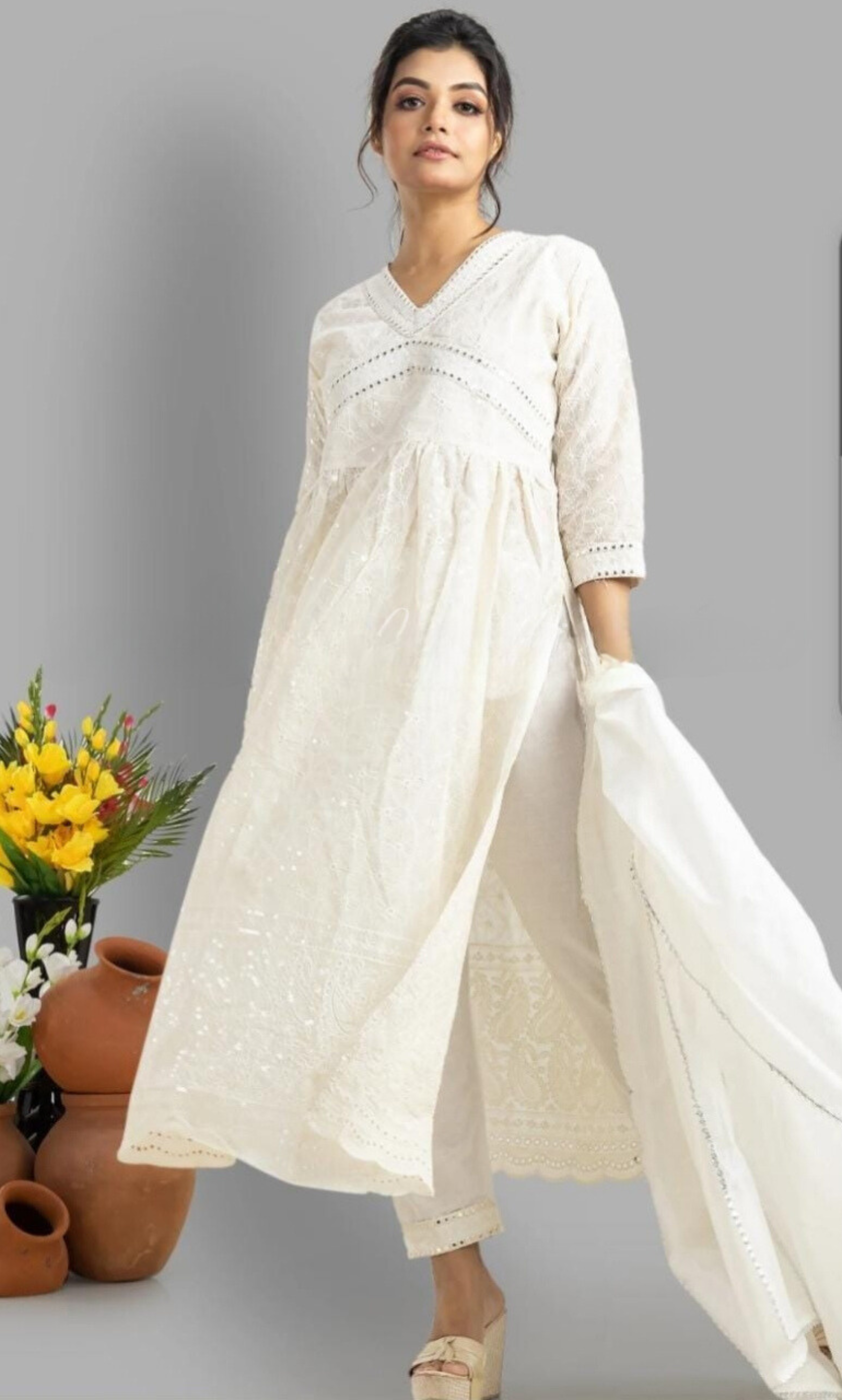 Pure cotton chickenkari embroidery with nyra cut kurti ( lining attached) with cotton pants. Beautiful mirror embroidery lace with chanderi dupptta with bijiya lace for all the beautiful ladies.