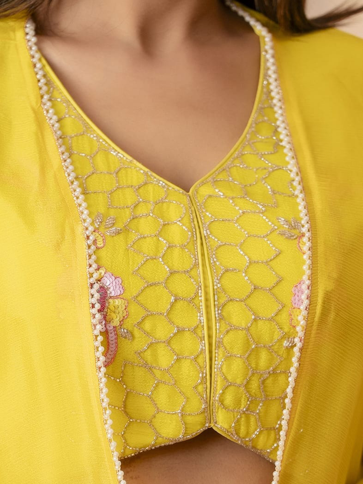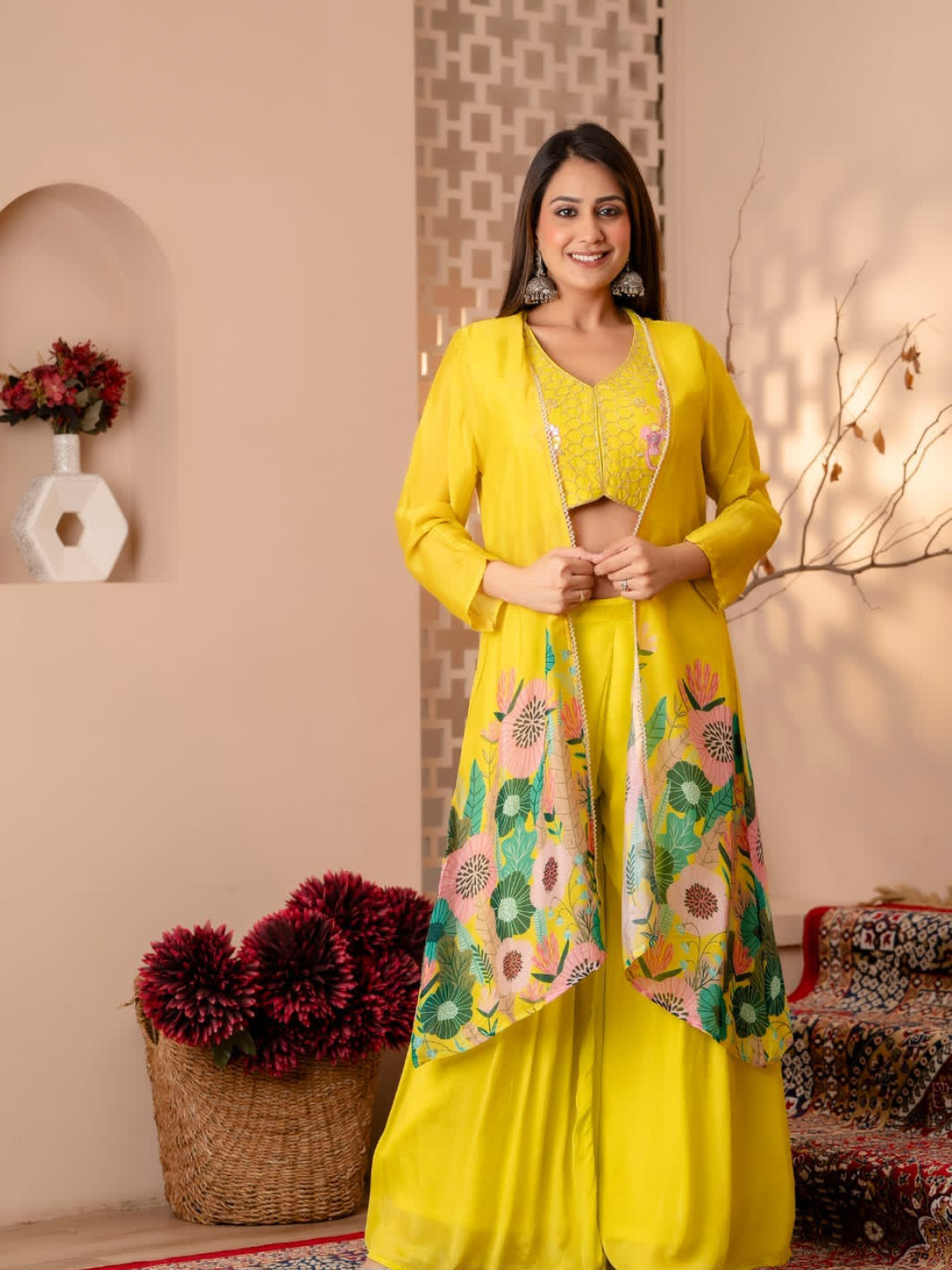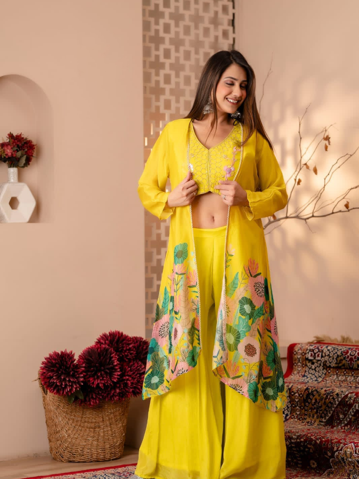 Pure chinnon three piece dress with heavy handworked blouse and flared palazzo ( lining attached)with printed shrug ..