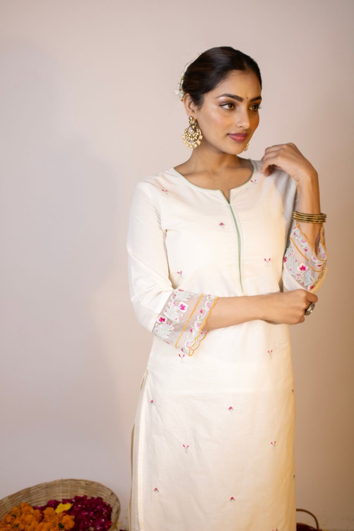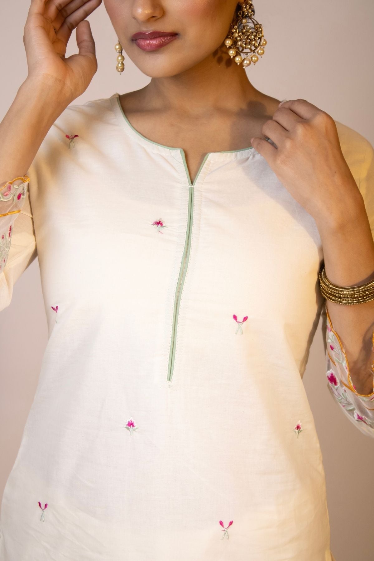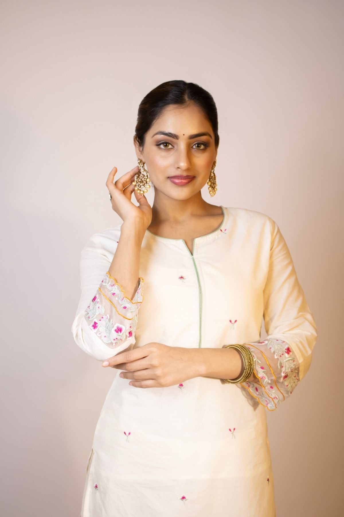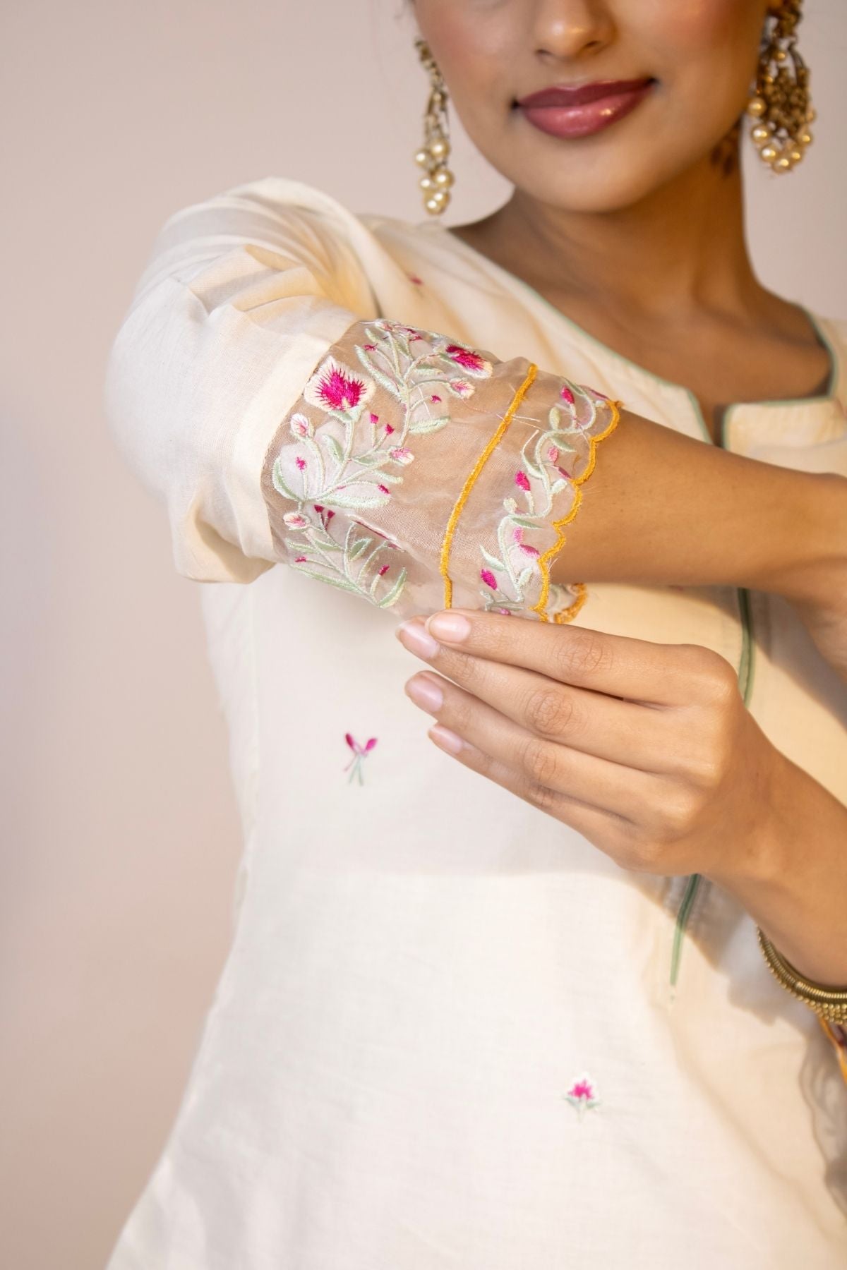 A traditional yet stylish kurta with colourful threadwork hand embroidery. Organza fabric at sleeves and pant with embroidery.