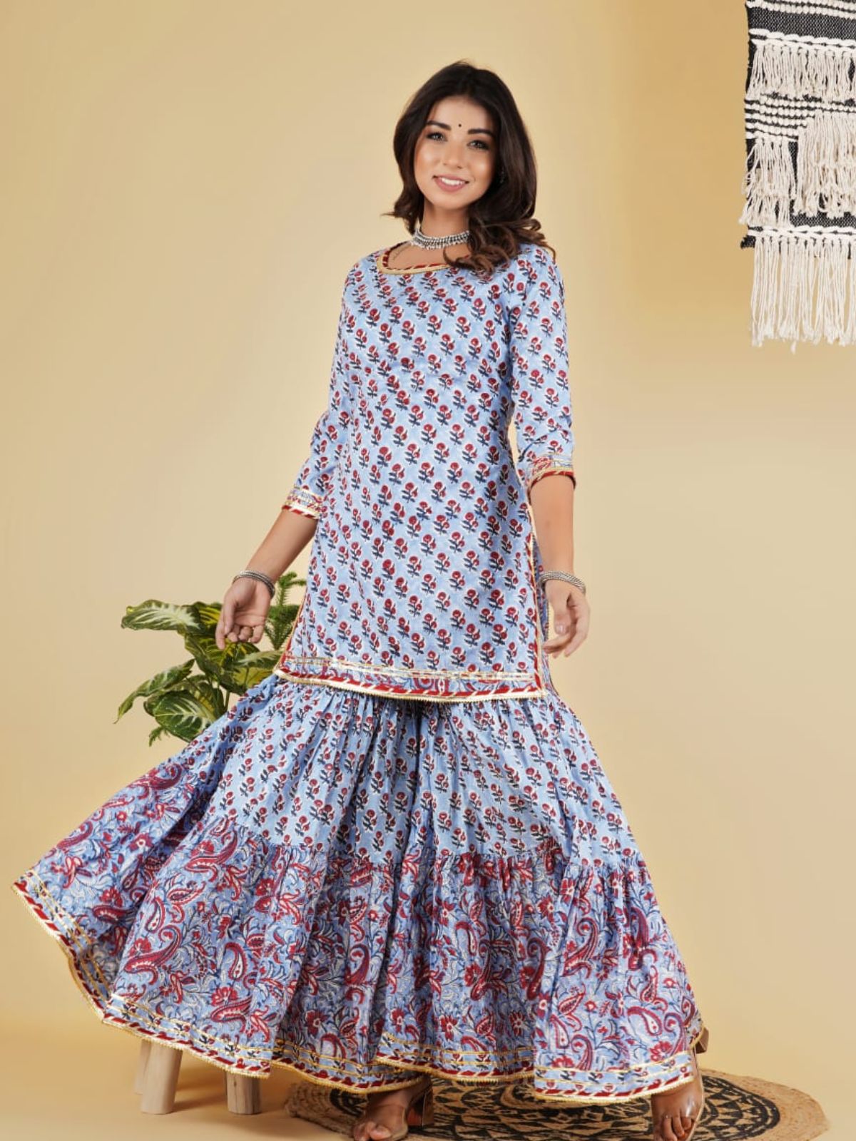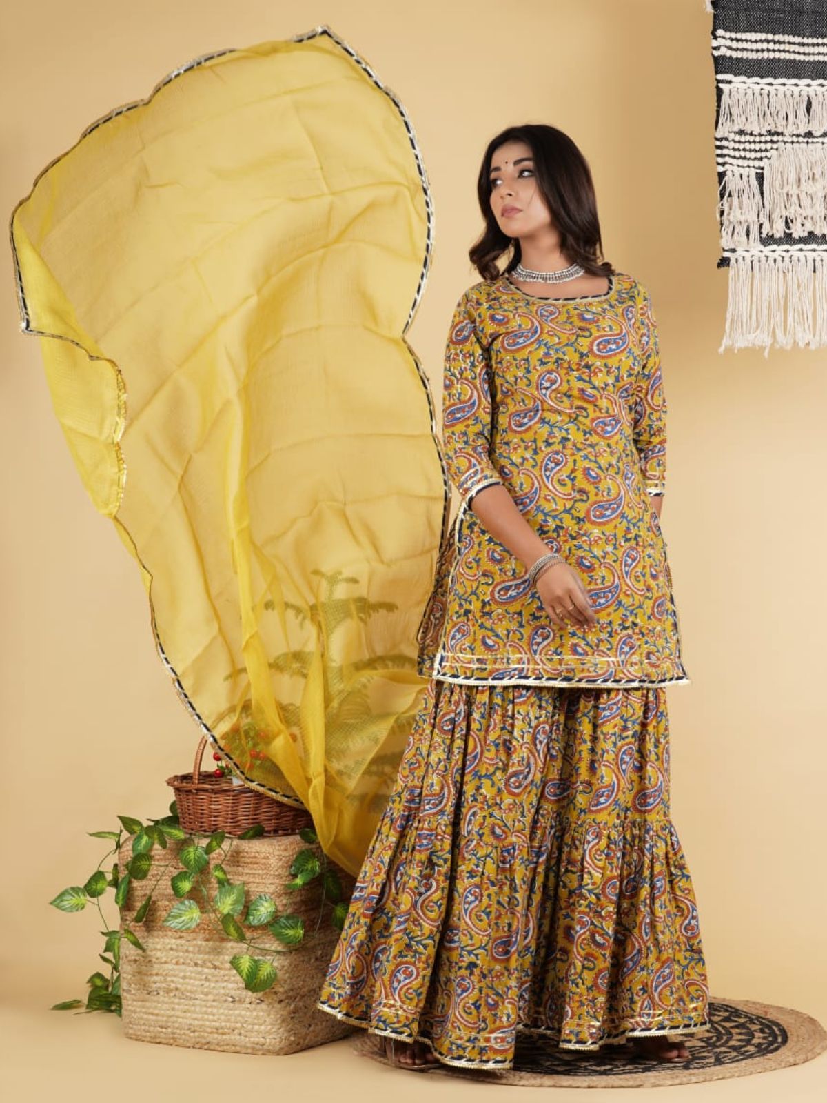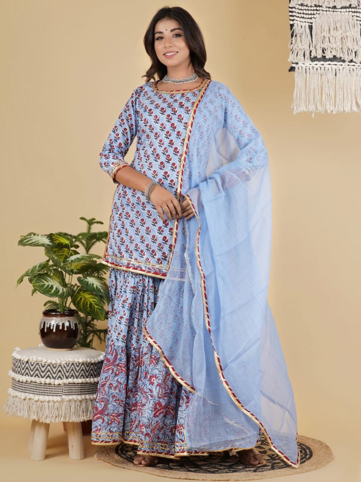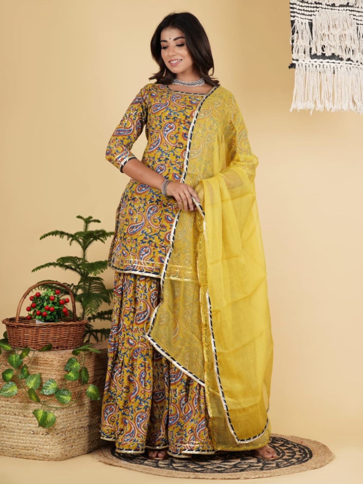 Traditional Hand block print cotton short kurta with tier gharara in a delicate colour palate with Kota doria dupatta with heavy tassel detailing.