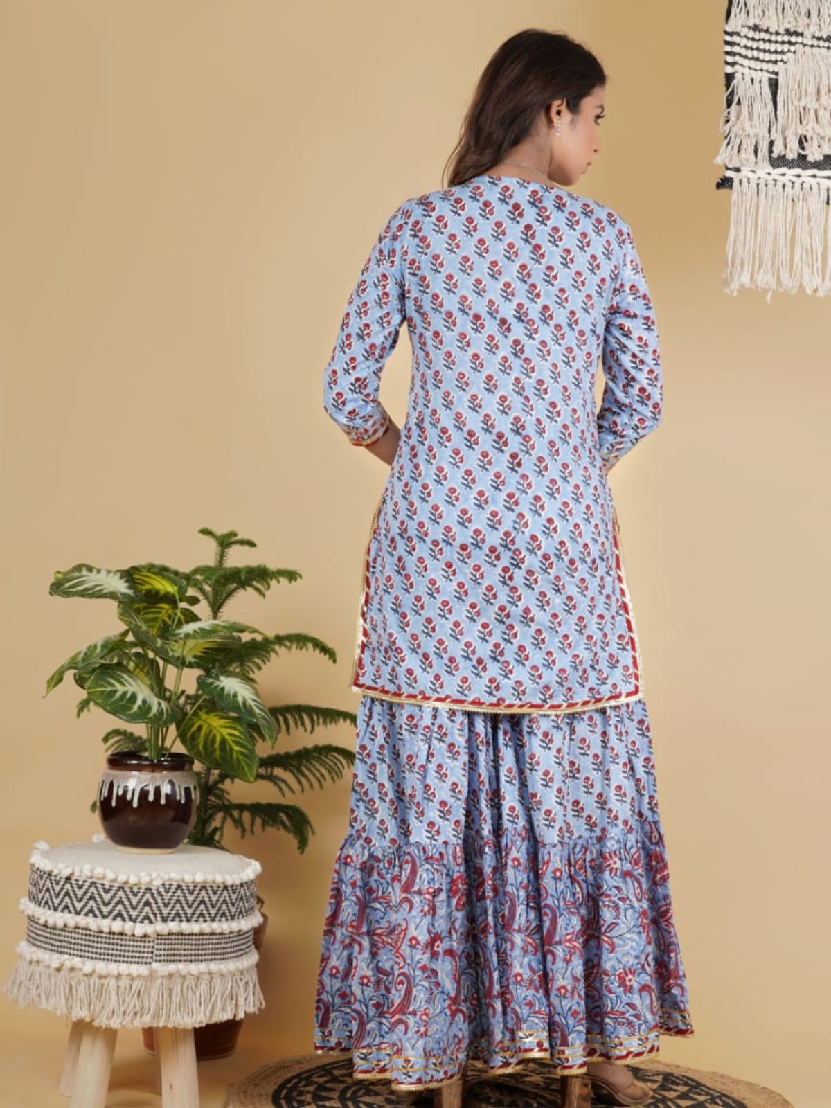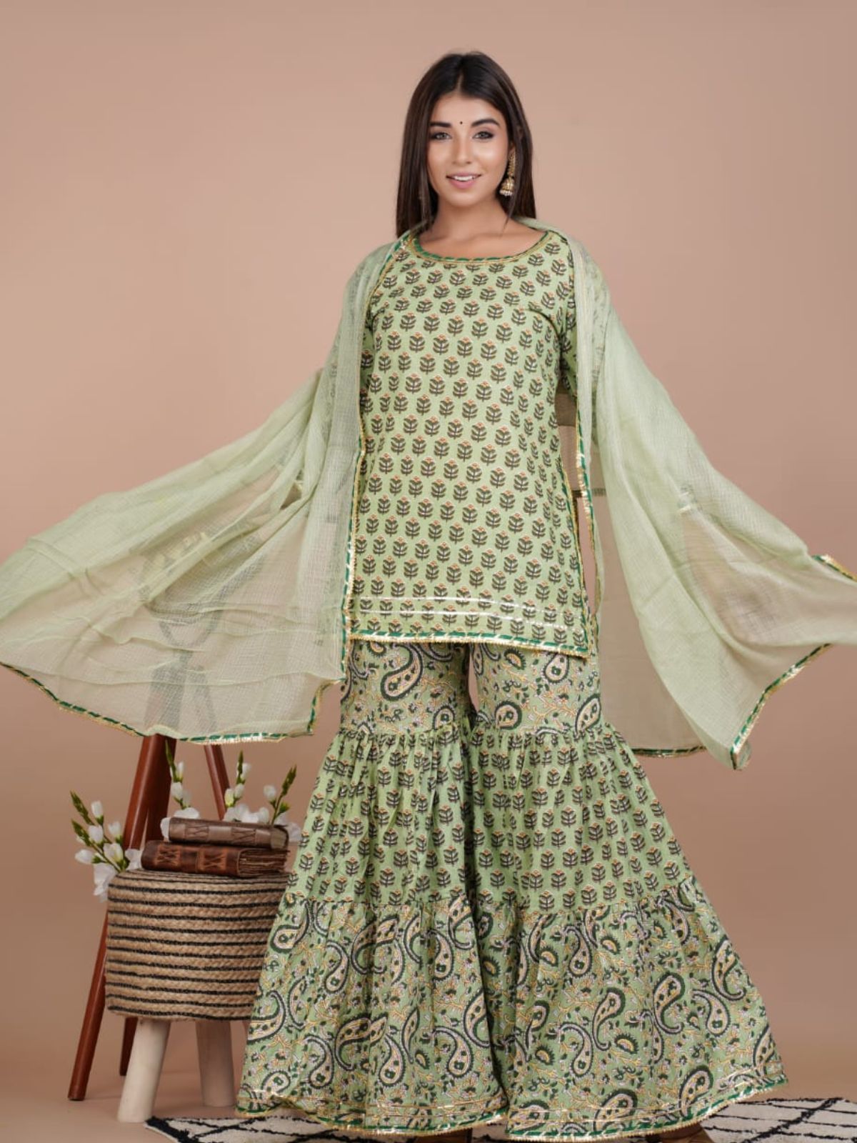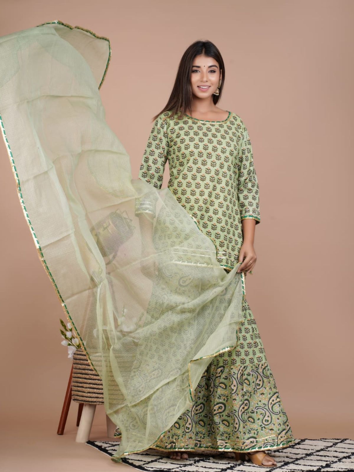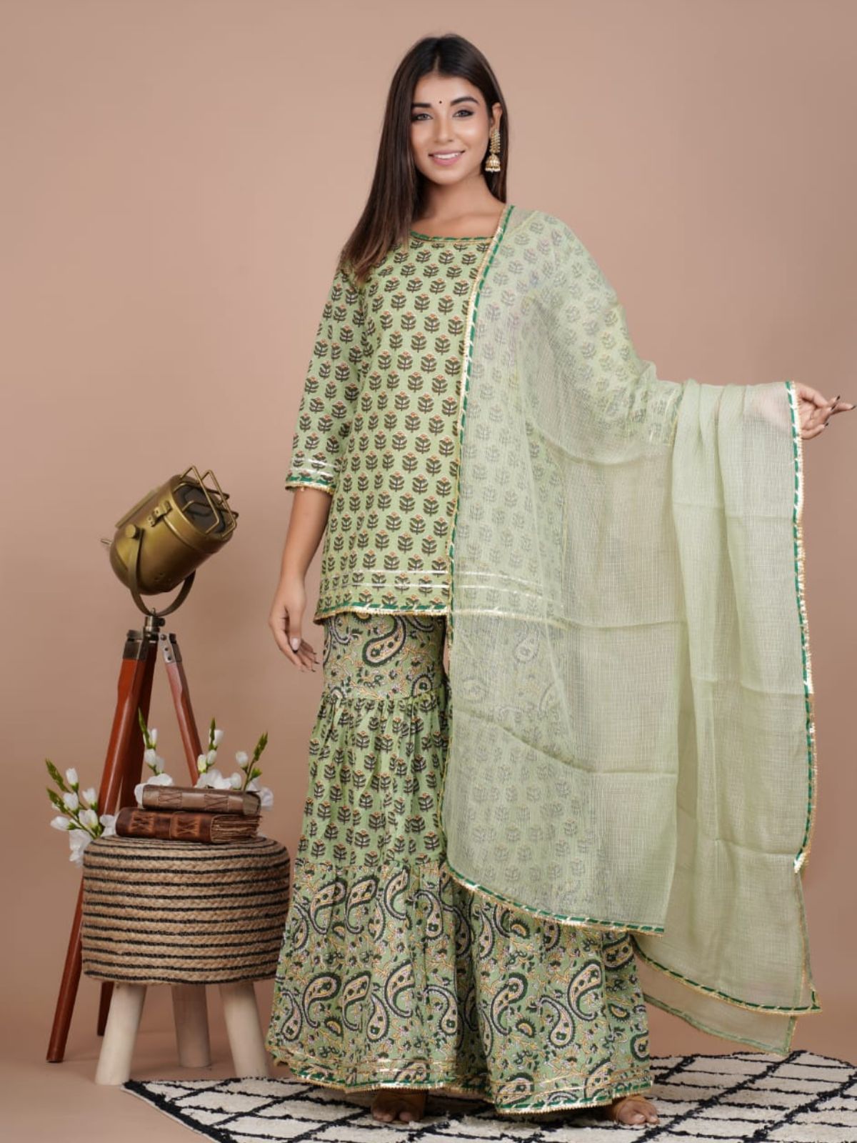 Traditional Hand block print cotton short kurta with tier gharara in a delicate colour palate with Kota doria dupatta with heavy tassel detailing.