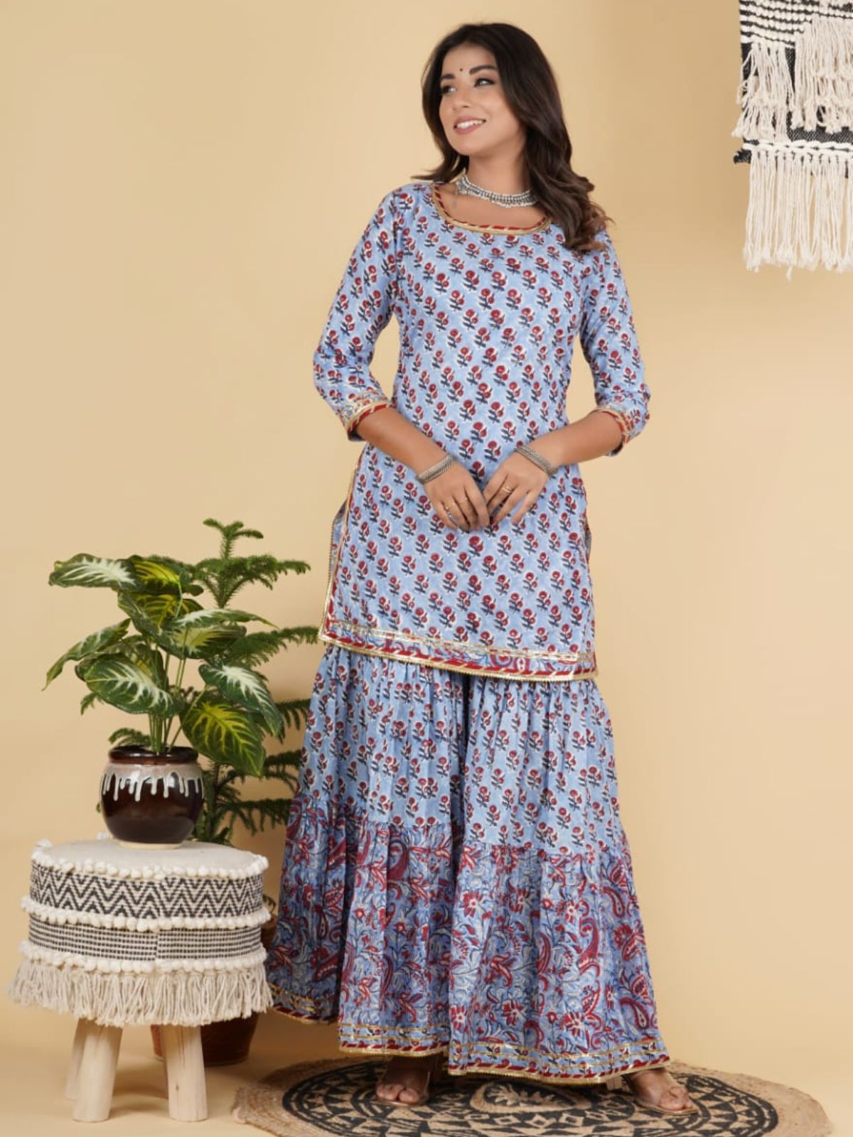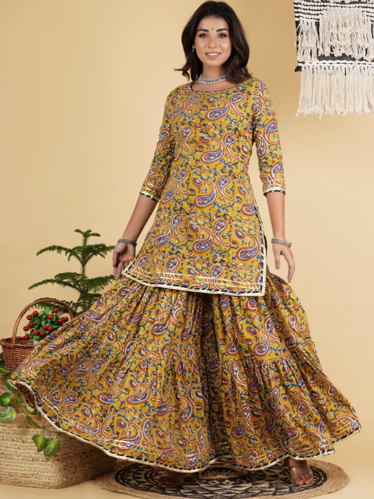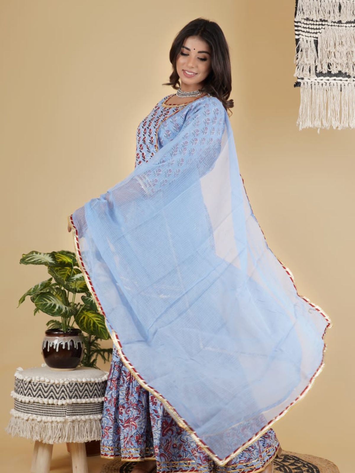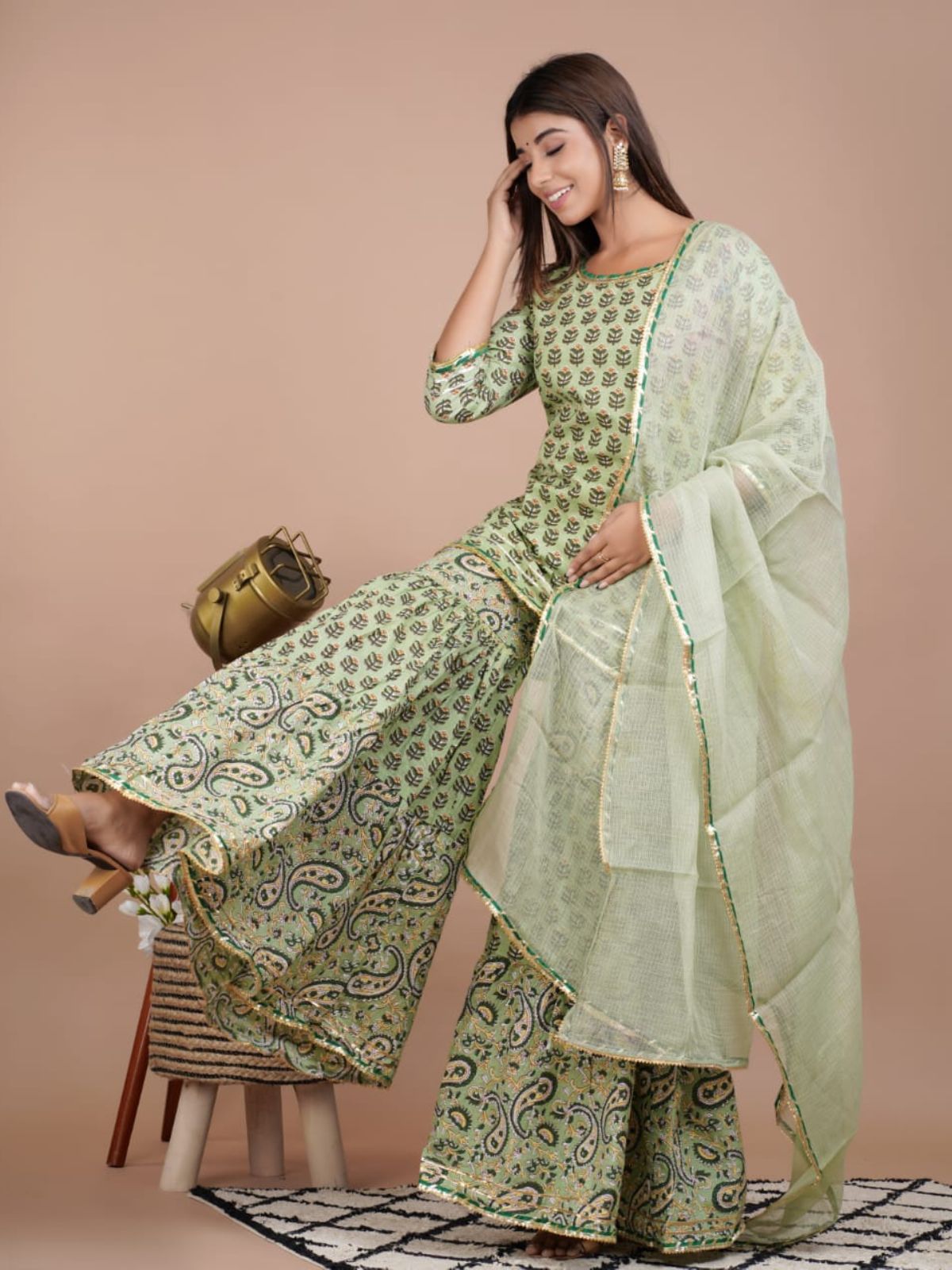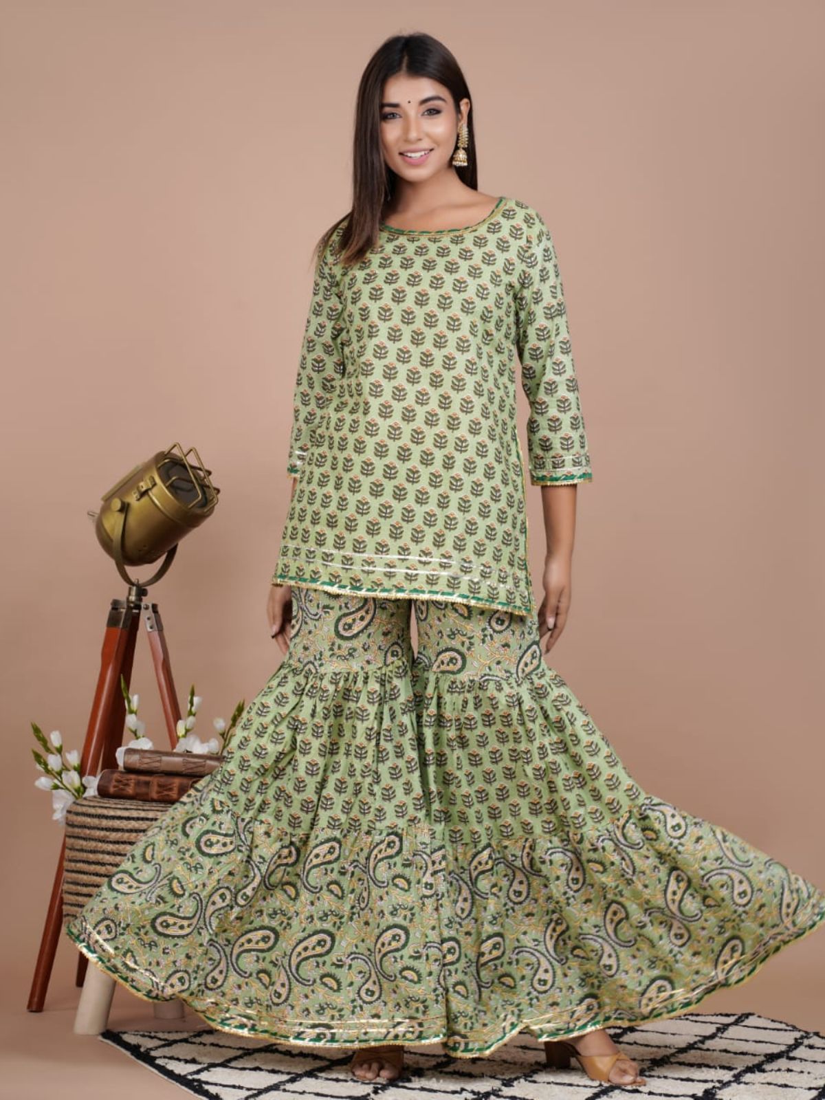 Traditional Hand block print cotton short kurta with tier gharara in a delicate colour palate with Kota doria dupatta with heavy tassel detailing.