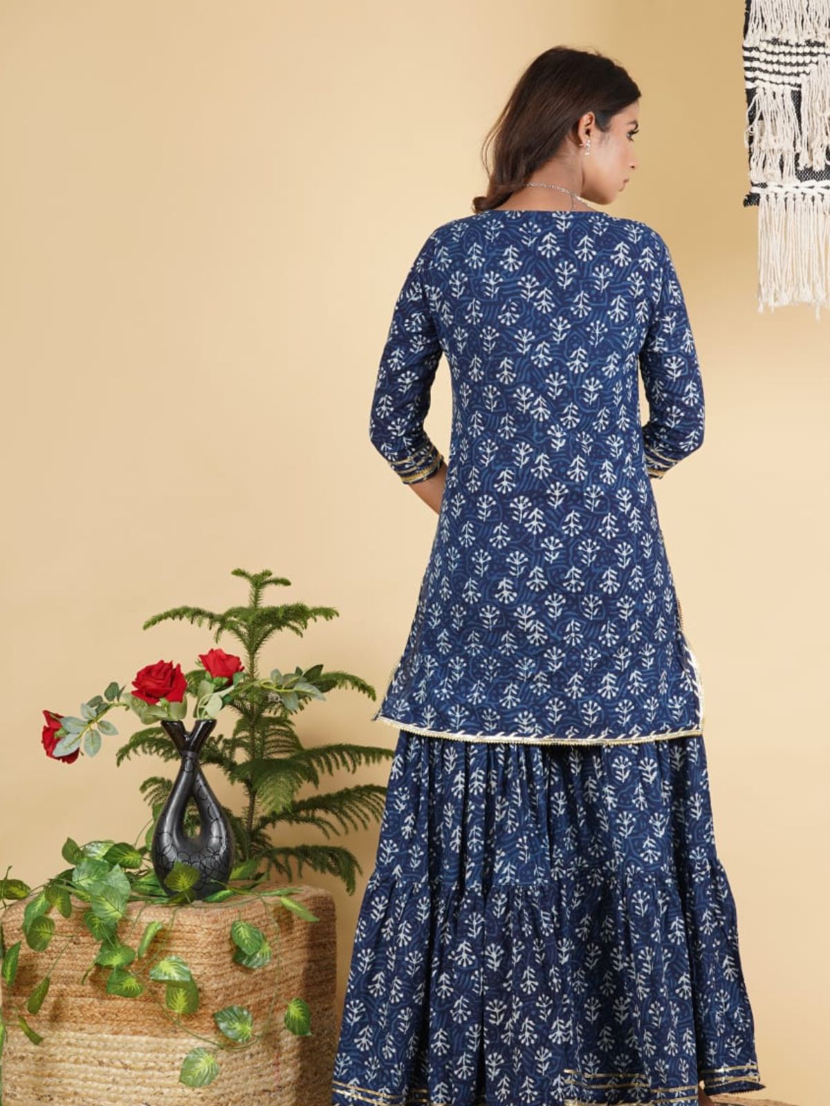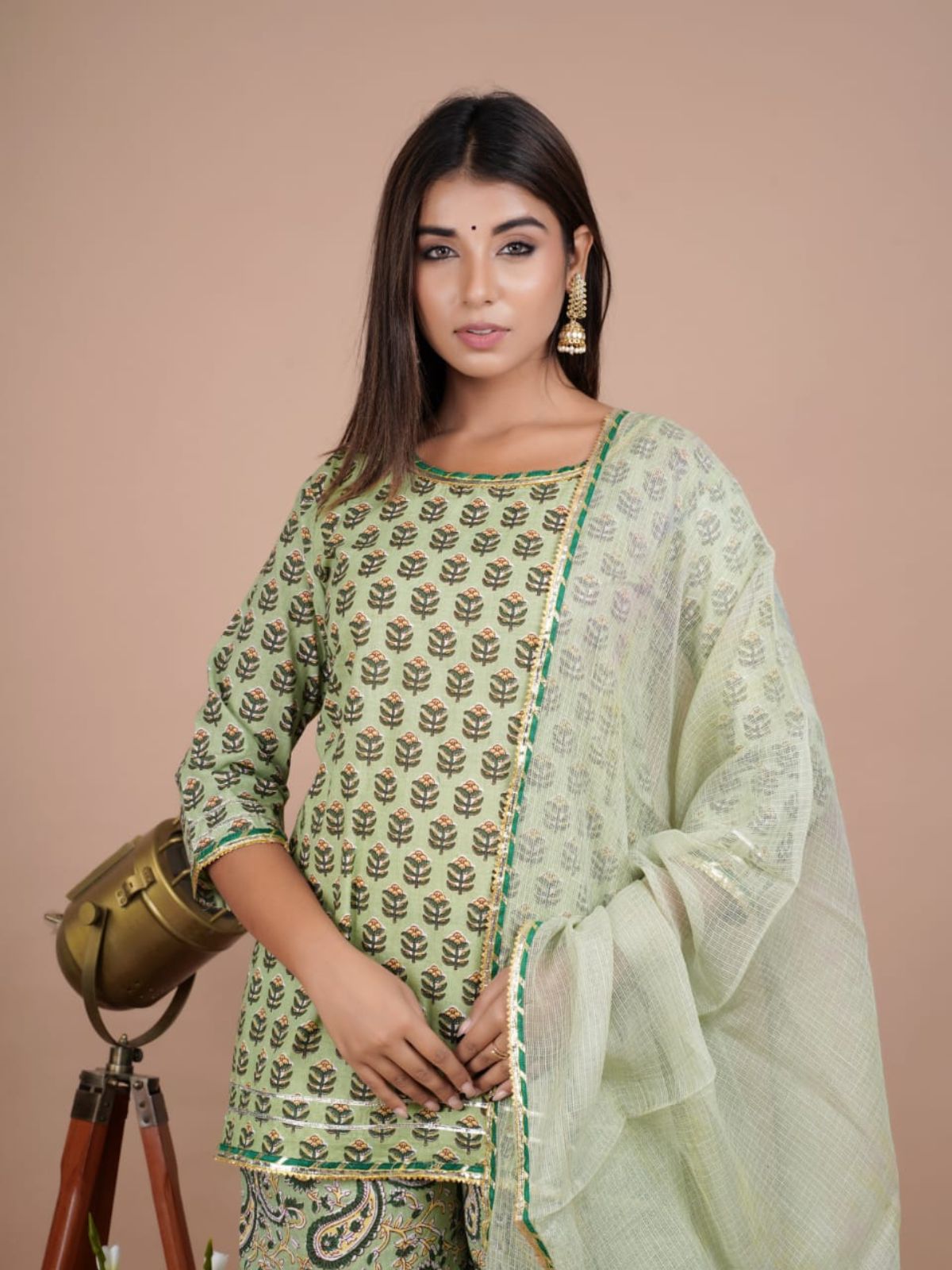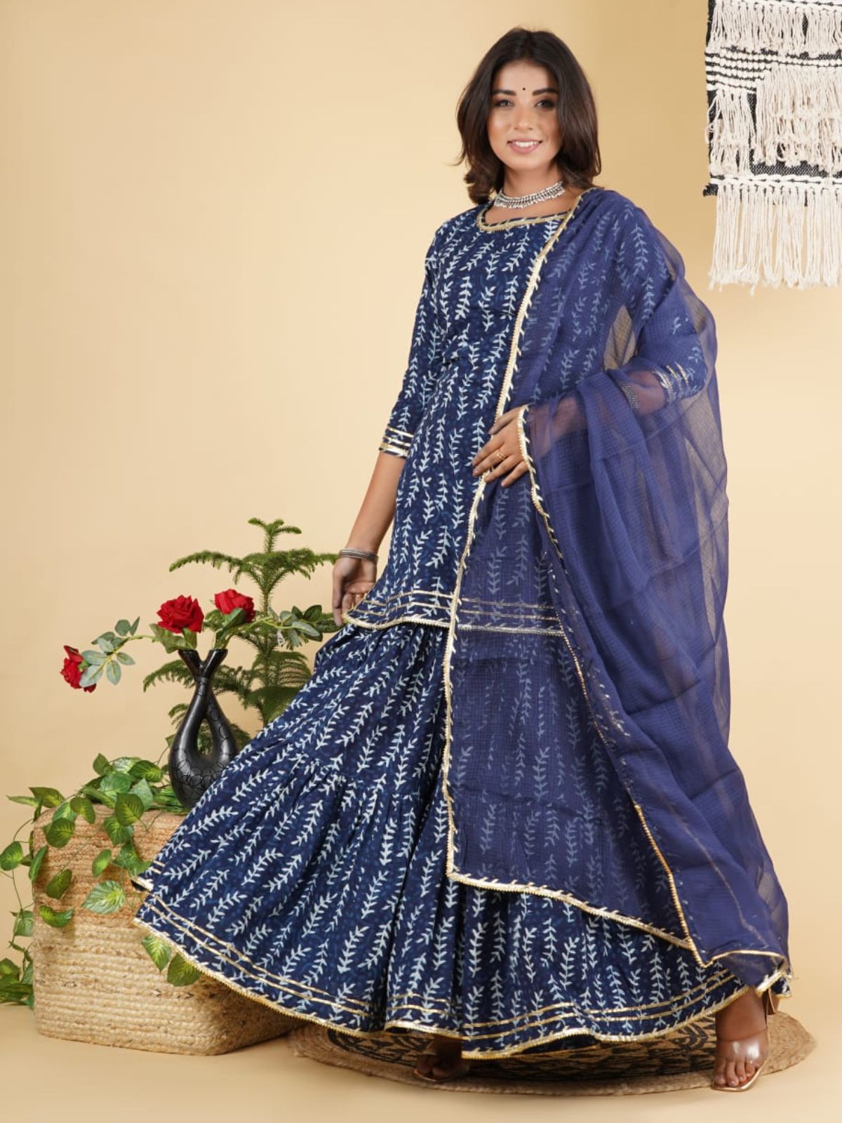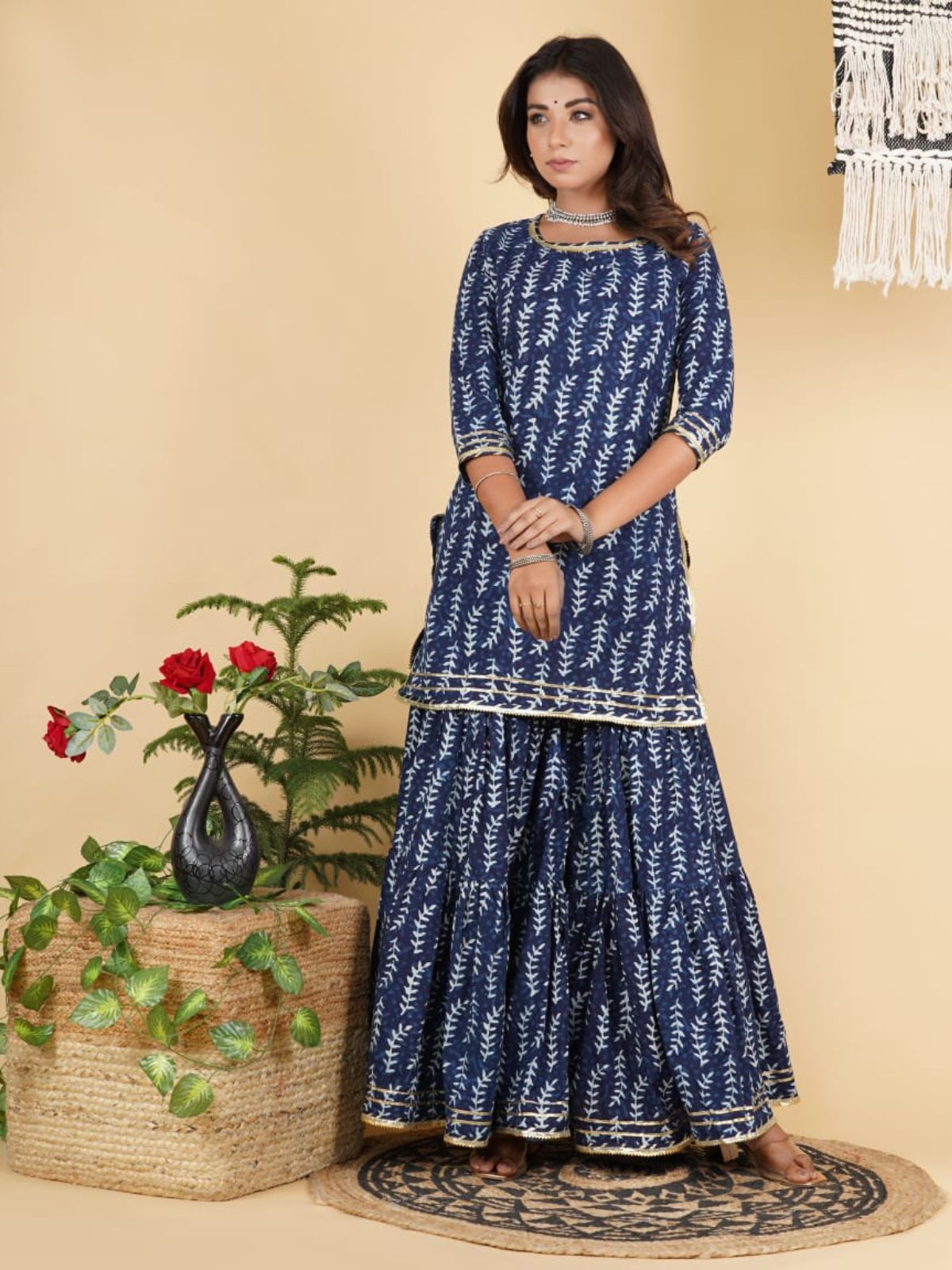 Traditional Hand block print cotton short kurta with tier gharara in a delicate colour palate with Kota doria dupatta with heavy tassel detailing.