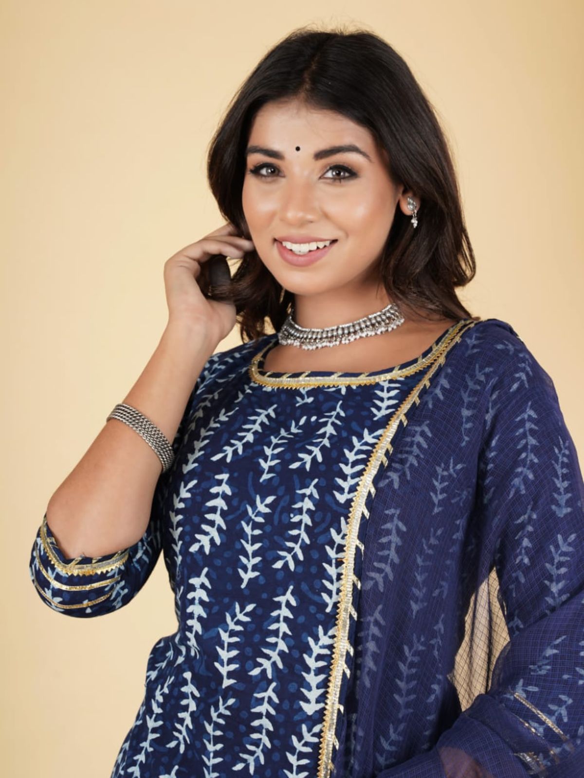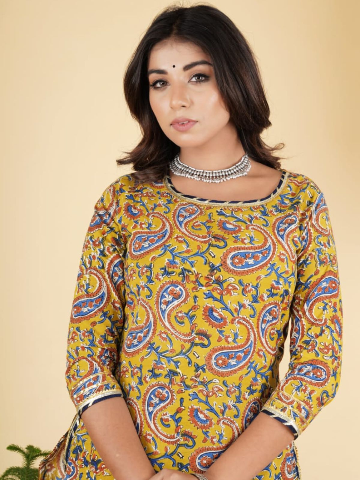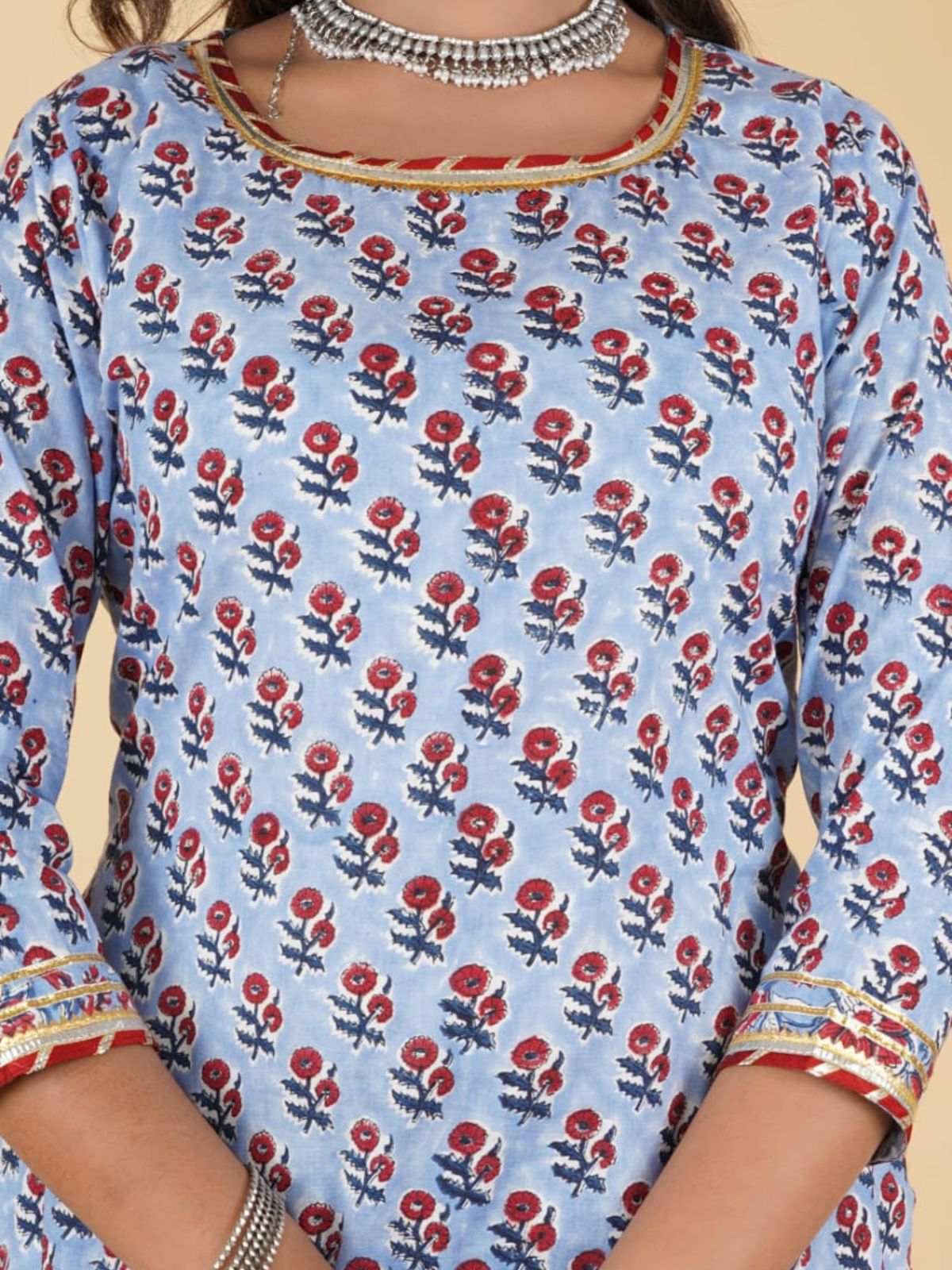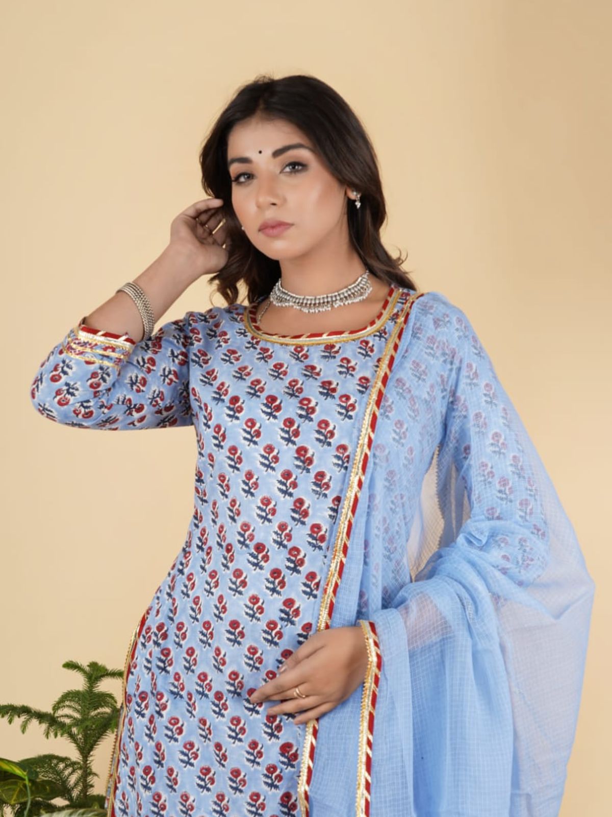 Traditional Hand block print cotton short kurta with tier gharara in a delicate colour palate with Kota doria dupatta with heavy tassel detailing.