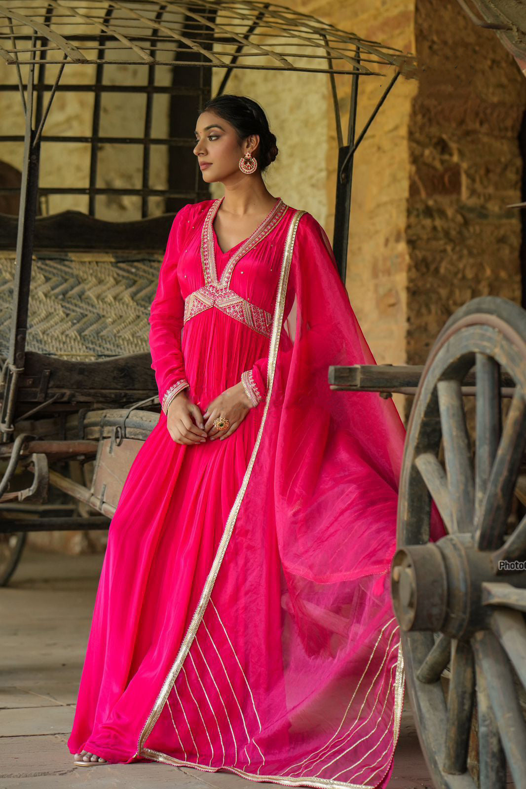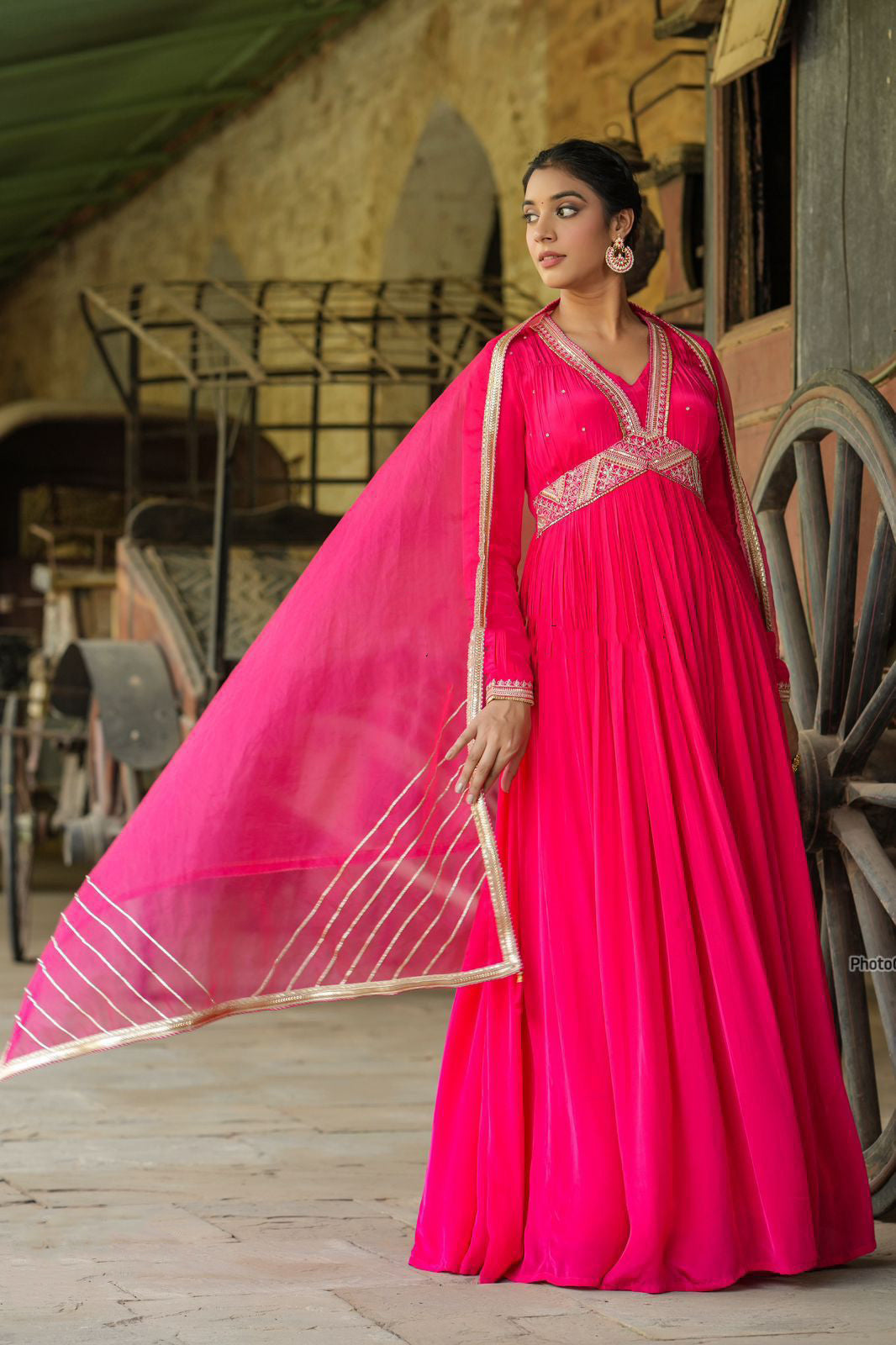 Premium natural crepe outfit has a beautiful flare classy solid colour gown having full sleeves in stylish Alia pattern paired up with dupatta.
