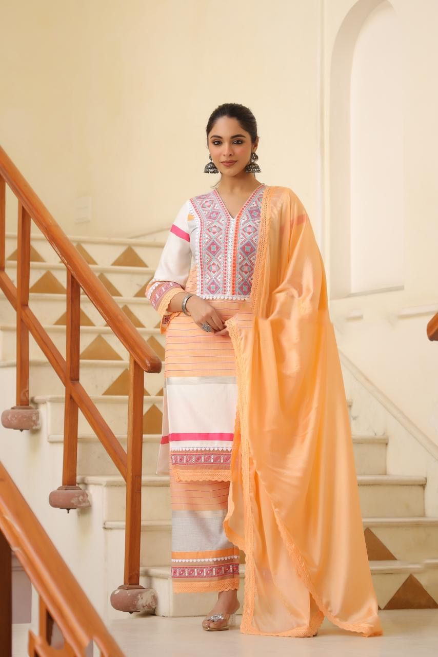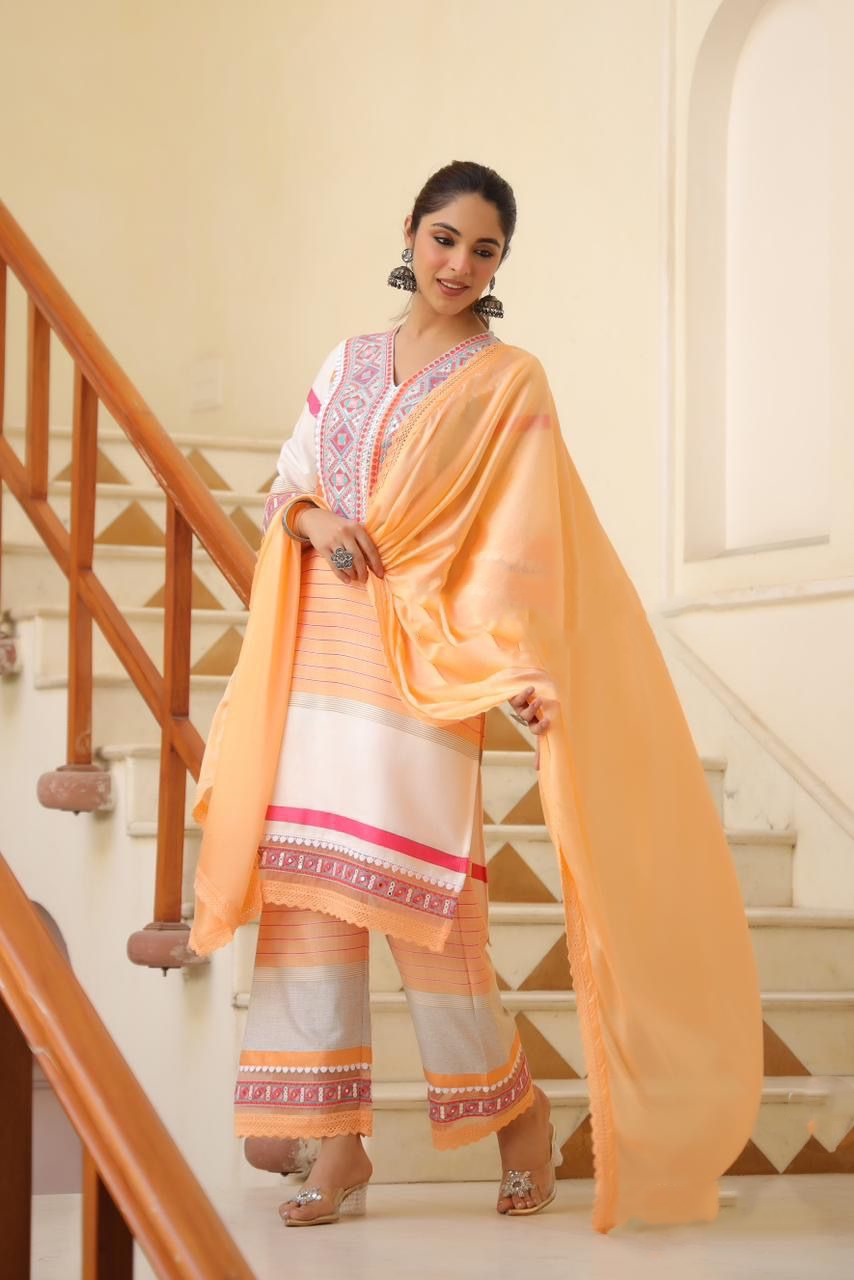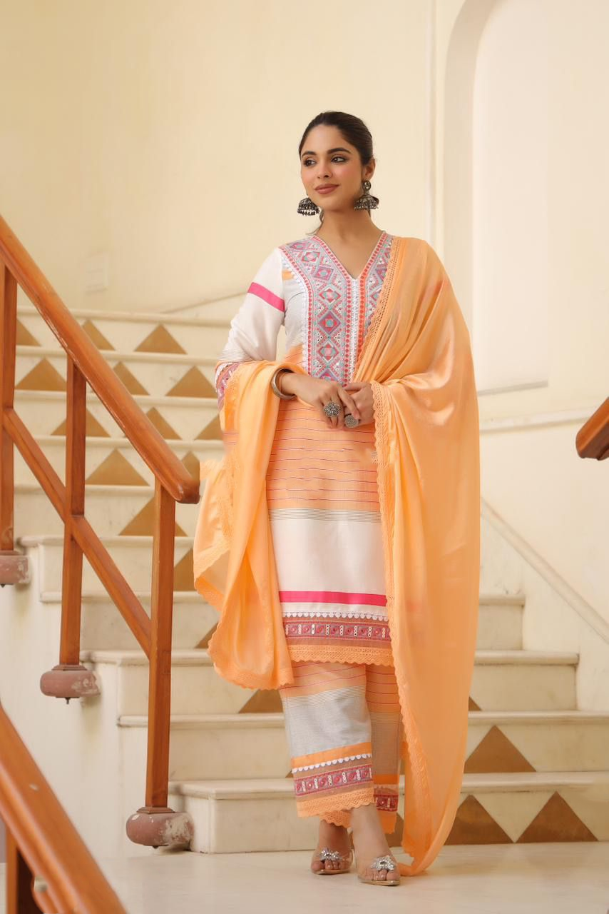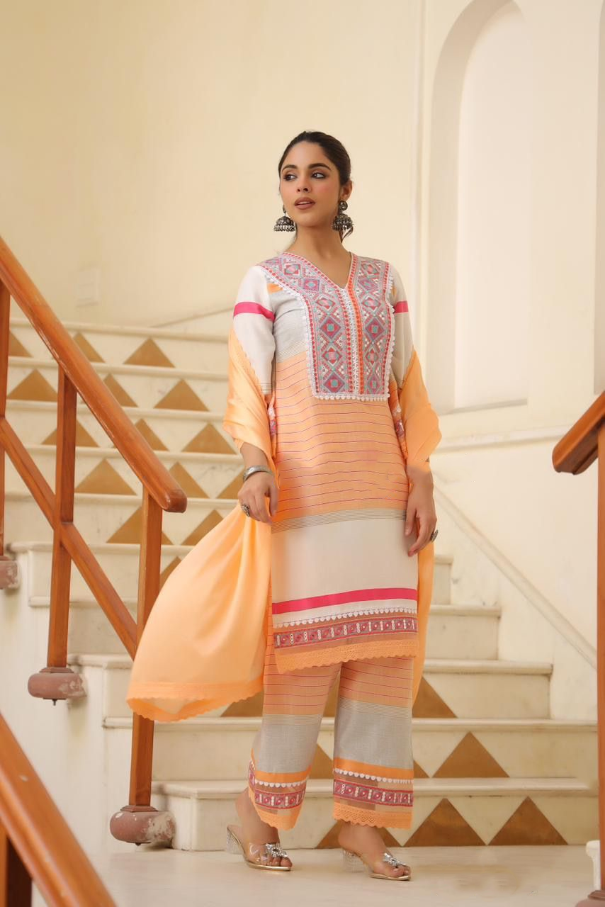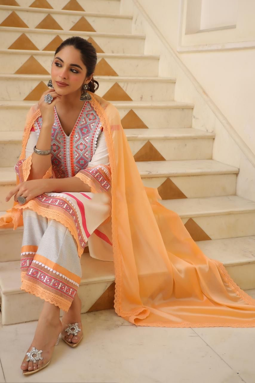 Premium cotton three piece suit set with embroidery and crocia detailing on sleeves and pants..