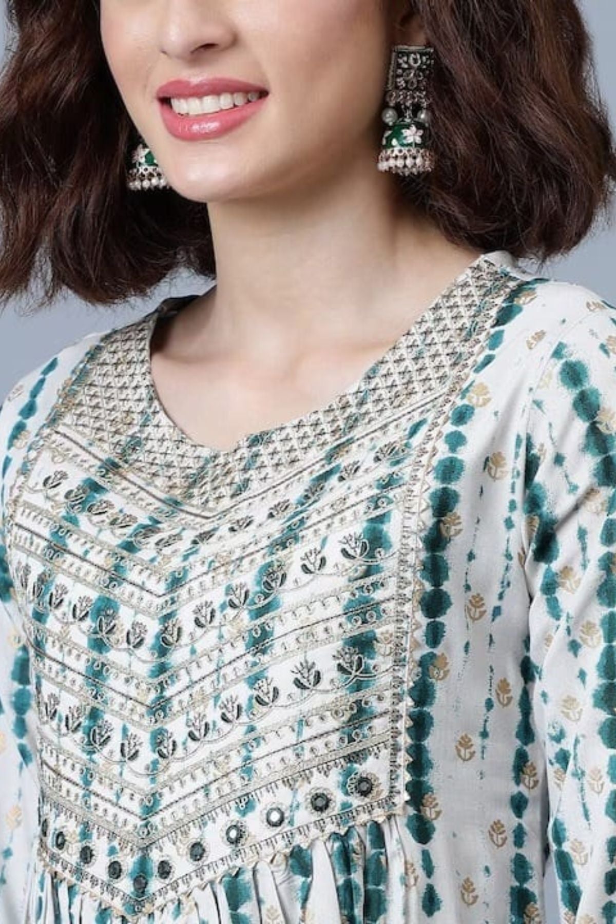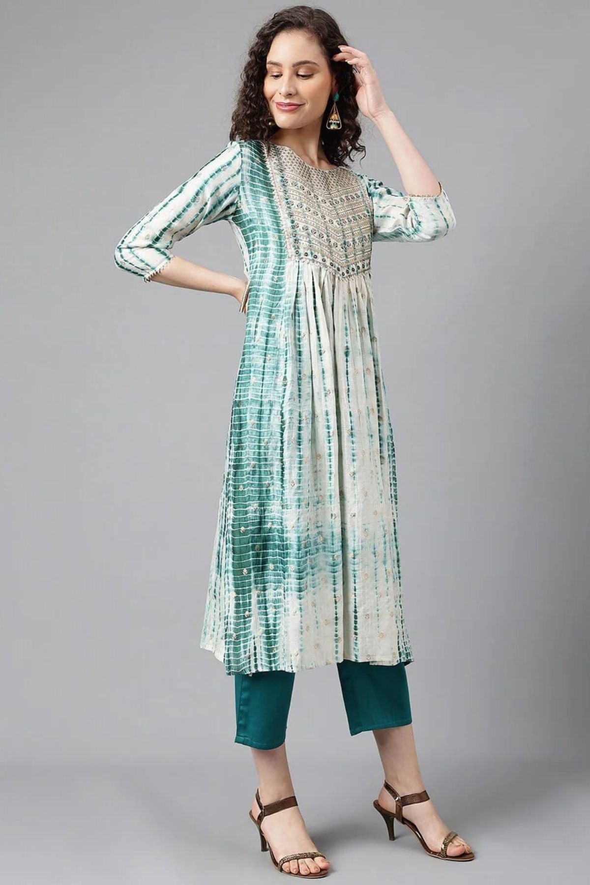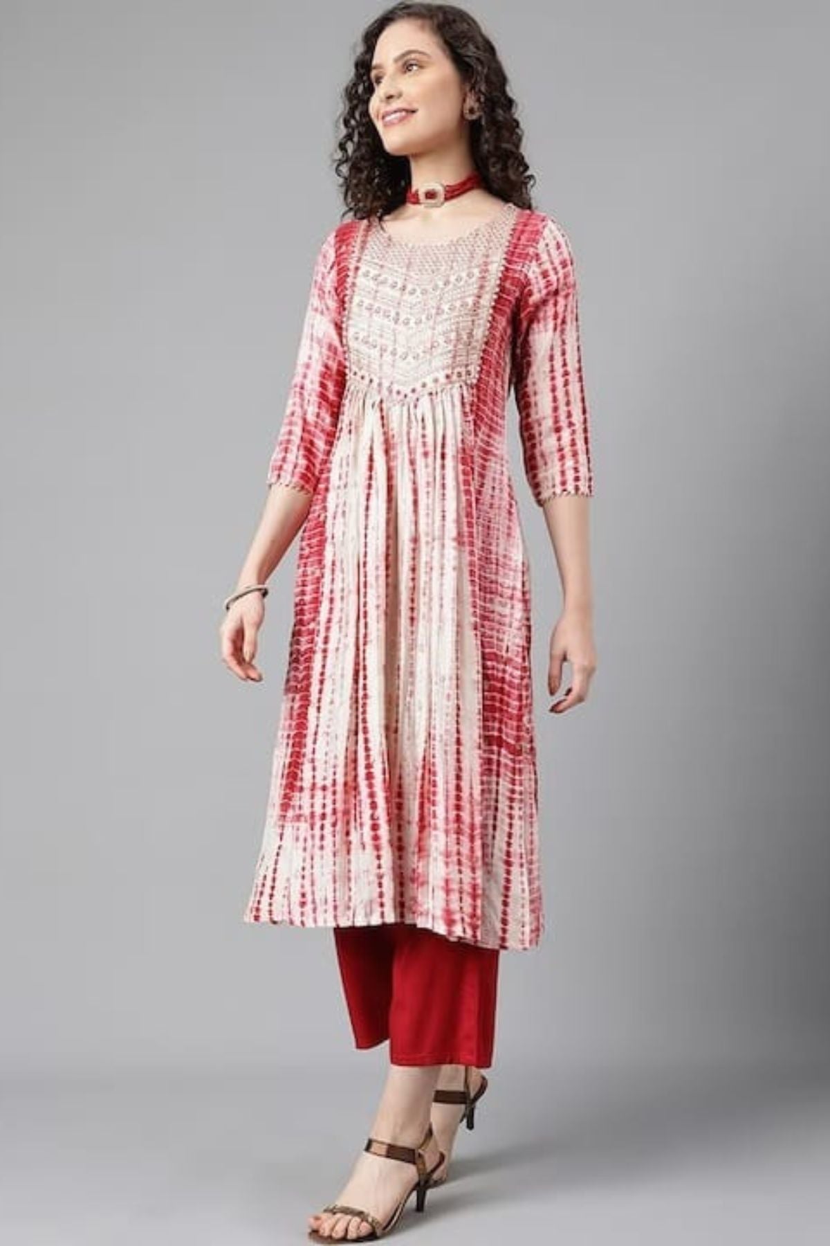 Beautiful printed kurta & trousers with dupatta Ethnic motifs printed Straight shape Pleated style Round neck, short regular sleeves Thread work detail Calf length with straight hem Viscose rayon machine weave fabric Ethnic motifs printed Straight shape Pleated style Round neck, short regular sleeves Thread work detail Calf length with straight hem Viscose rayon machine work.
