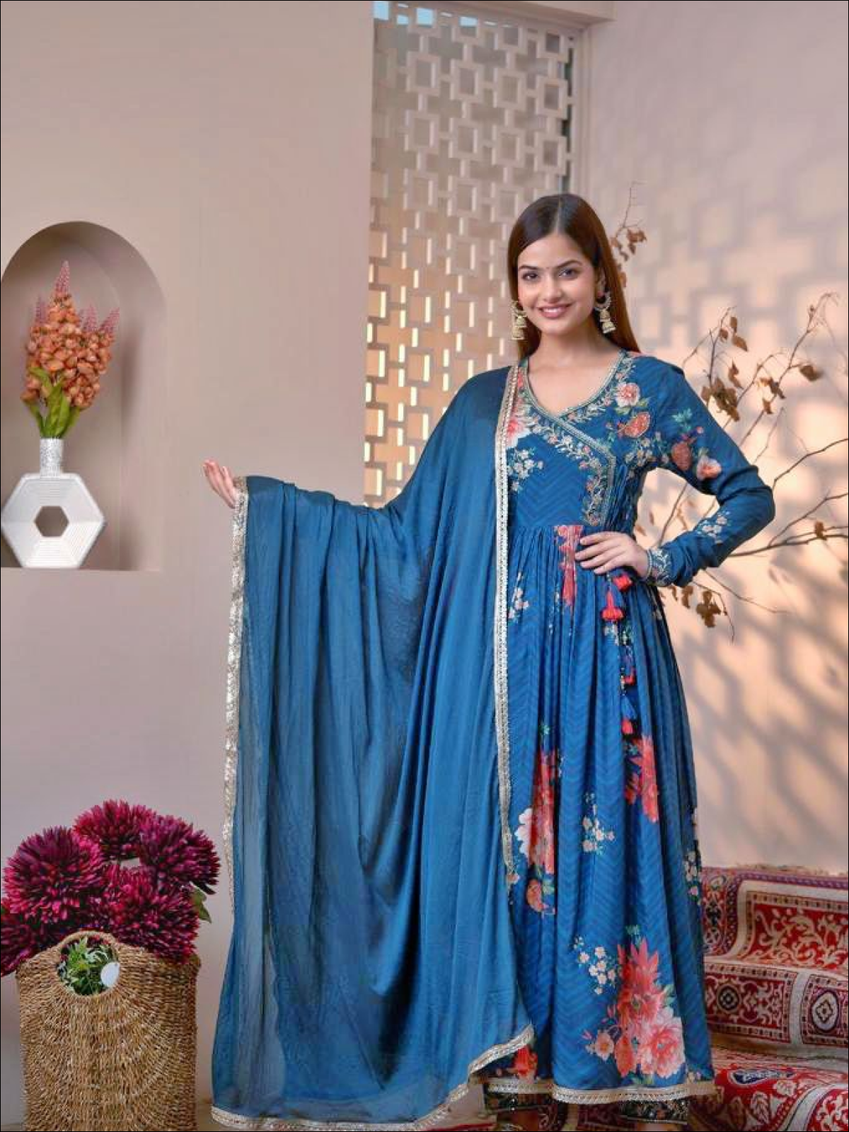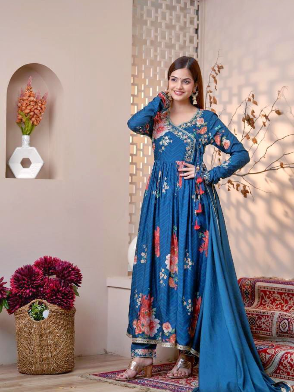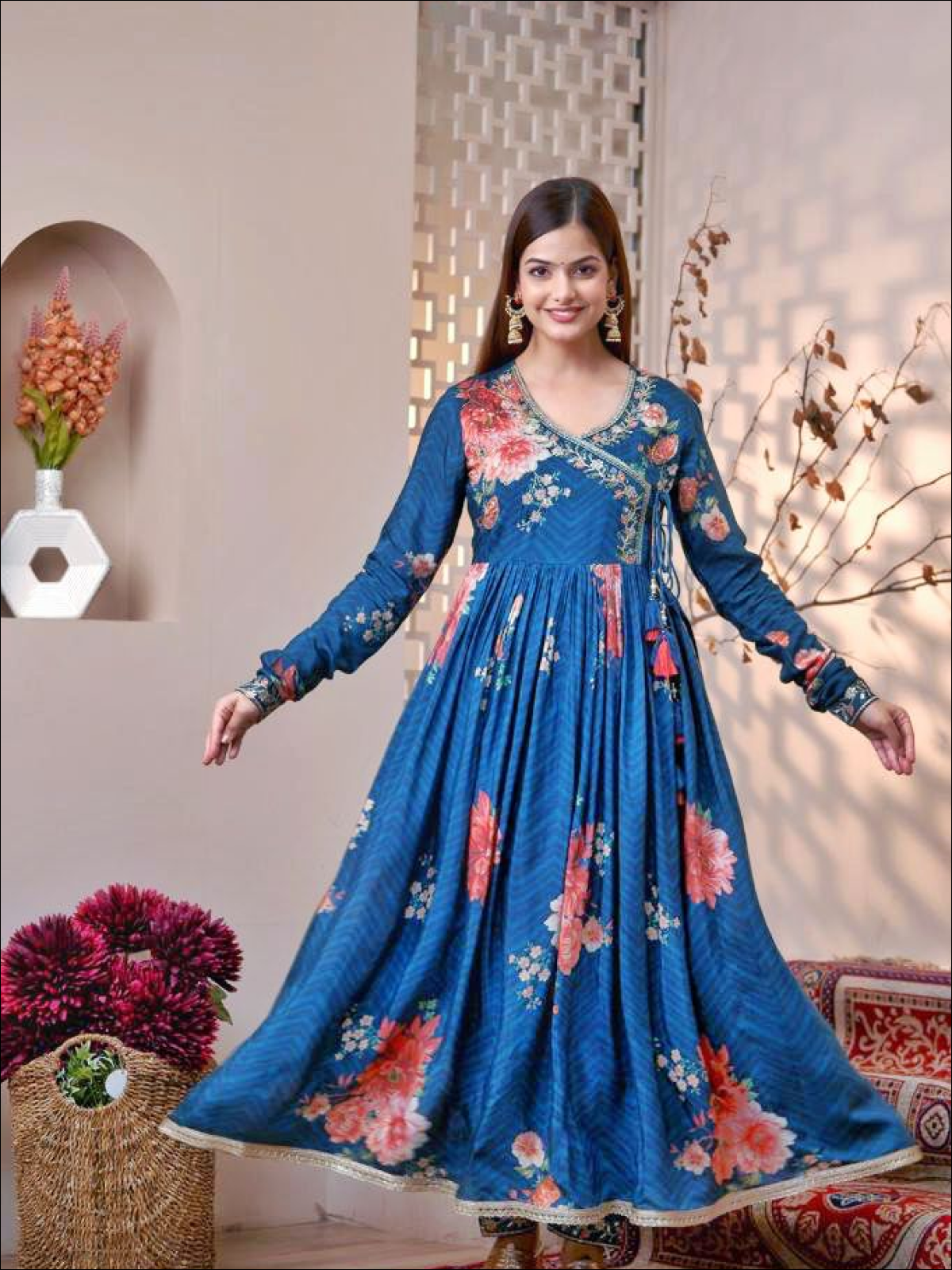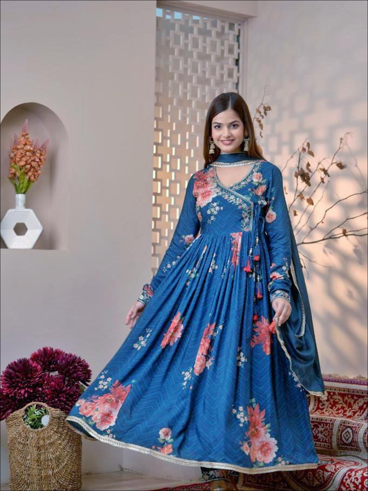 Enjoy Your Festival and wedding festivities with our Beautiful Anarkali angrakha dress Digital Print Kurti gown with embroidery on yoke with paired embroidery pant with Beautiful Georgette Dupatta. Embroidery work all
