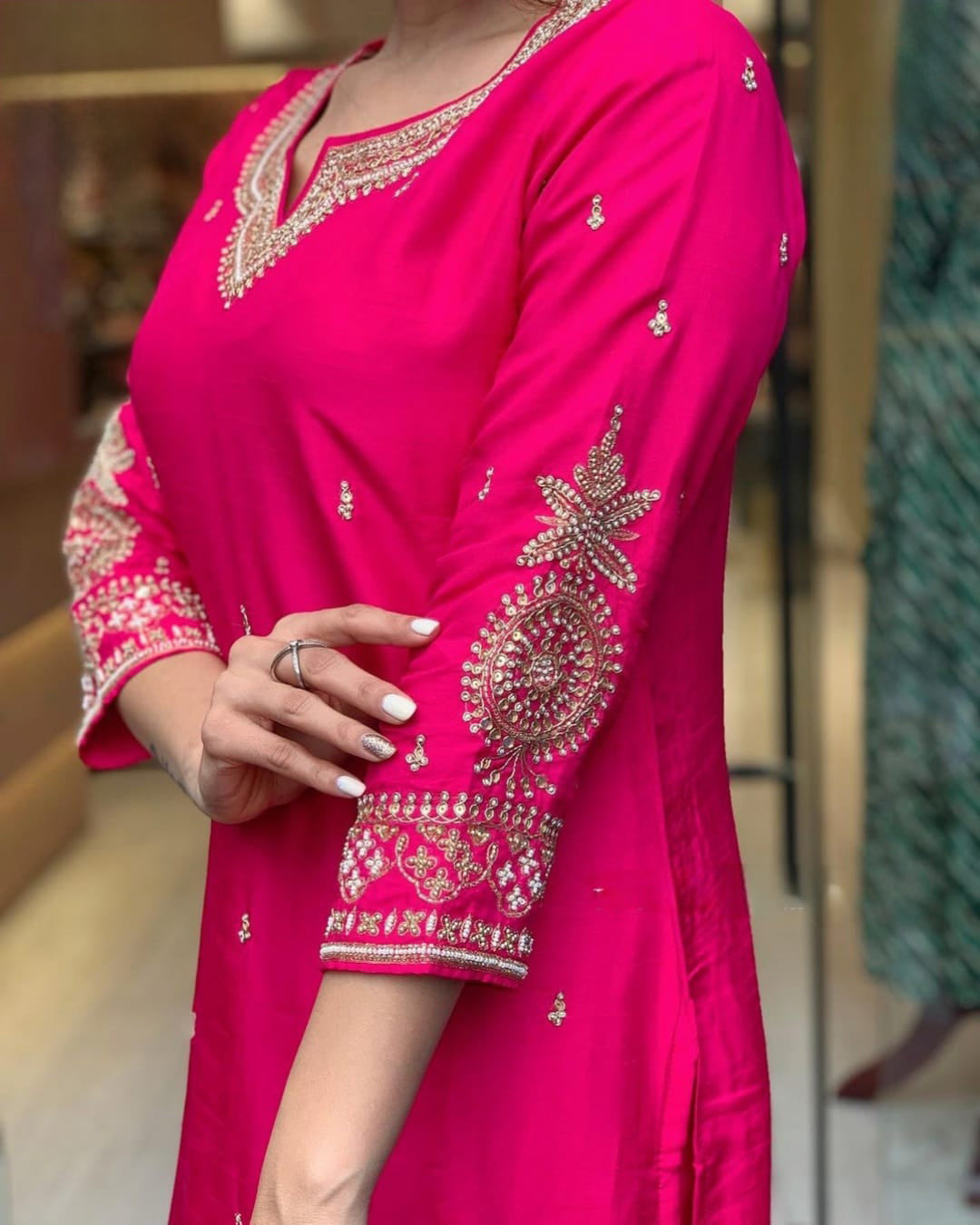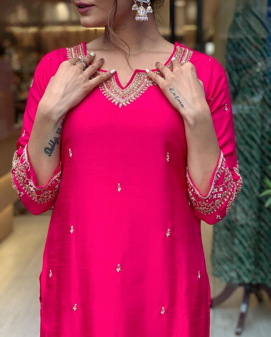 Exclusive Party Wear Suit with Heavy Exclusive Handwork on Neckline, Sleeves and All over the kurti paired with Matching Pant,completed with Heavy Banarasi Dupatta