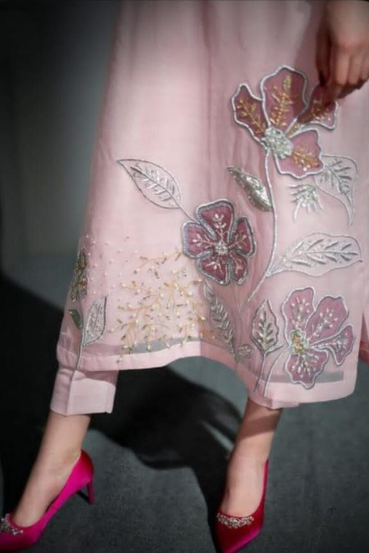 Heavy Adda Embroidery with Patchwork on the Kurta Sleeves & on Kurta Flair.