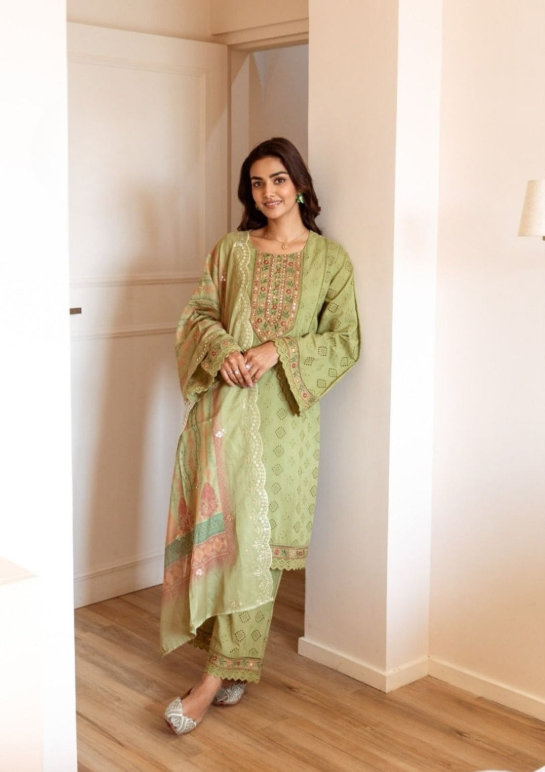 A Beautiful Ready to Wear suit in Schifflie fabric with Embroidery work on Yoke paired with Pant completed with Soft Chanderi Dupatta*