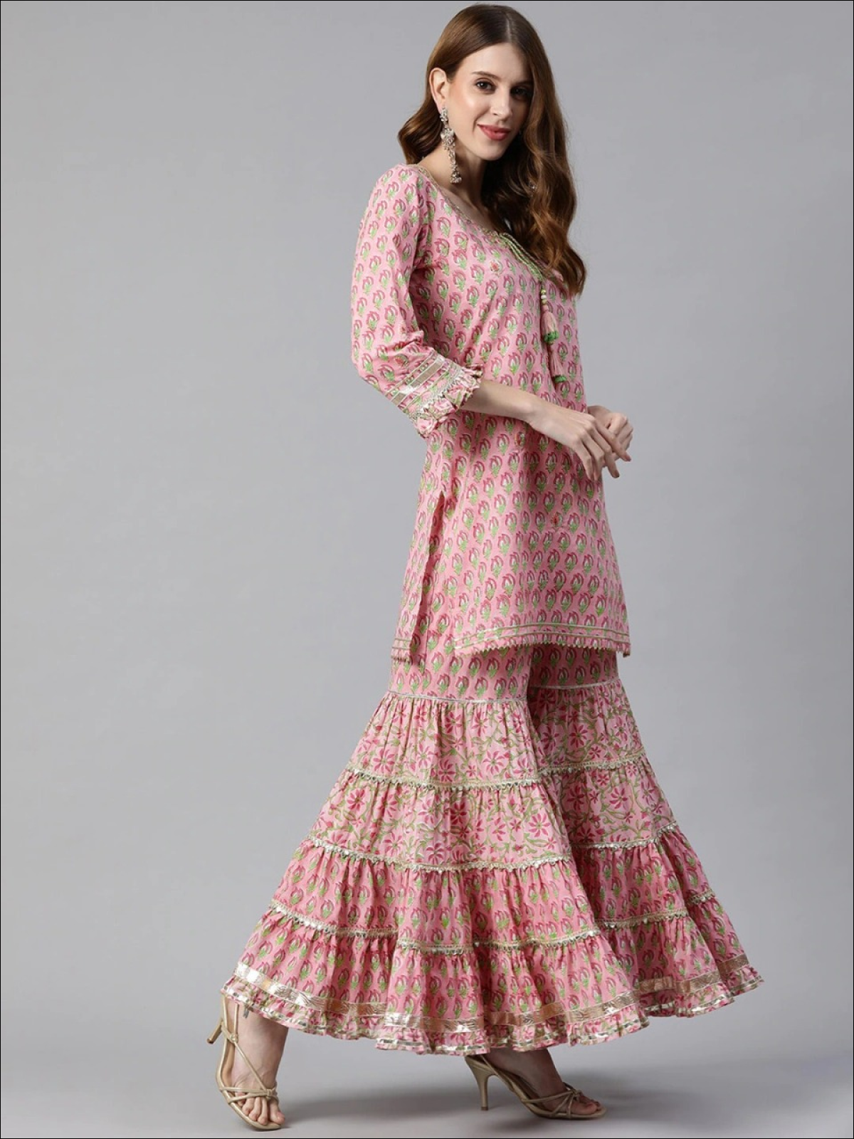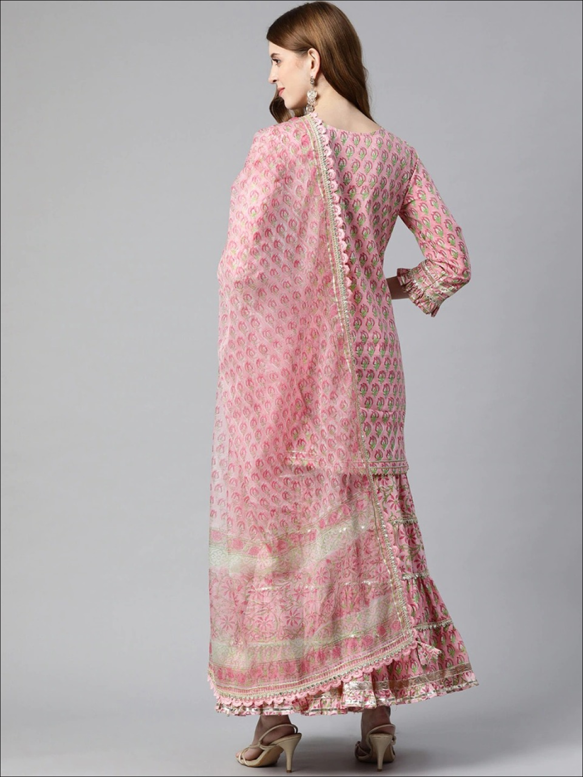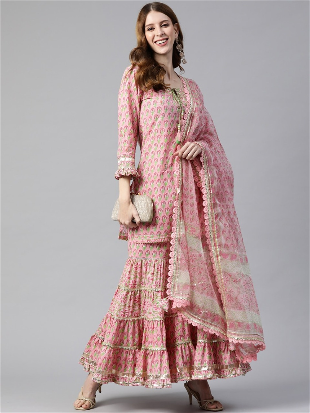 Ethnic Motifs Printed Mirror Work Pure Cotton Kurti with Sharara & With Dupatta