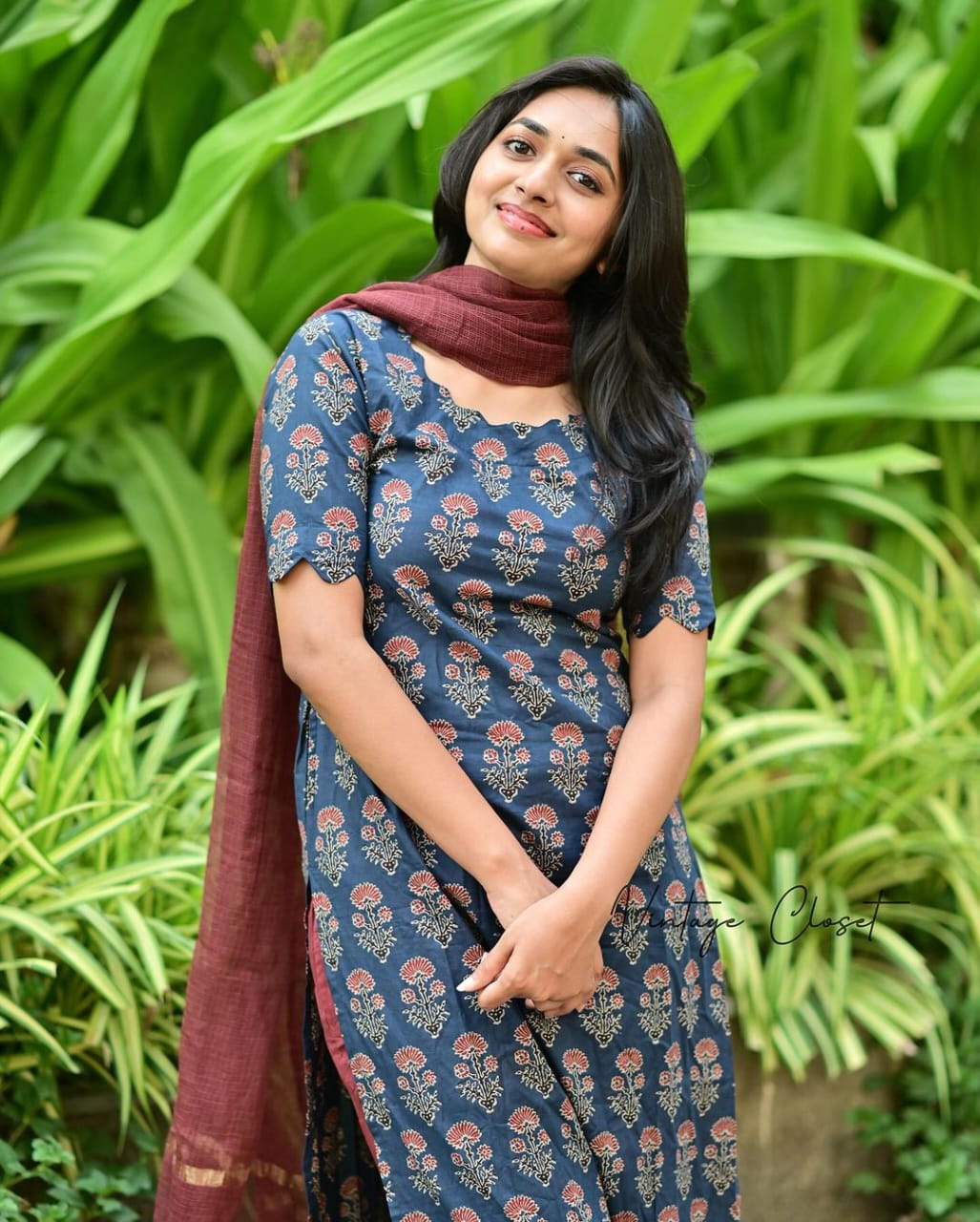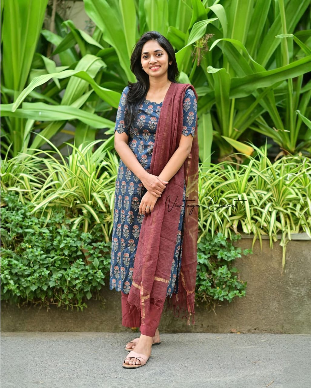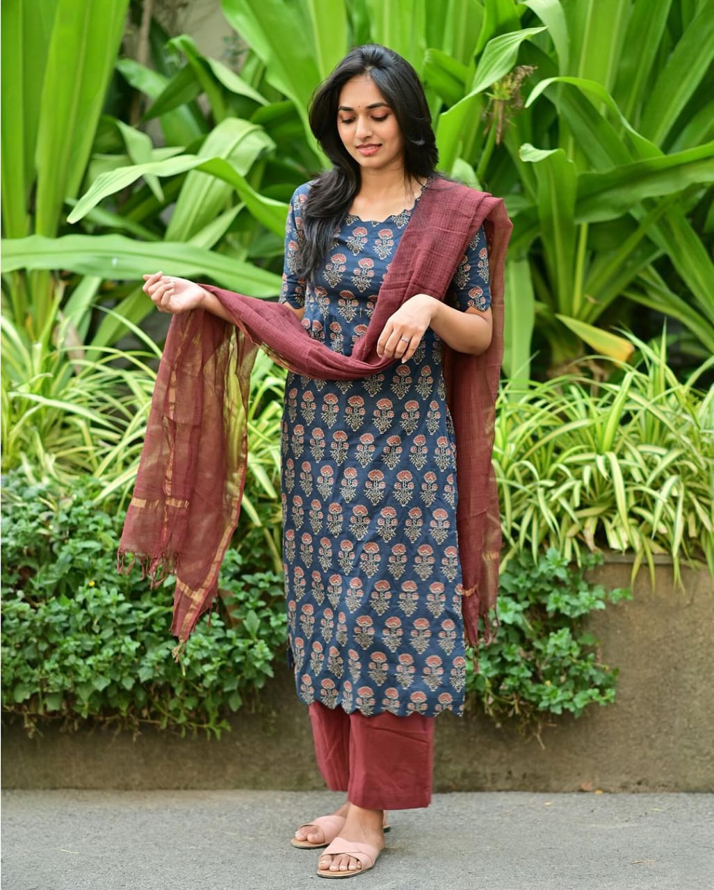 *Kurti with wave pattern neckline sleeve and ends paired with Palazzo bottom and full size kota doria dupatta*