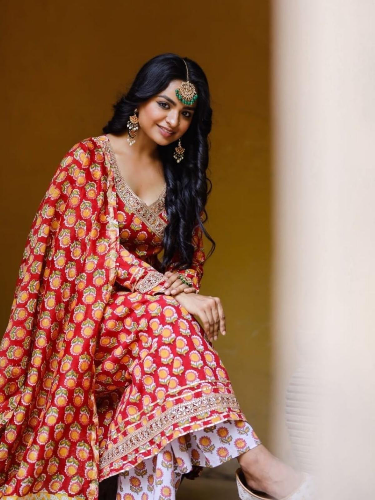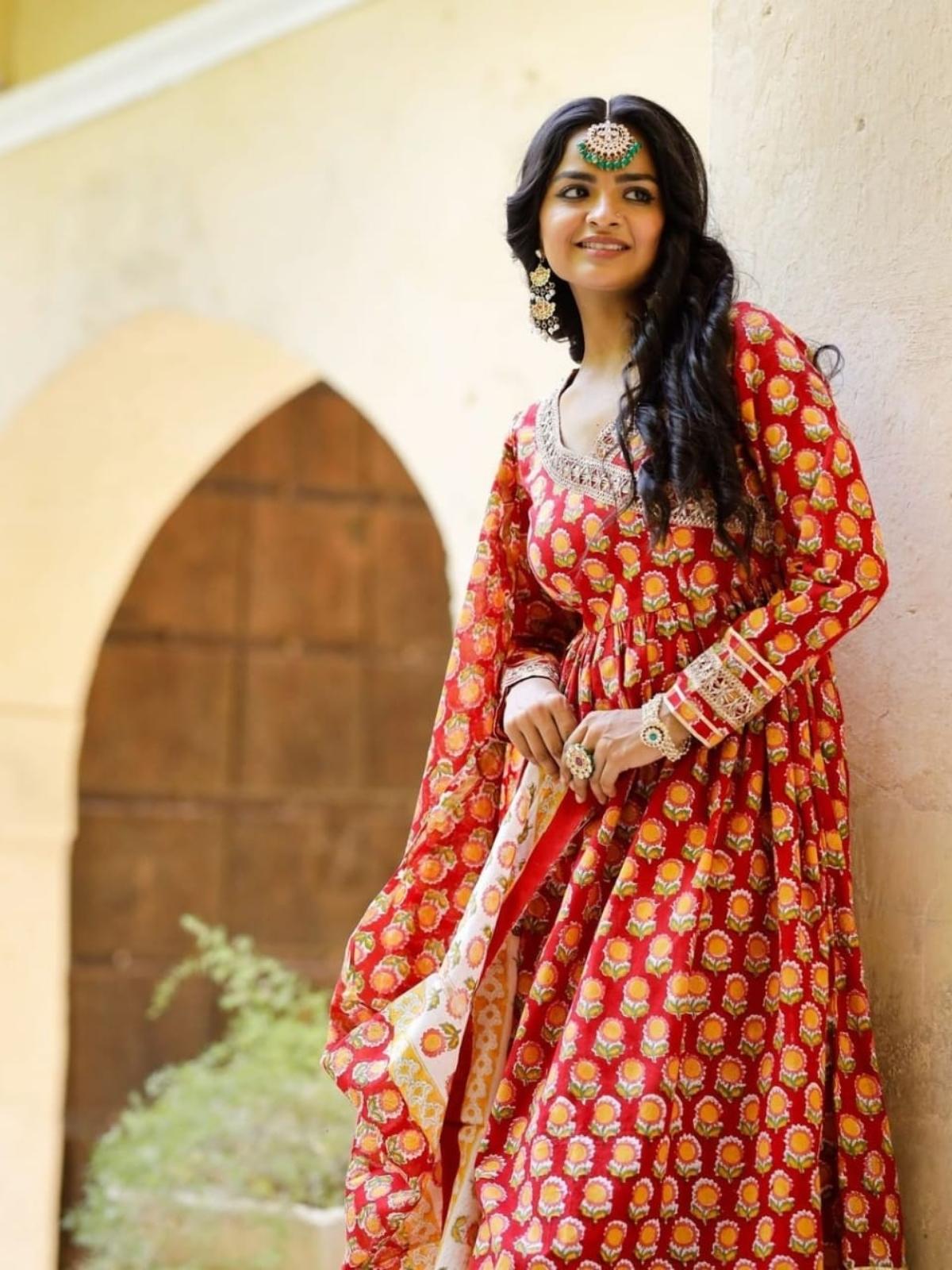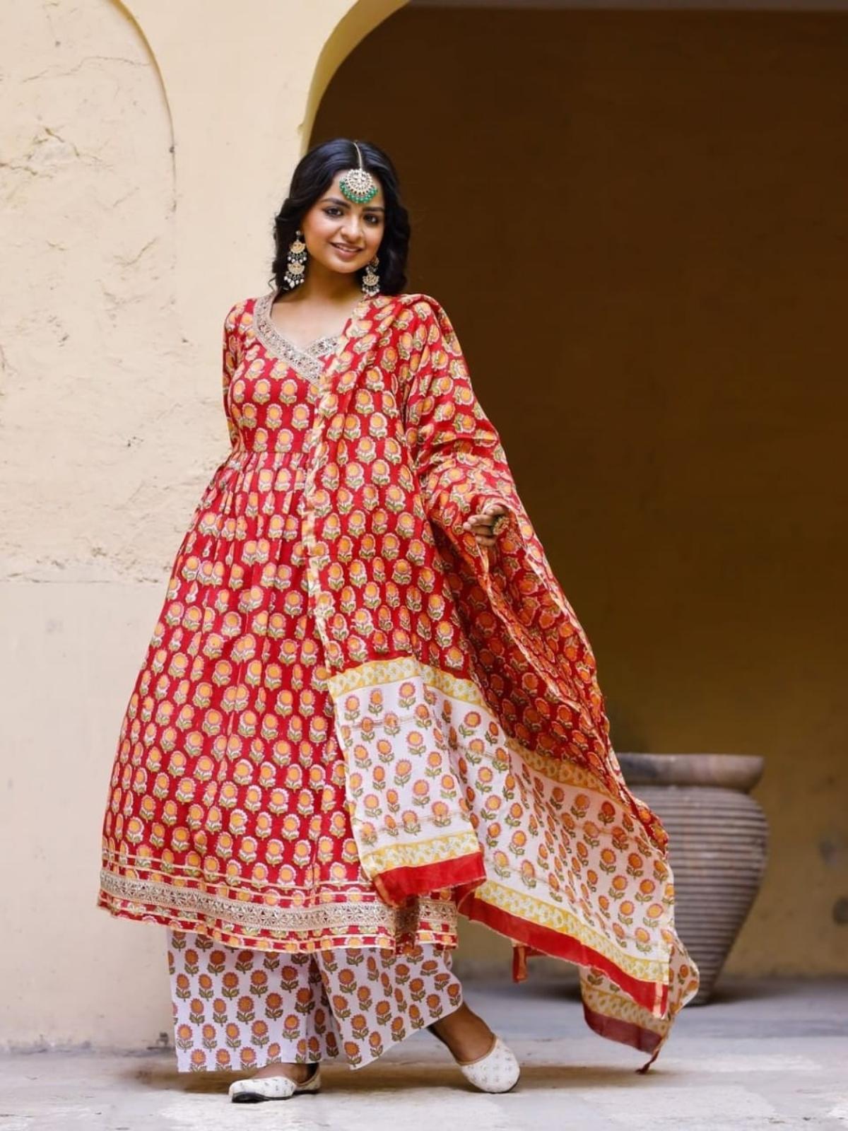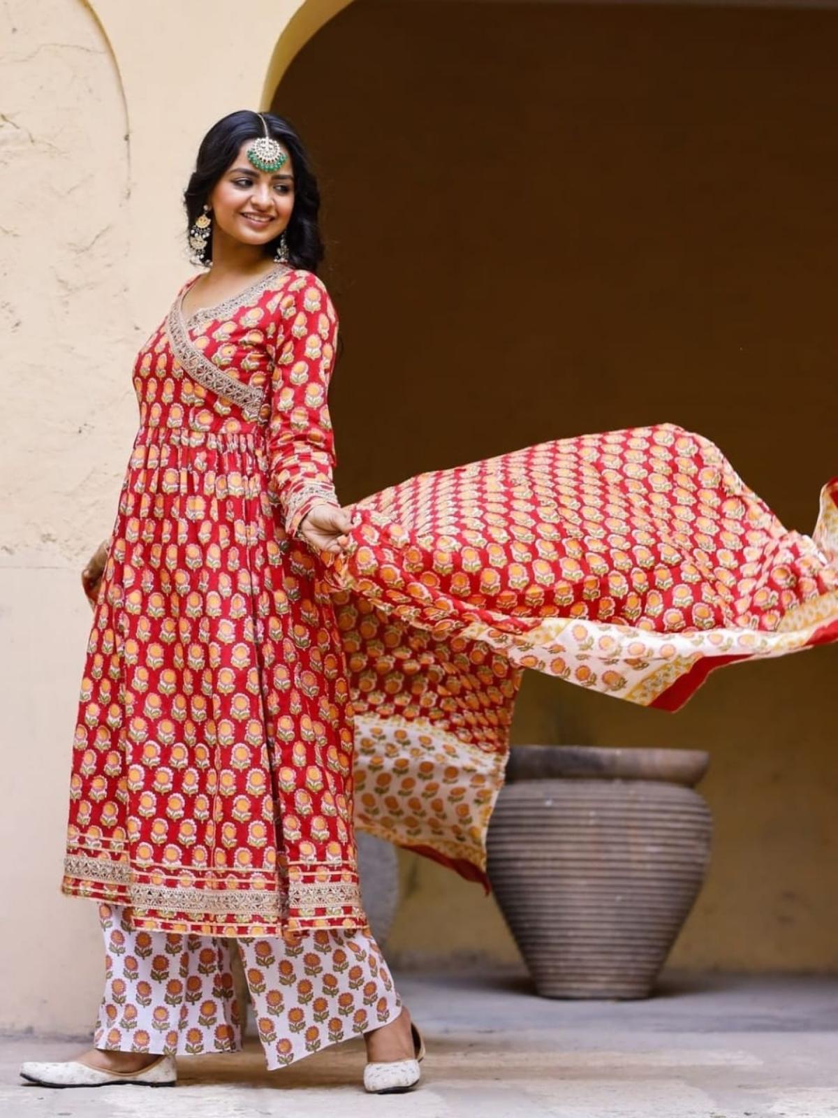 Look prettiest with this traditional and beautiful gorgeous anarkali jaipuri print kurta which has a gotta work with paired matching palazos with malmal dupatta