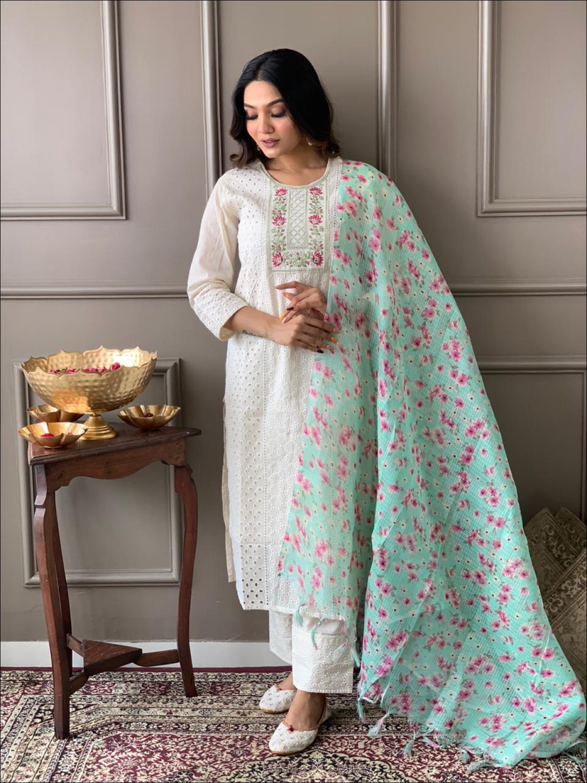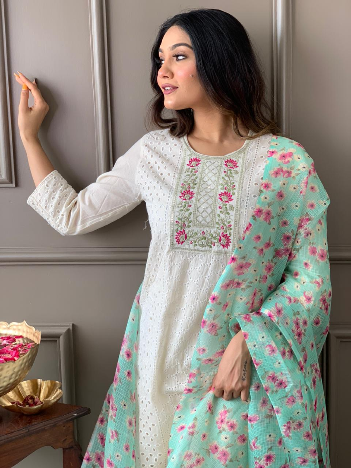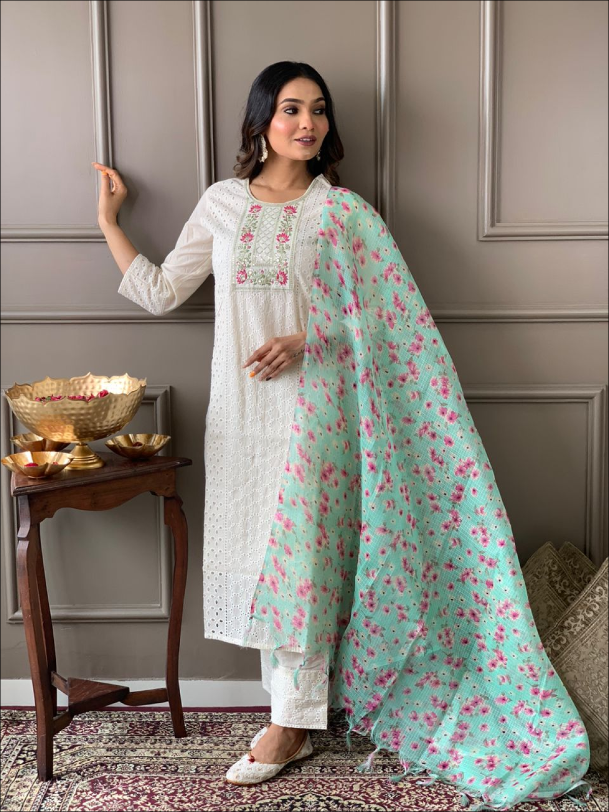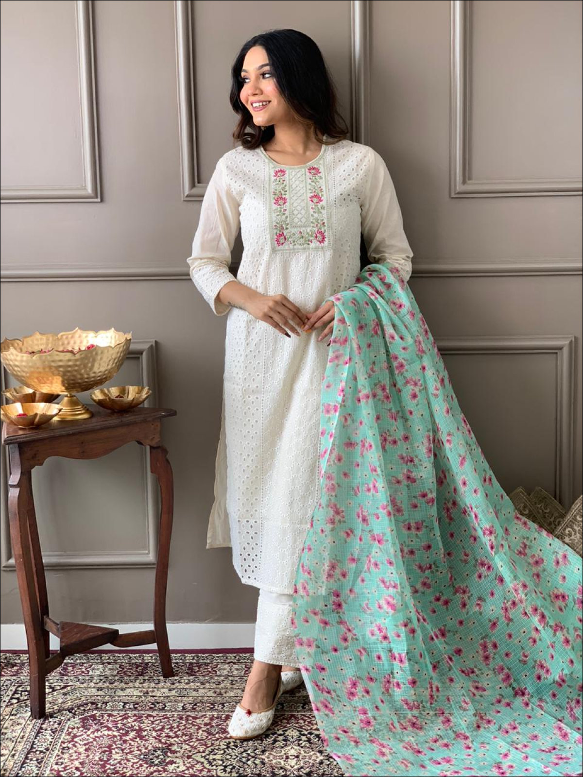 Pure chicken cotton kurta with embroidery work paired with hand block kota doriya dupatta and pants.