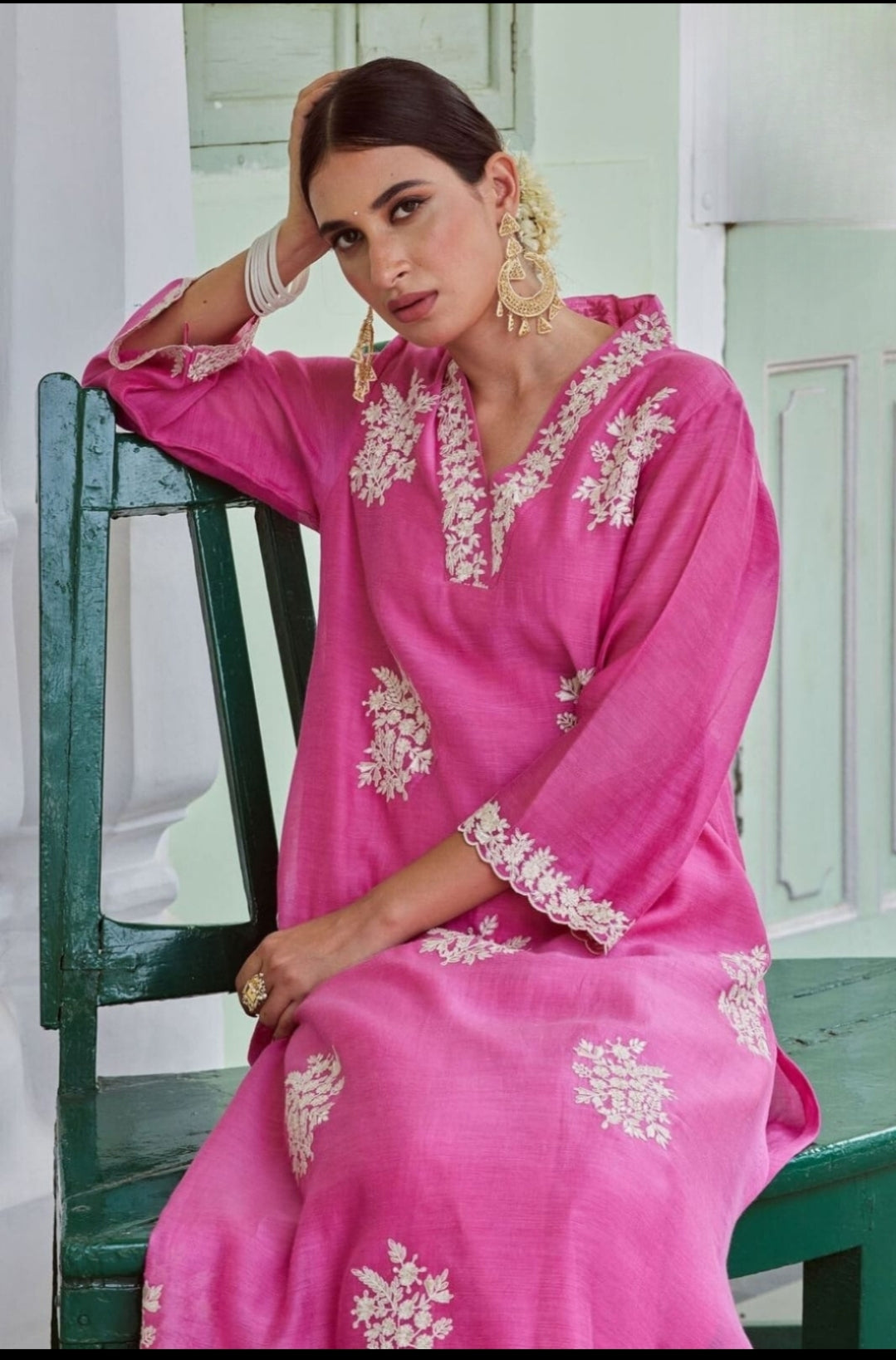 A Very Tempting Kurti Palazzo set in Premium Chanderi Fabric with Full Cotton Lining inside beautified with Heavy Embroidery all over the kurti including Neckline and Sleeves Border paired with Palazzo detailed with Embroidery