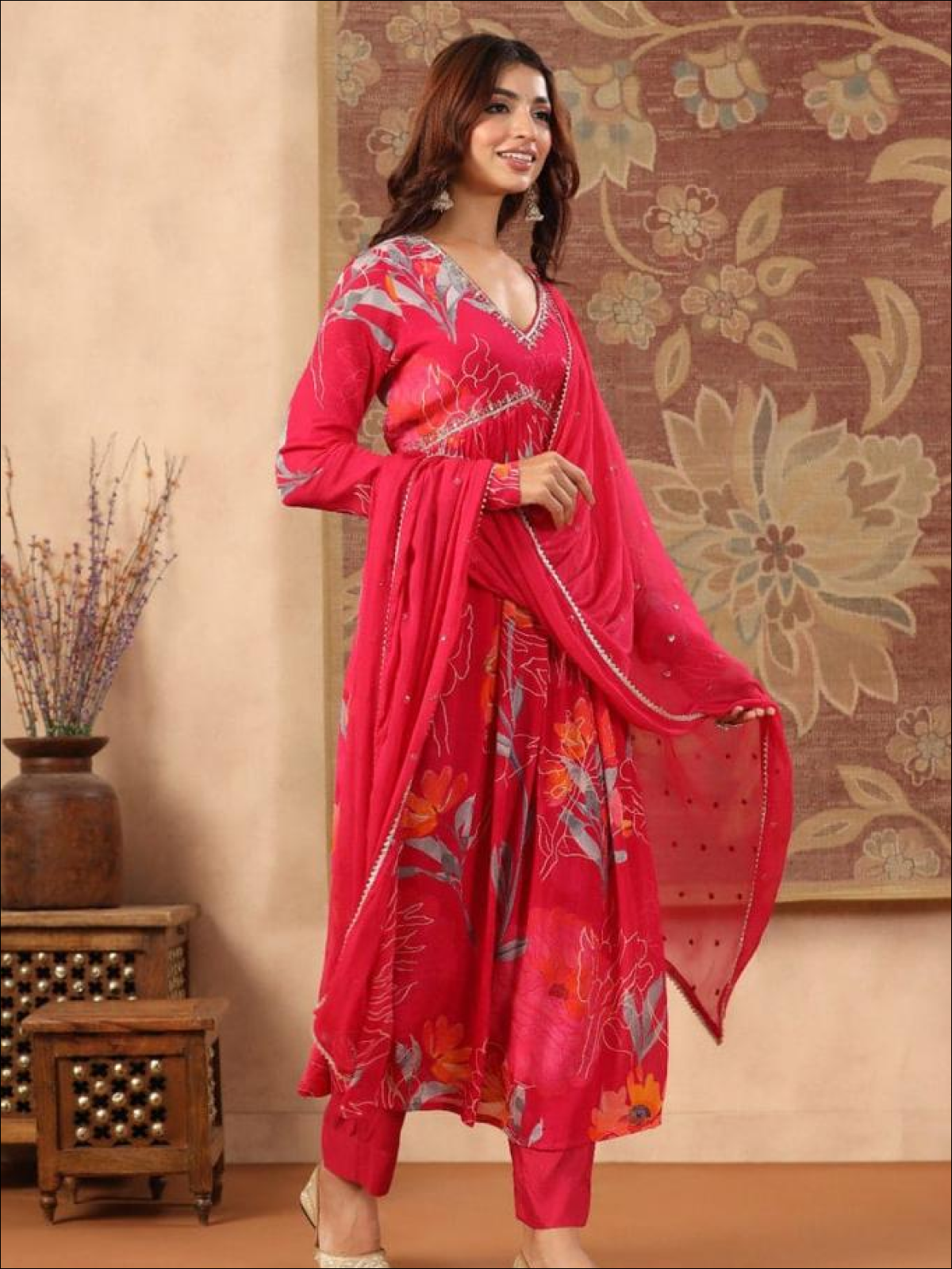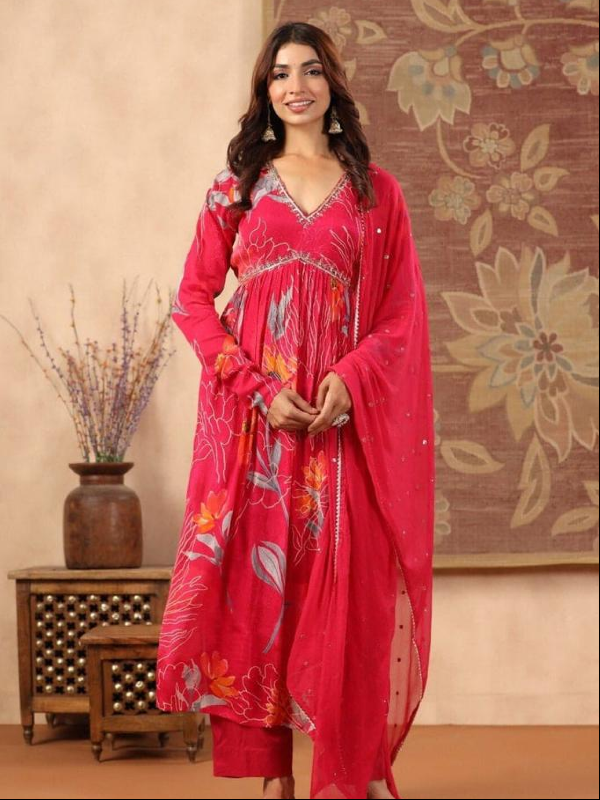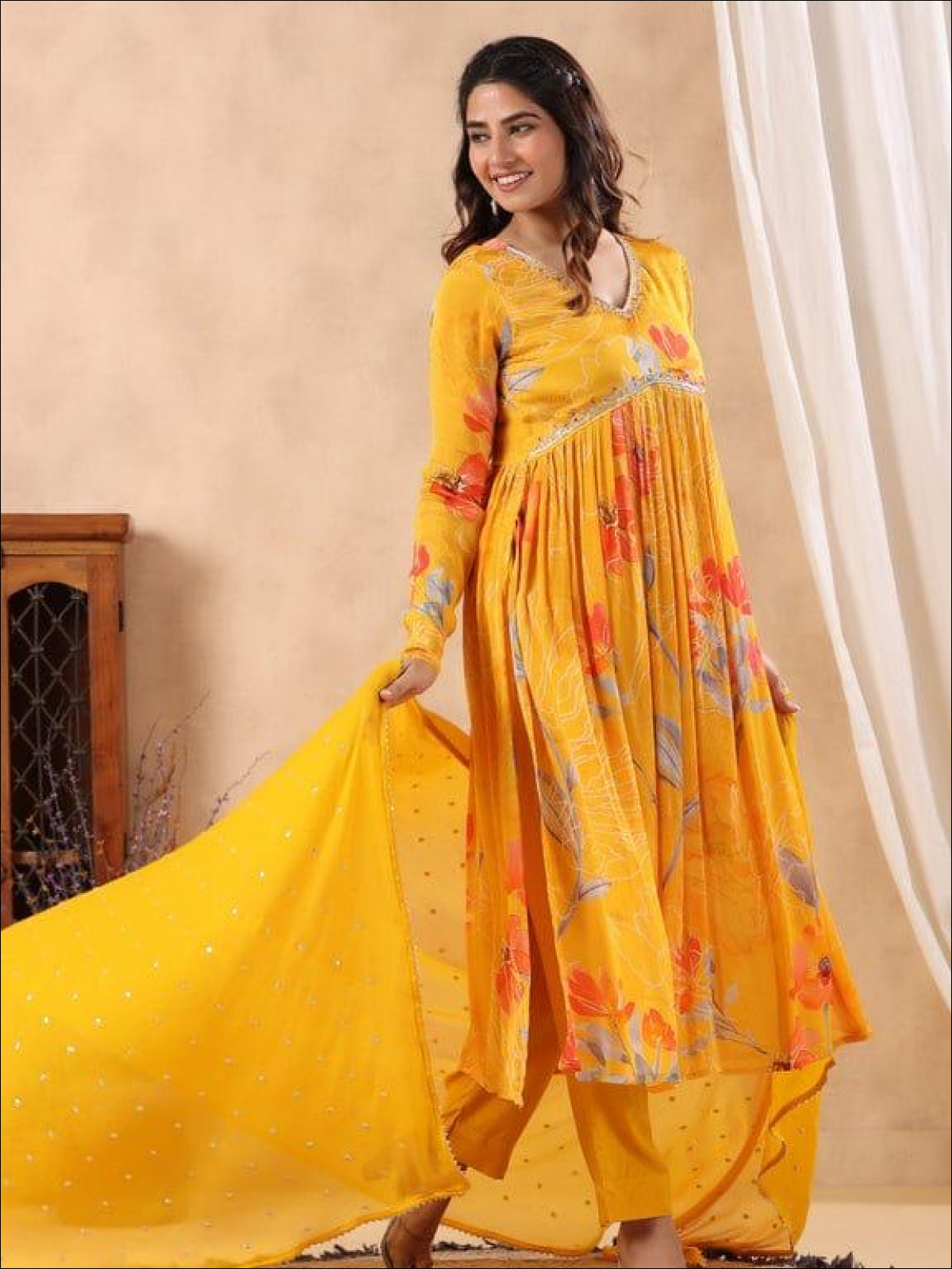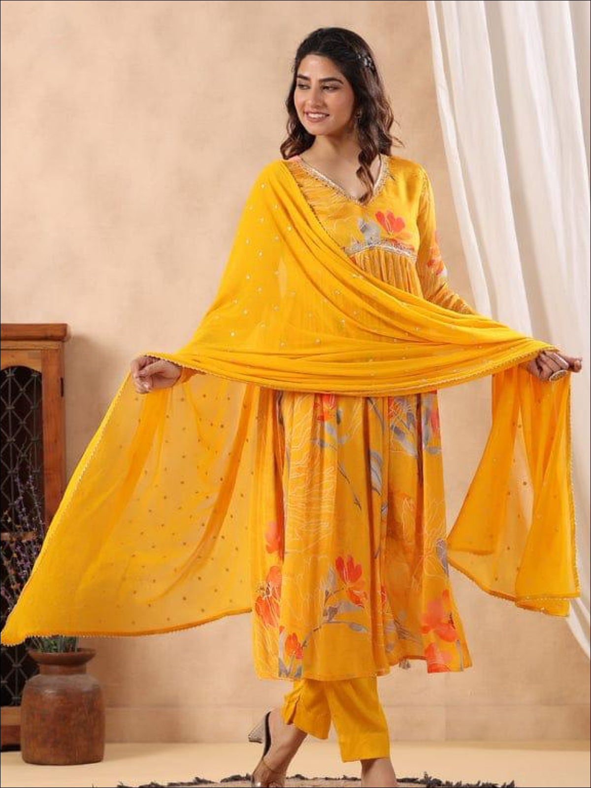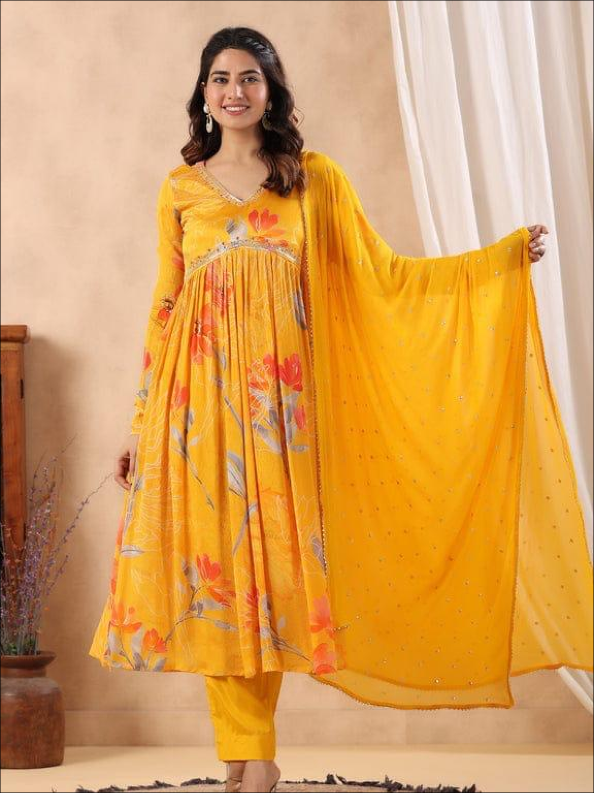 Floral Alia Cut Suit Set With Lining has an Inner Layer Of Fabric. A perfect outfit for this festive and wedding season. The kurta has mirror work on the neck with beautiful embroidery. It is paired with matching pants and chiffon dye dupatta. For all the stylish ladies out there, who want something simple, sophisticated and traditional.