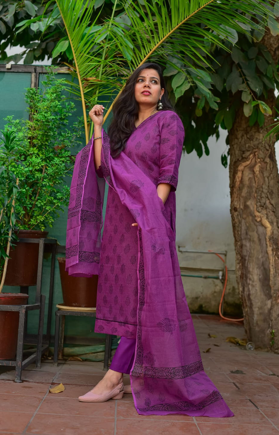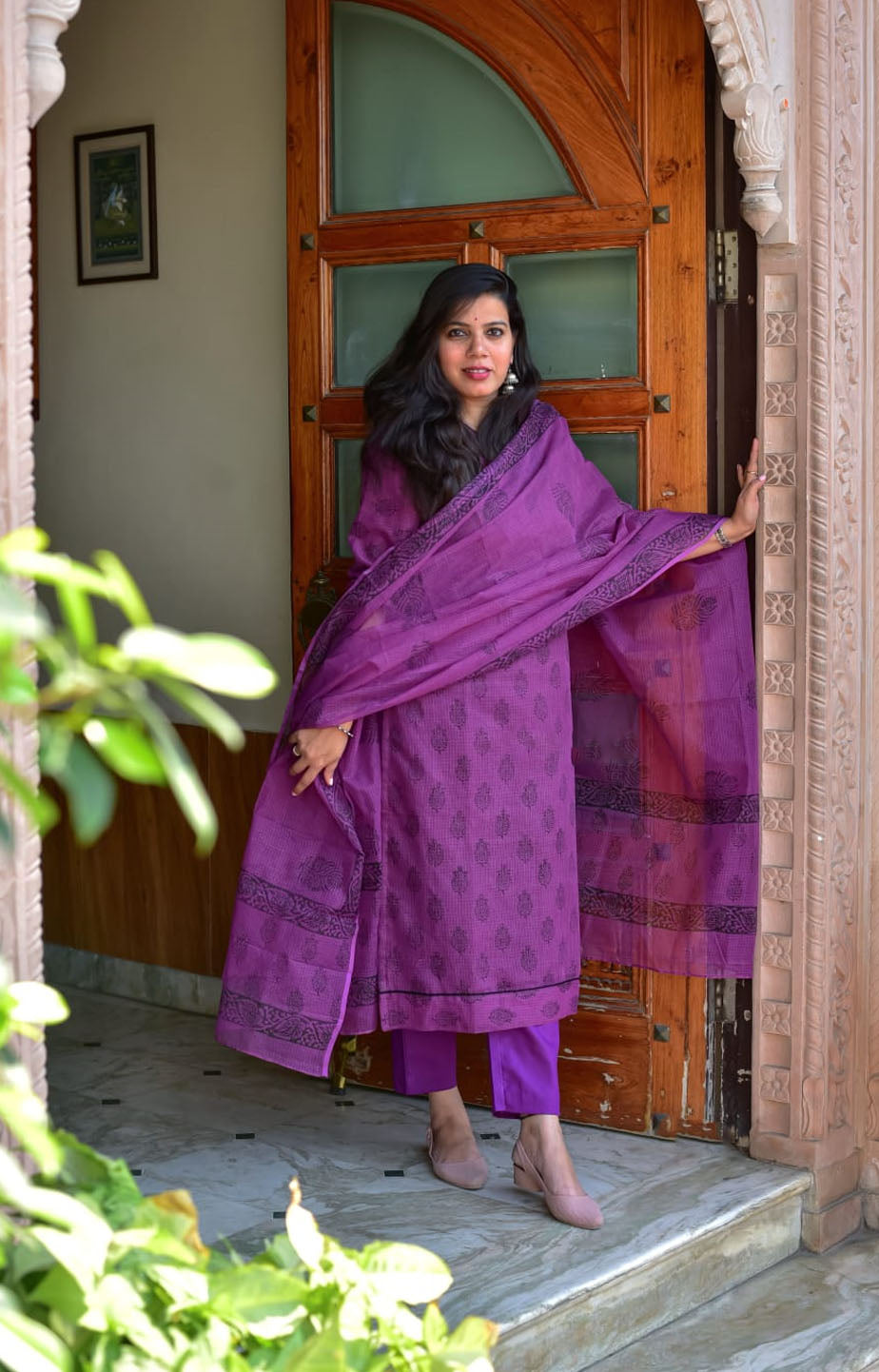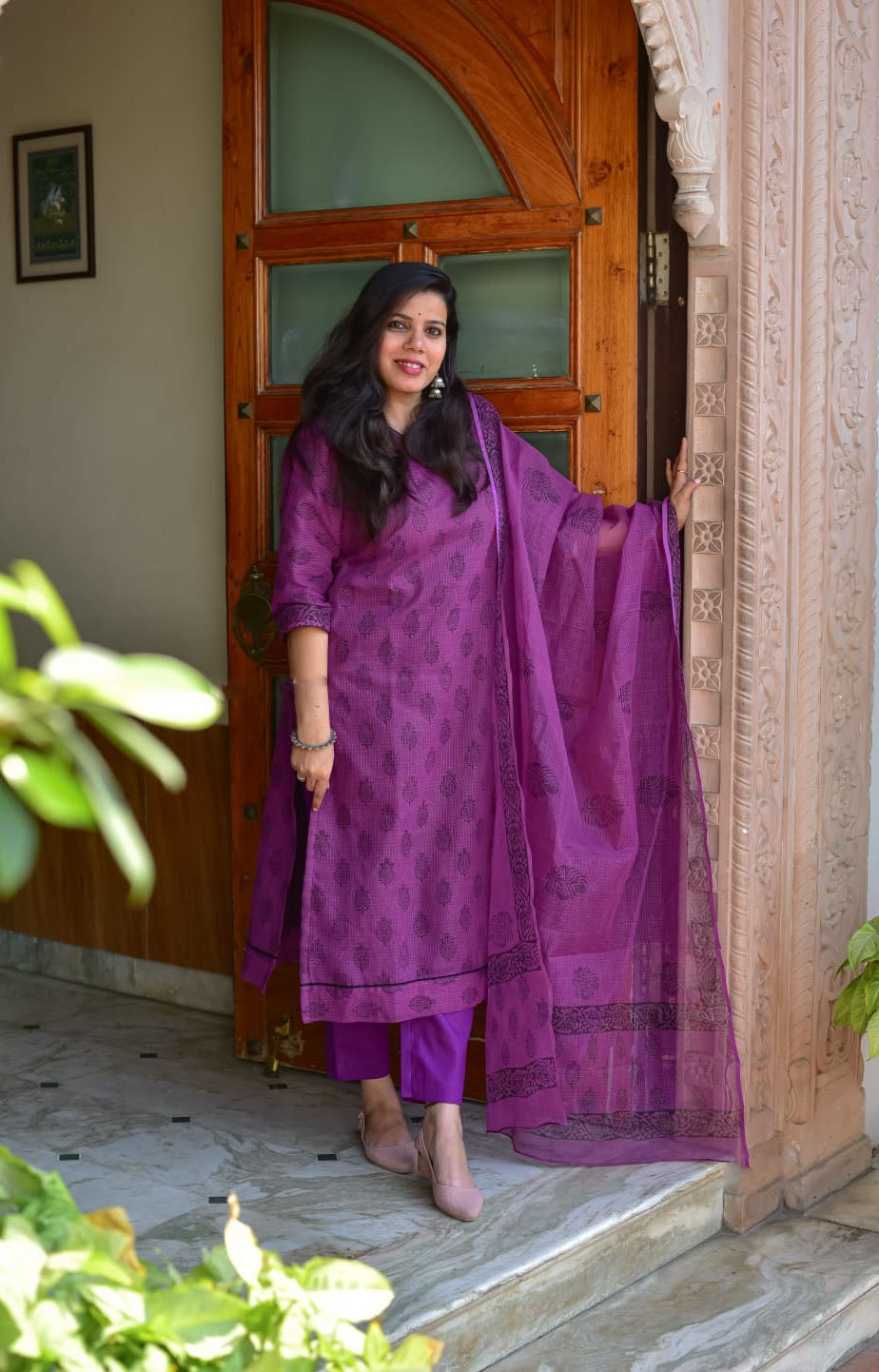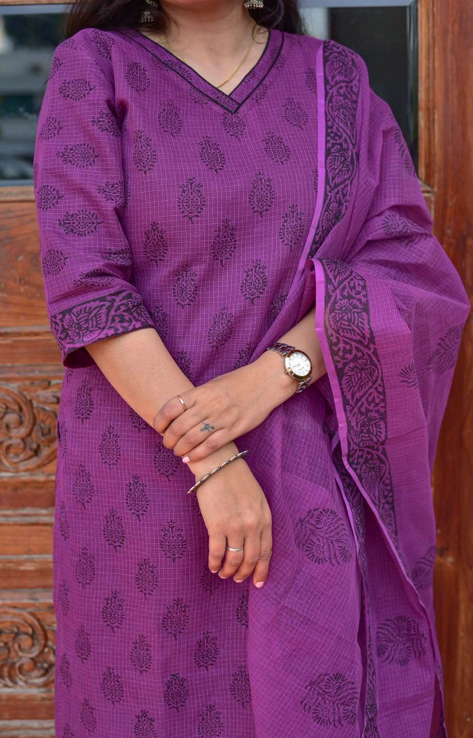 Kota Doria bagh print hand block Kurti (inside cotton Lining) and Cotton Pant paired with matching colours bag print hand block doria duppata