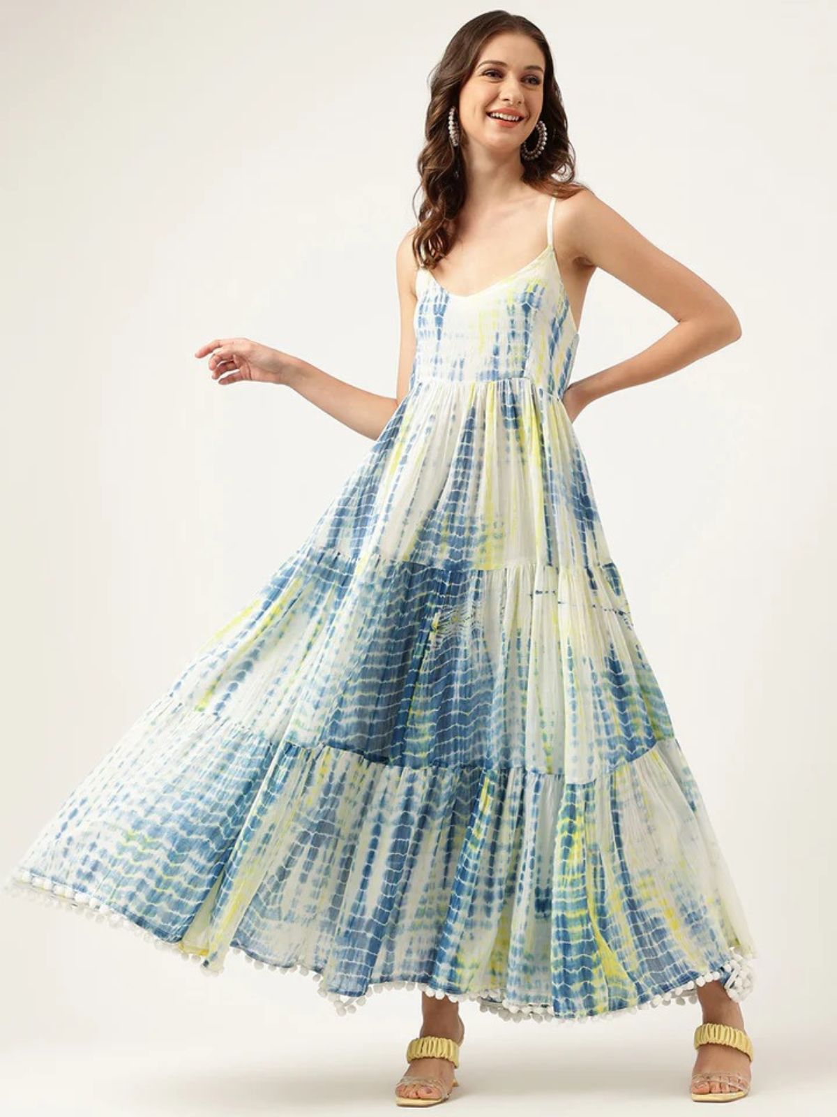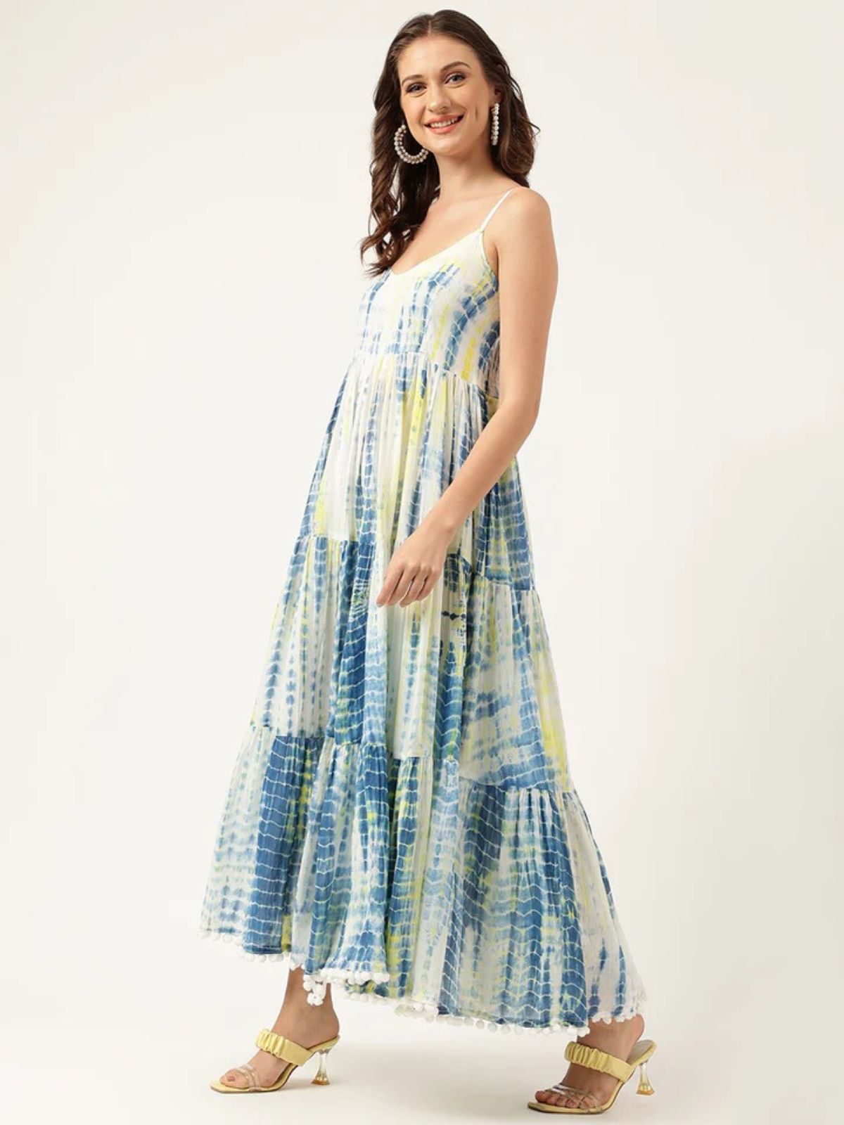 Blue tie and dyed maxi dress. Shoulder straps, Sleeveless