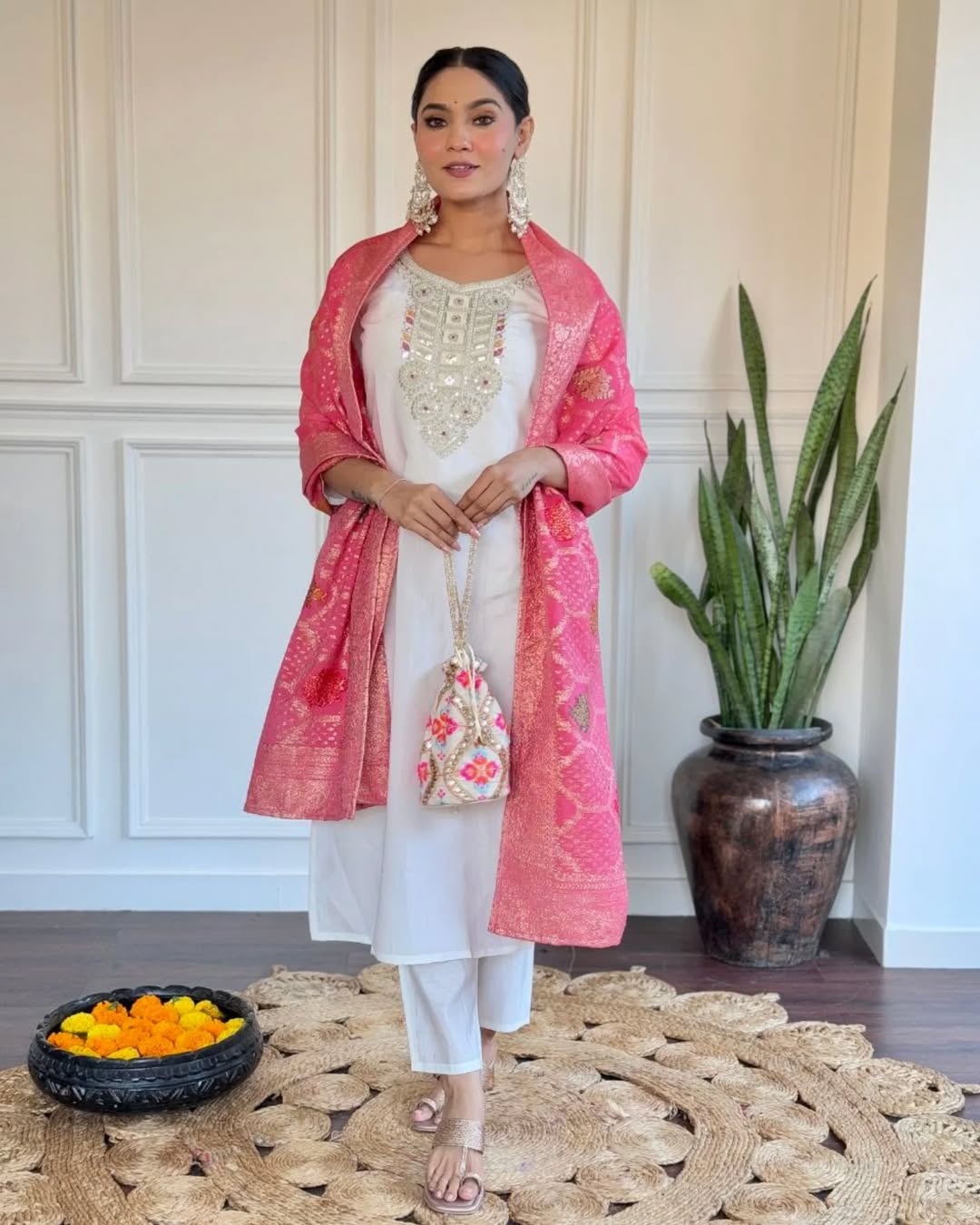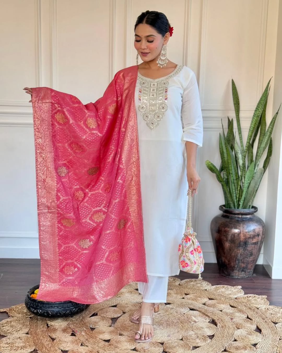 Featuring beautiful Heavy Suit Set which is beautifully decorated with intricate hand embroidery, Zari weaving . It is paired with matching pants and Lace Dupatta.