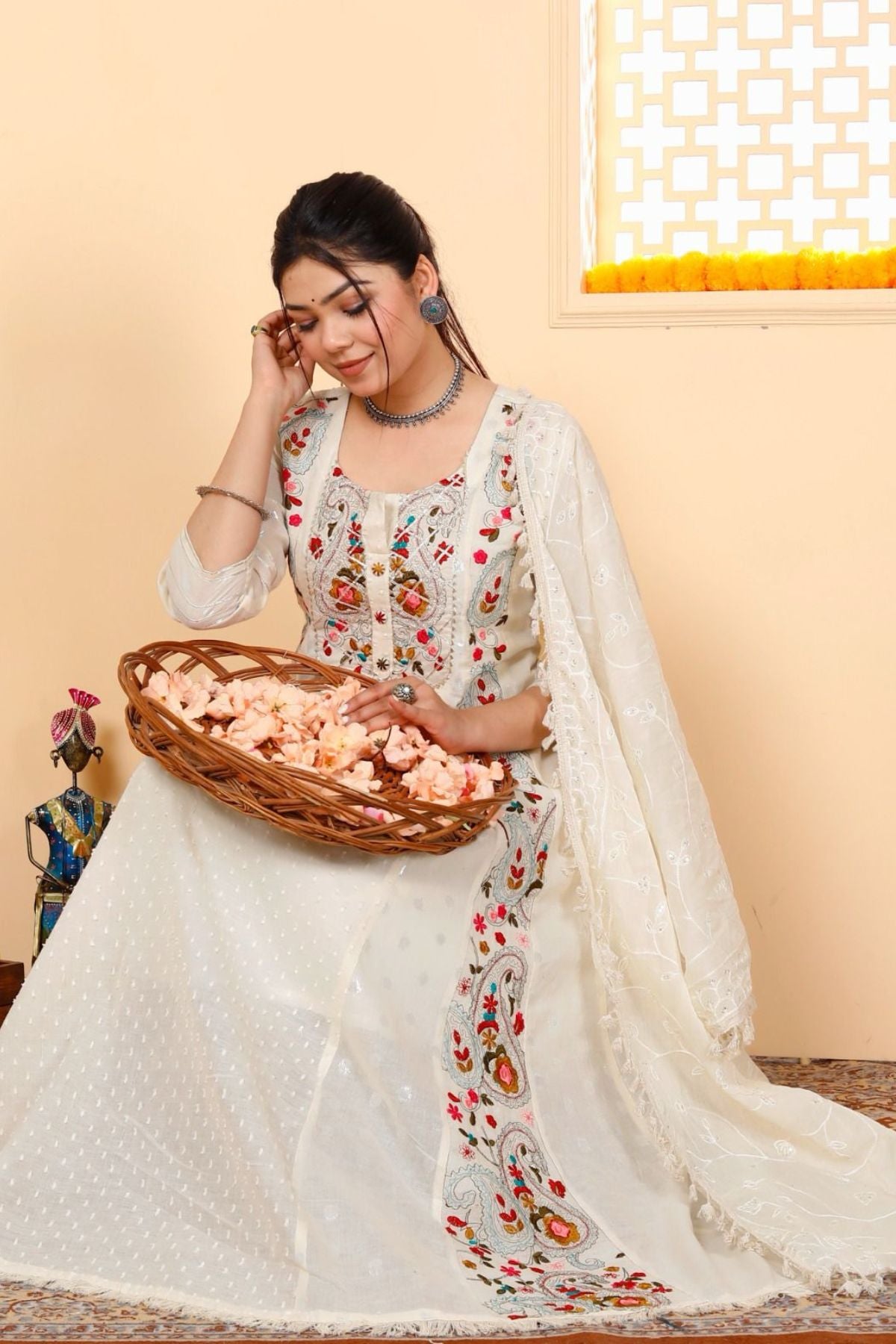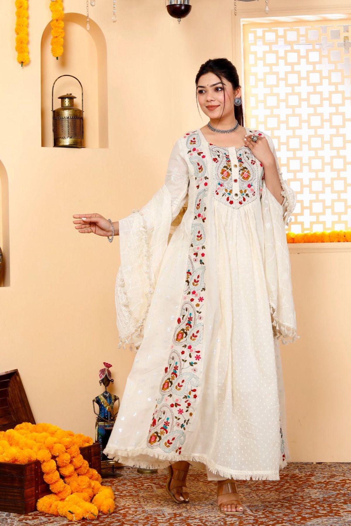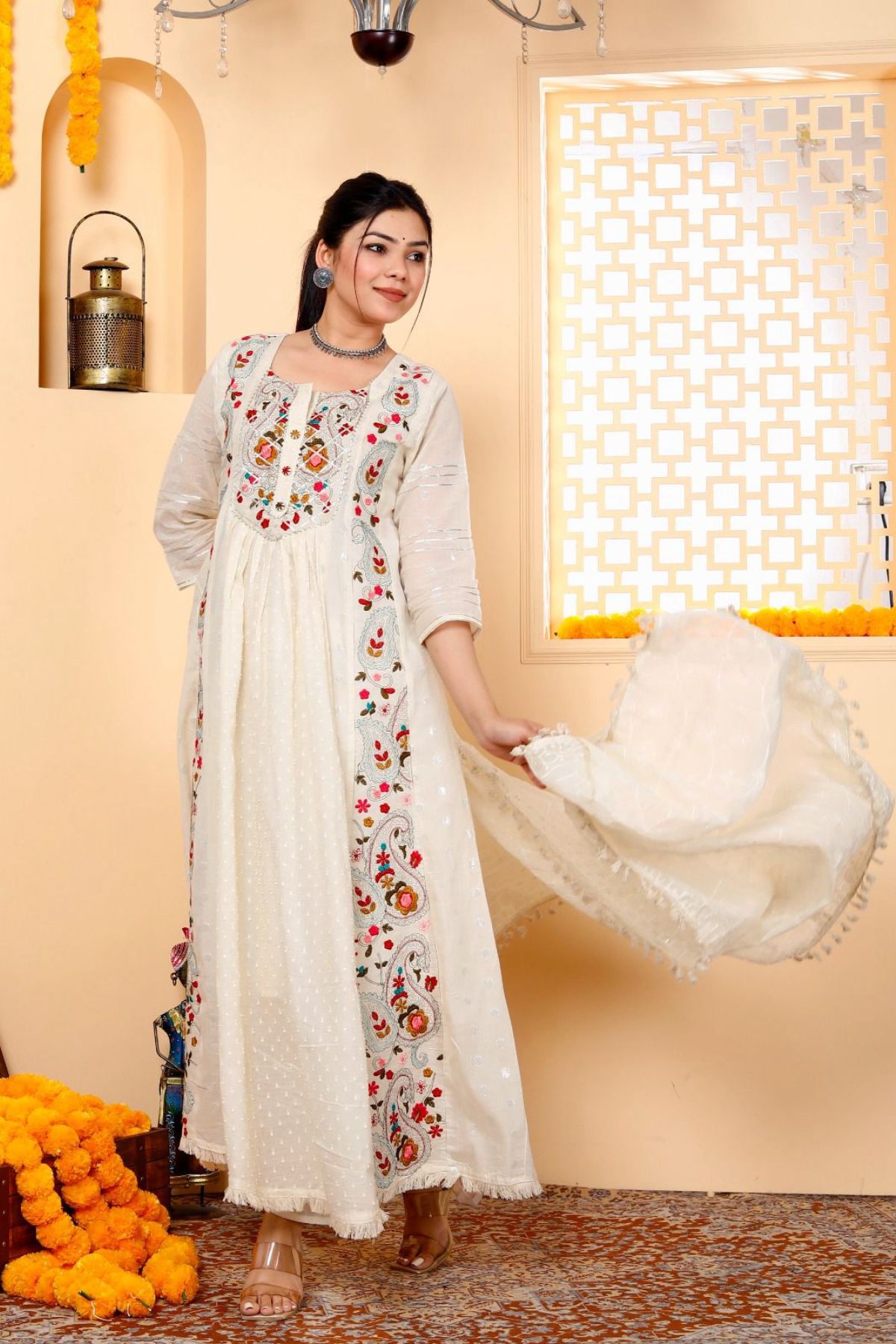Type - Multicoloured Embroidered Gown ,Pant and Malmal Dupatta with sequence Embroidery and Lace.
