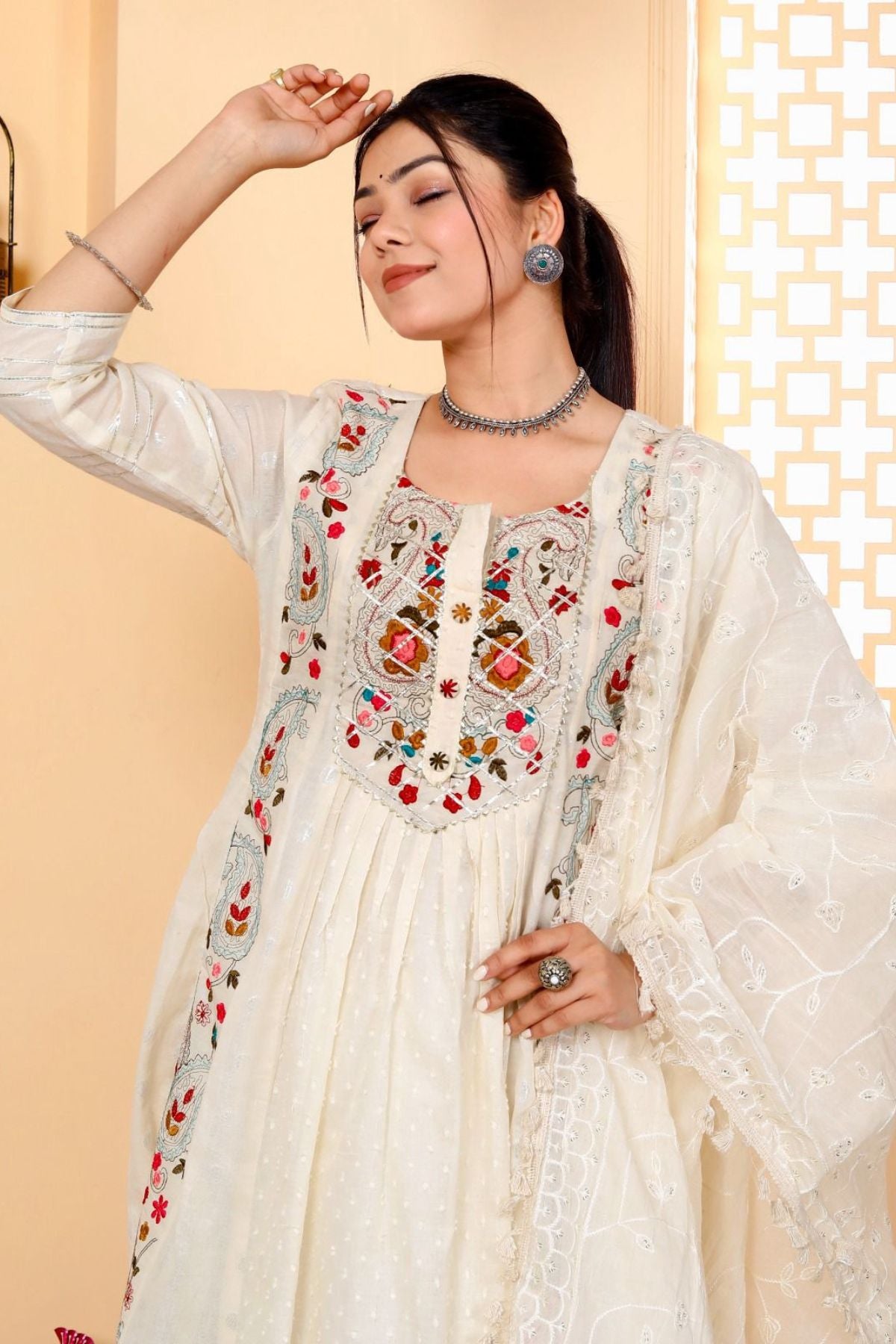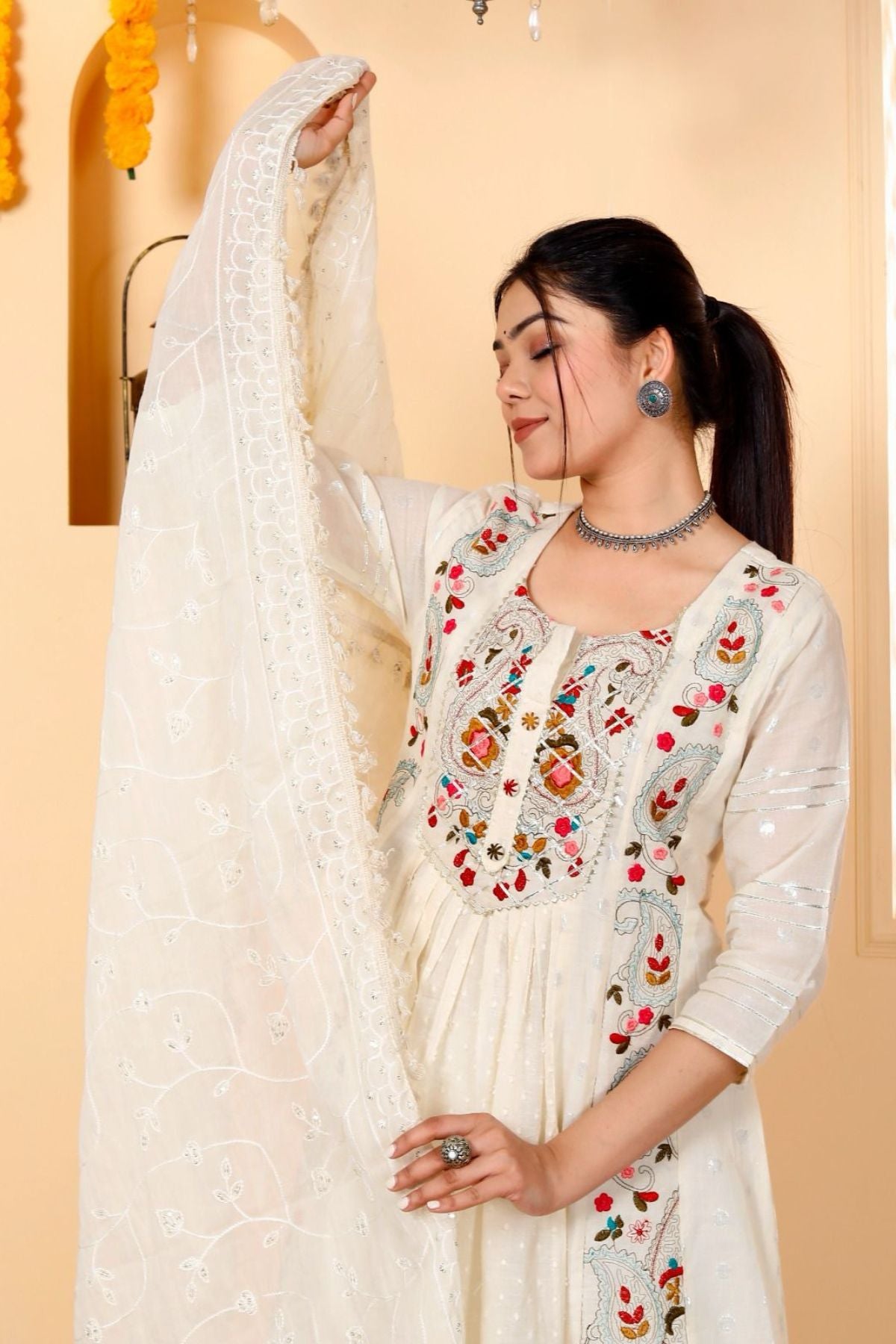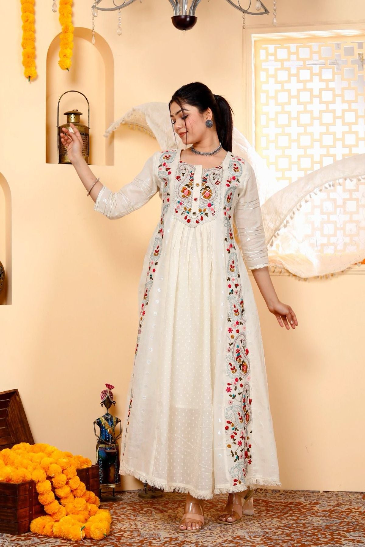 Type - Multicoloured Embroidered Gown ,Pant and Malmal Dupatta with sequence Embroidery and Lace.