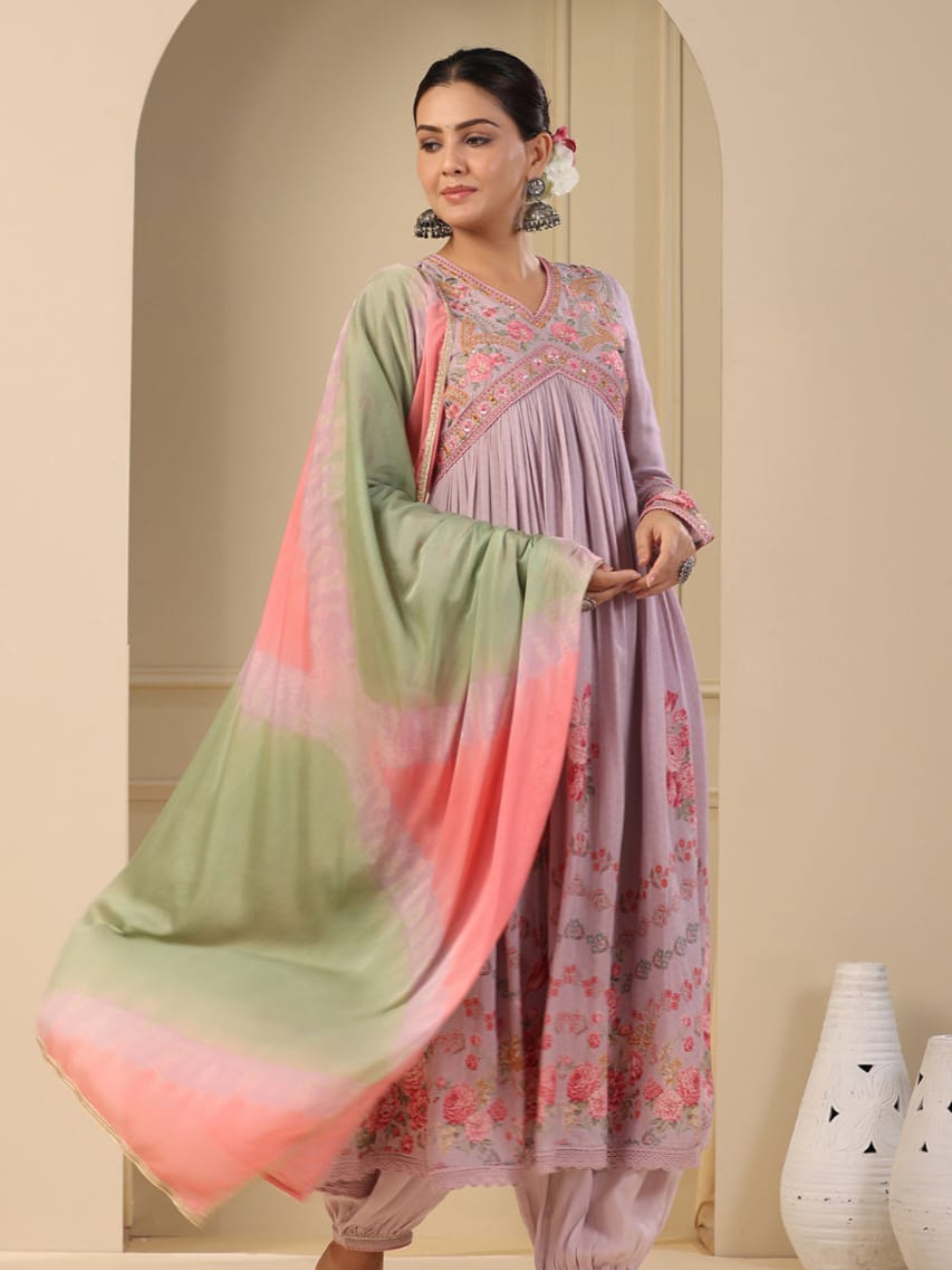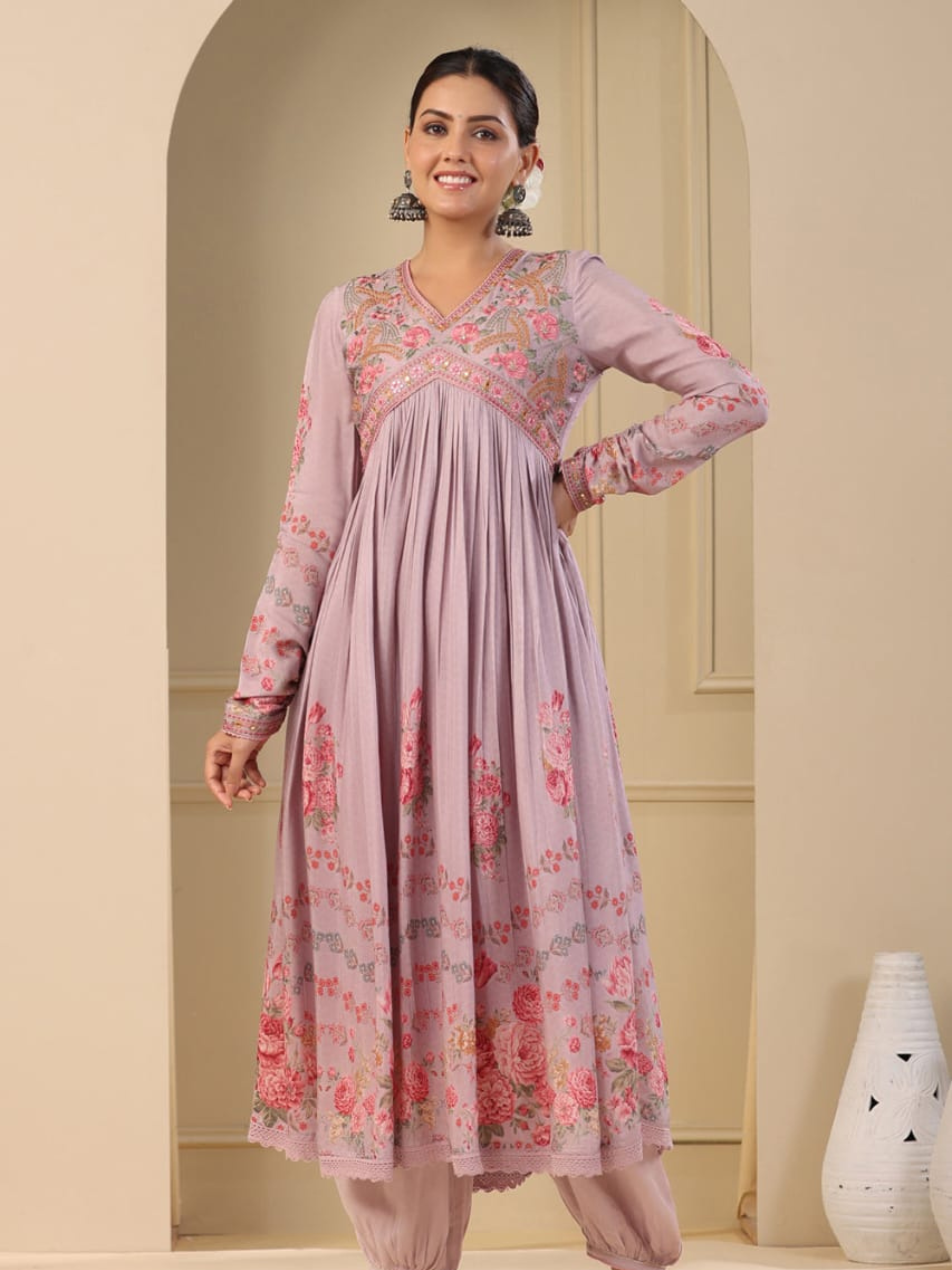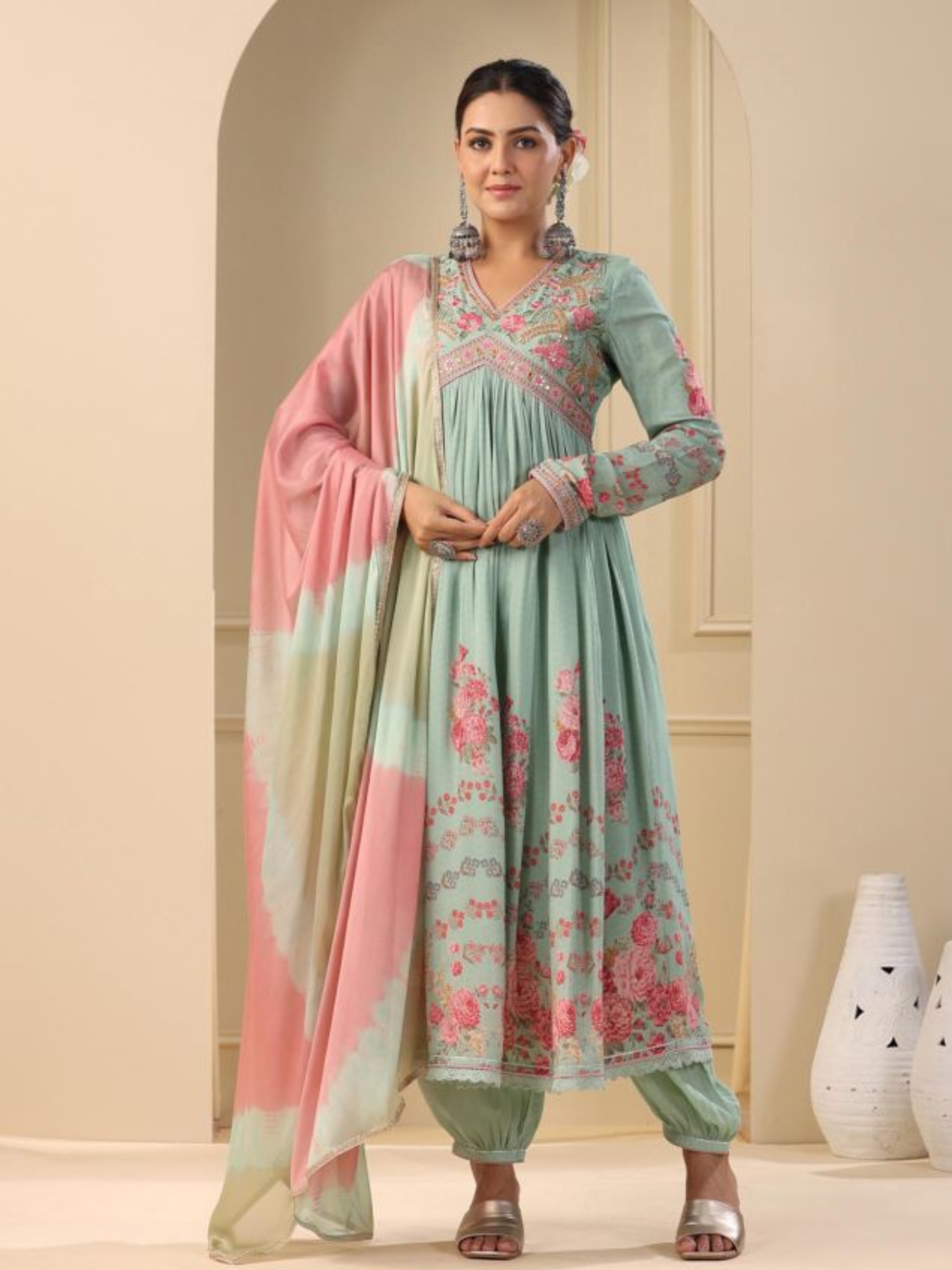 It comes with digital shine print and embroidery. A perfect ethnic wear for this festive season.