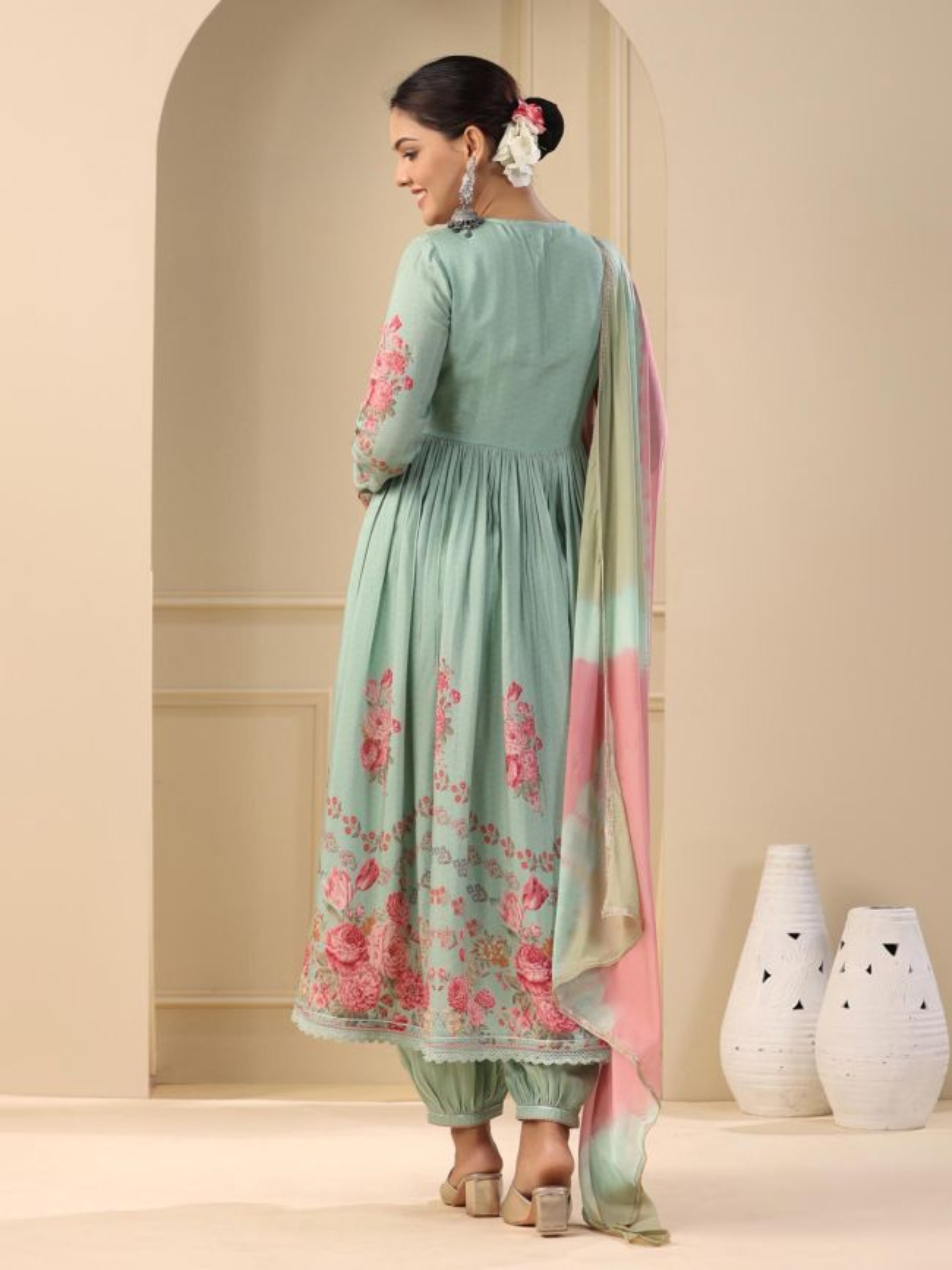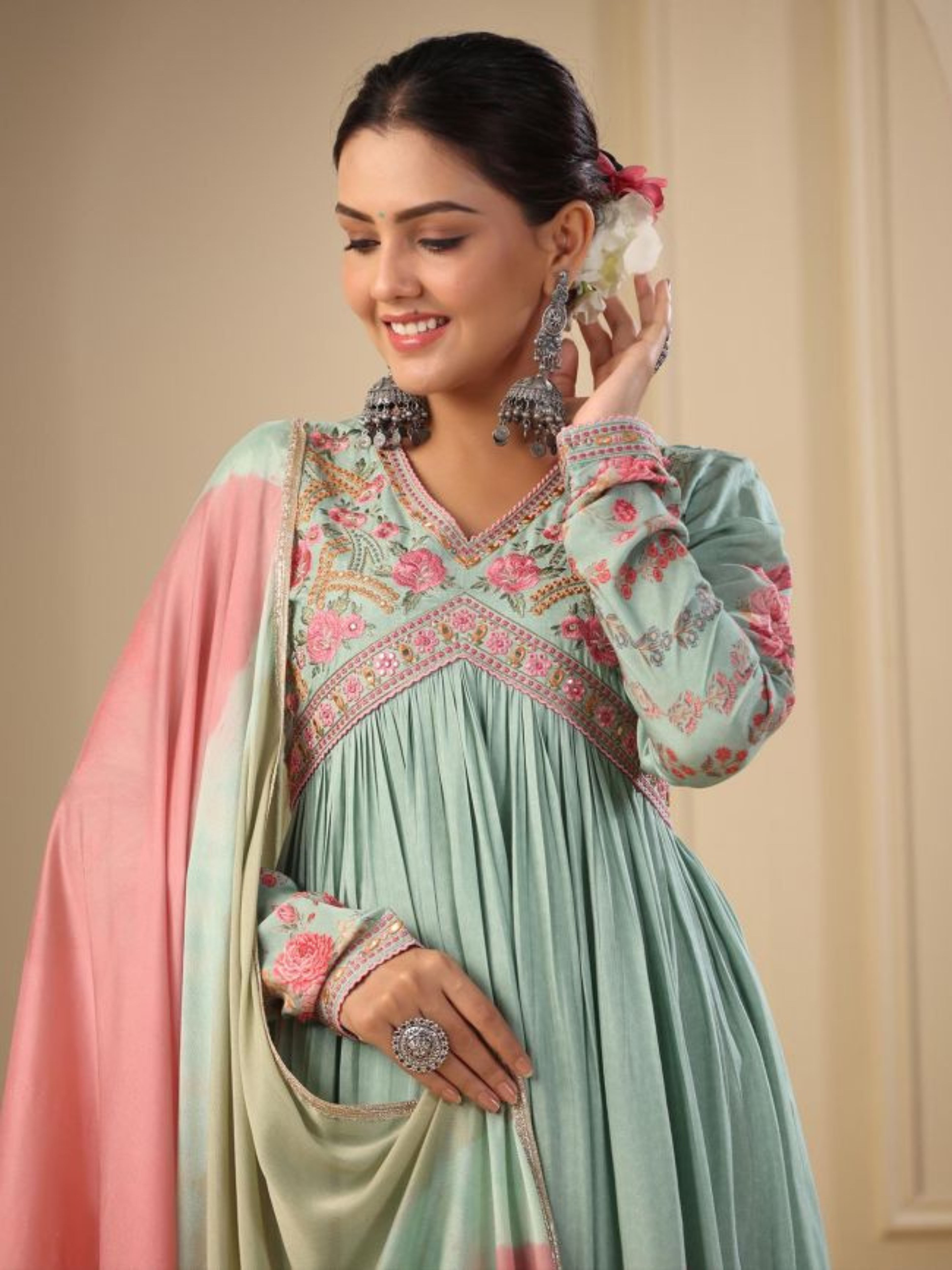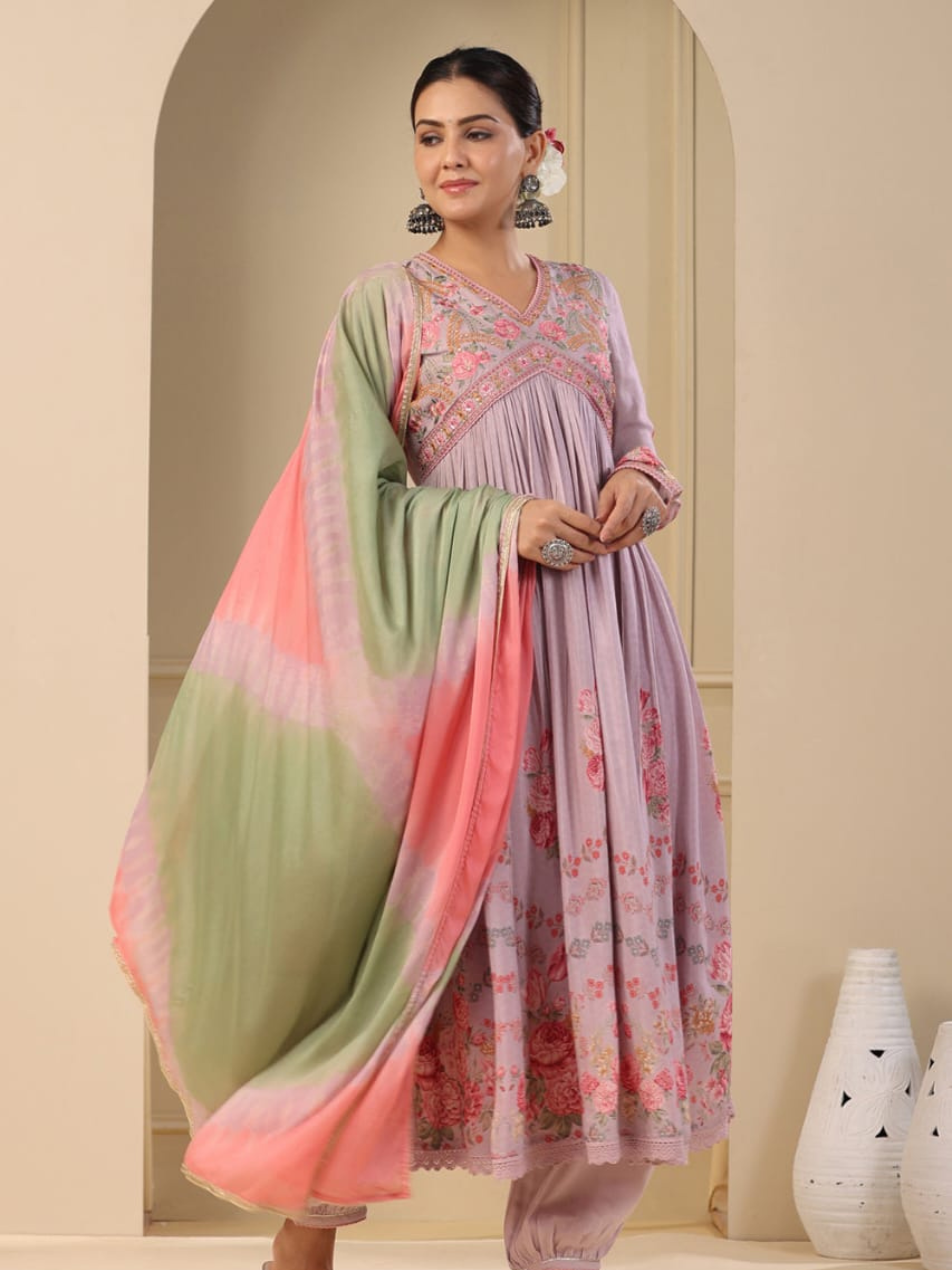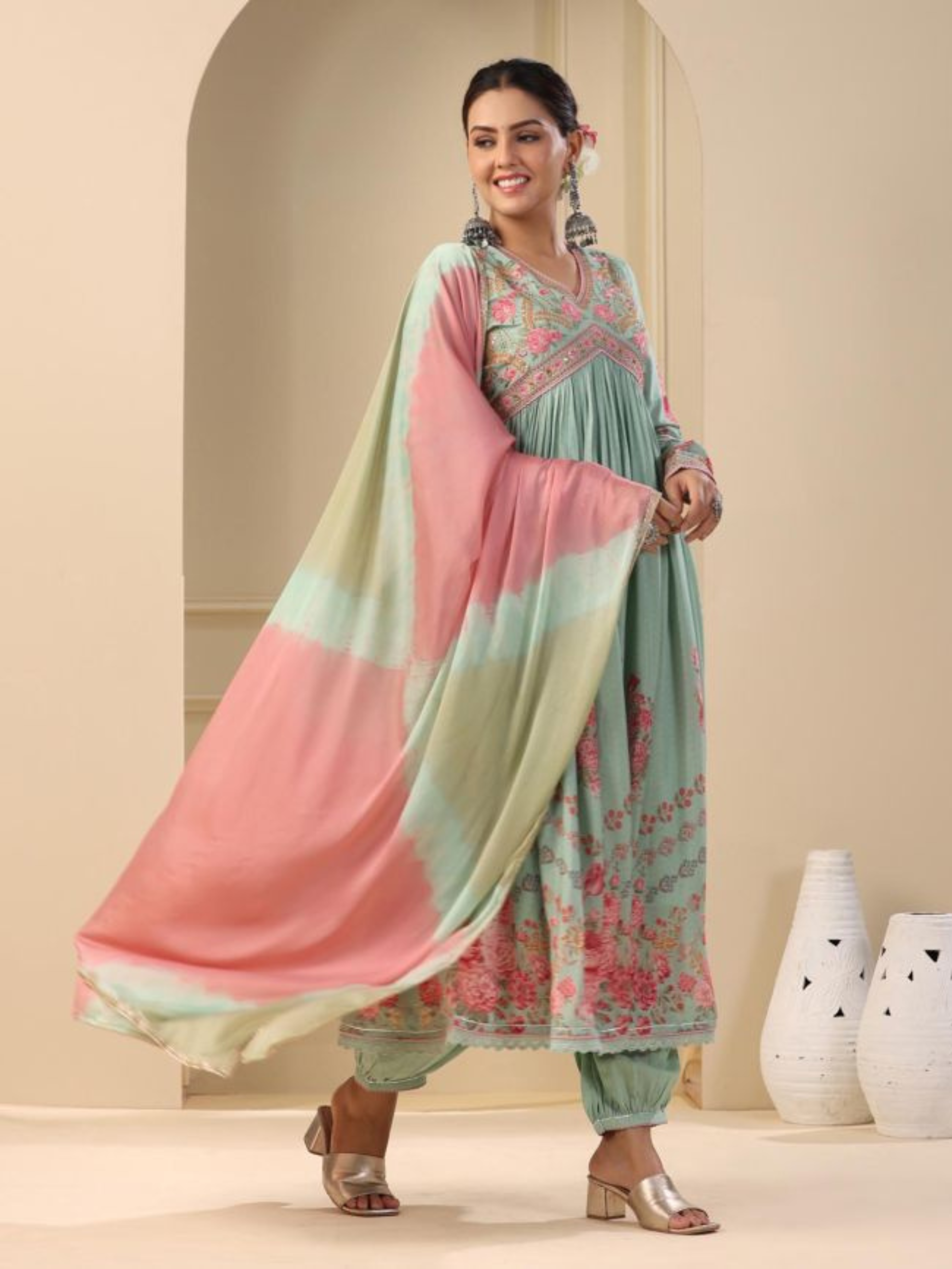 It comes with digital shine print and embroidery. A perfect ethnic wear for this festive season.