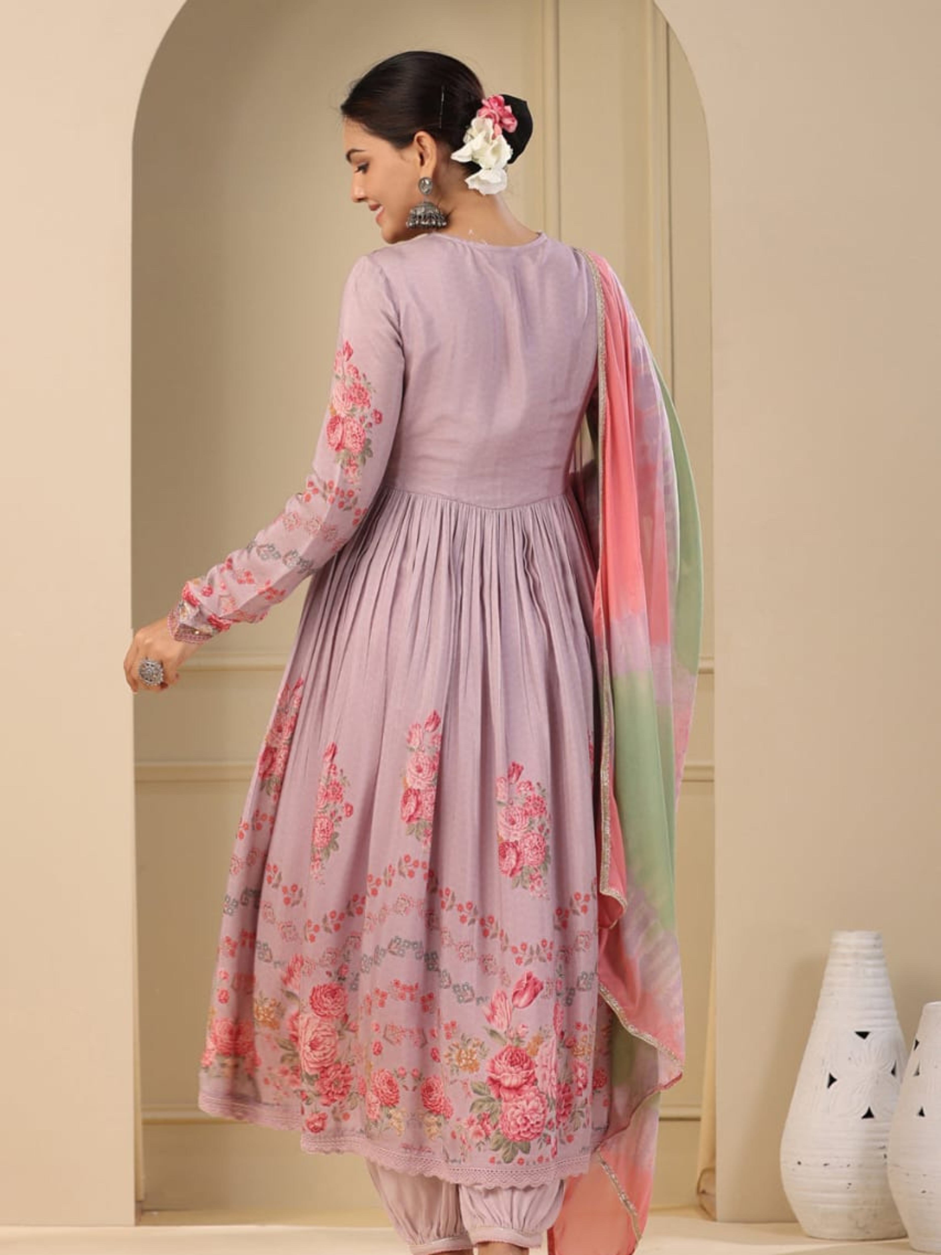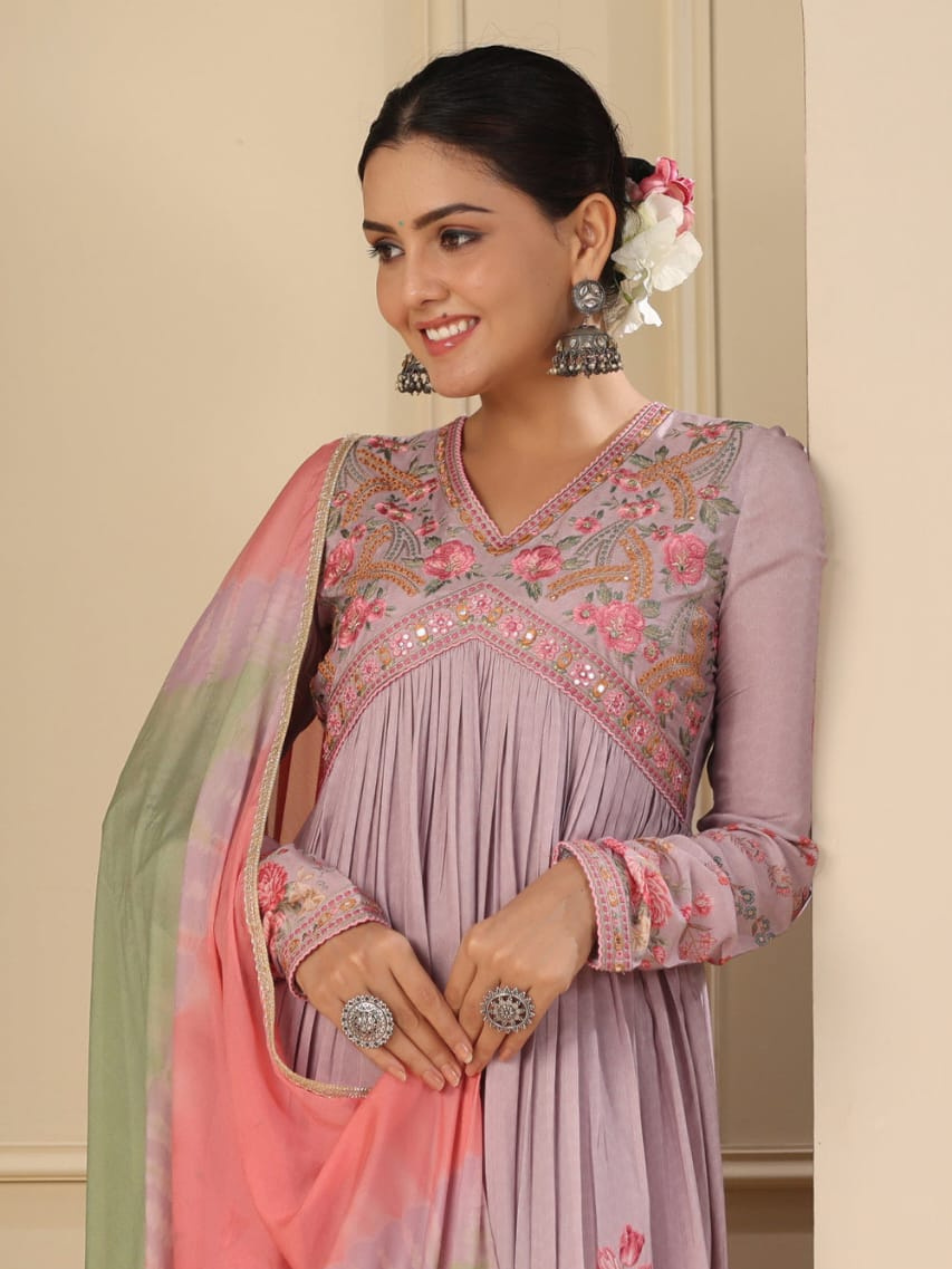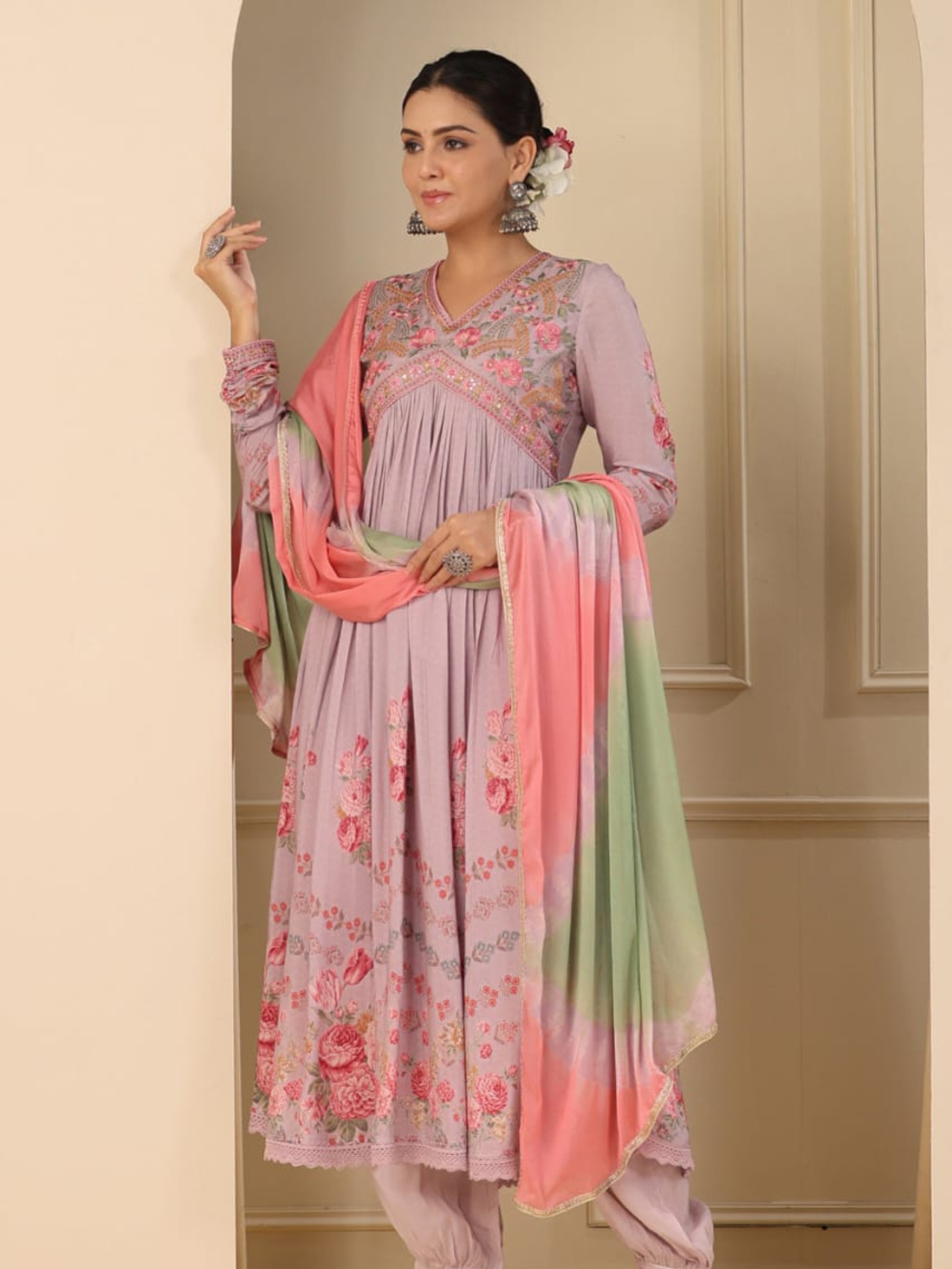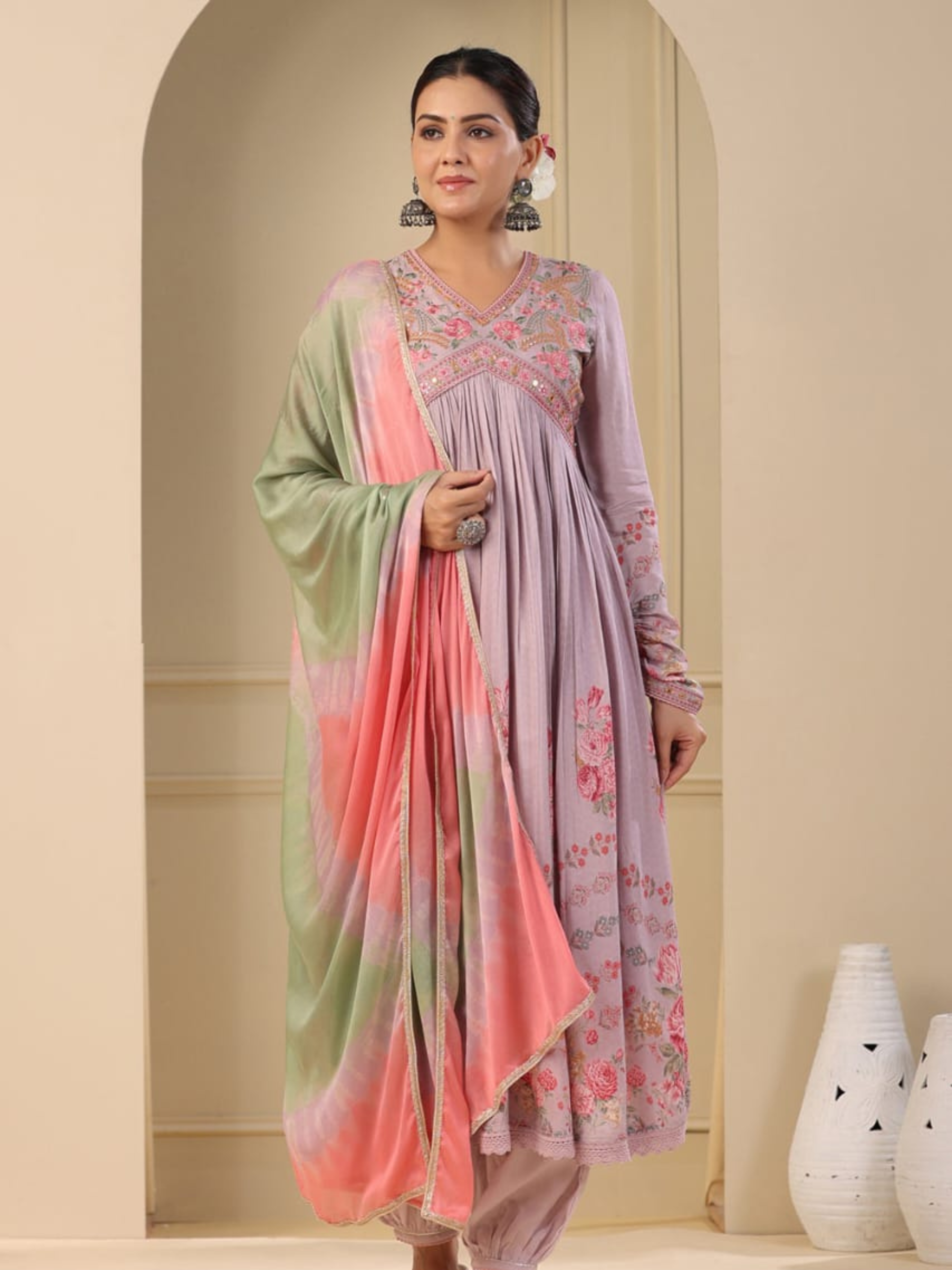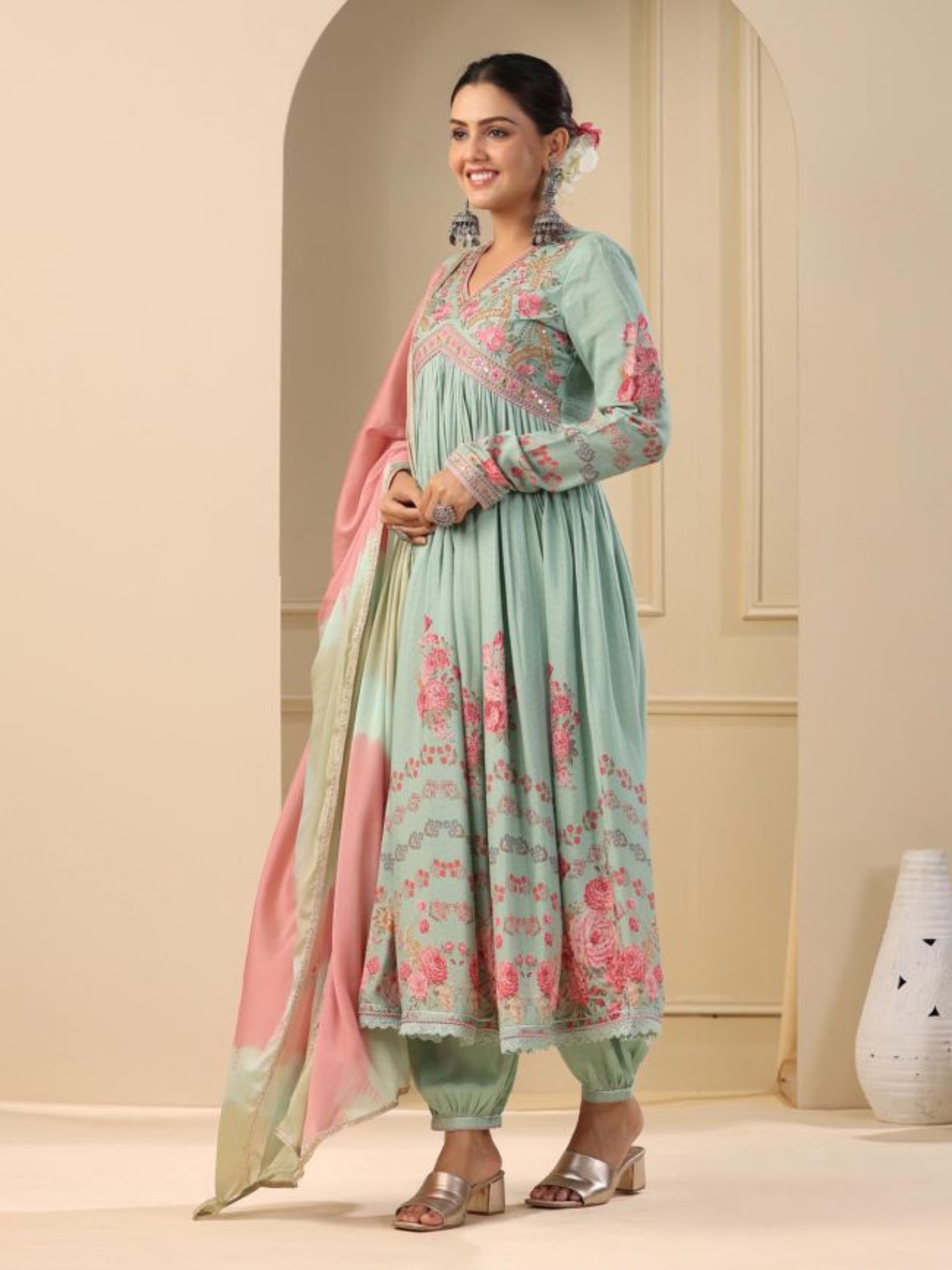 Featuring beautiful muslin alia cut suit set which is beautifully decorated with intricate hand embroidery, zari weaving and prints. It is paired with matching pants and lace dupatta.