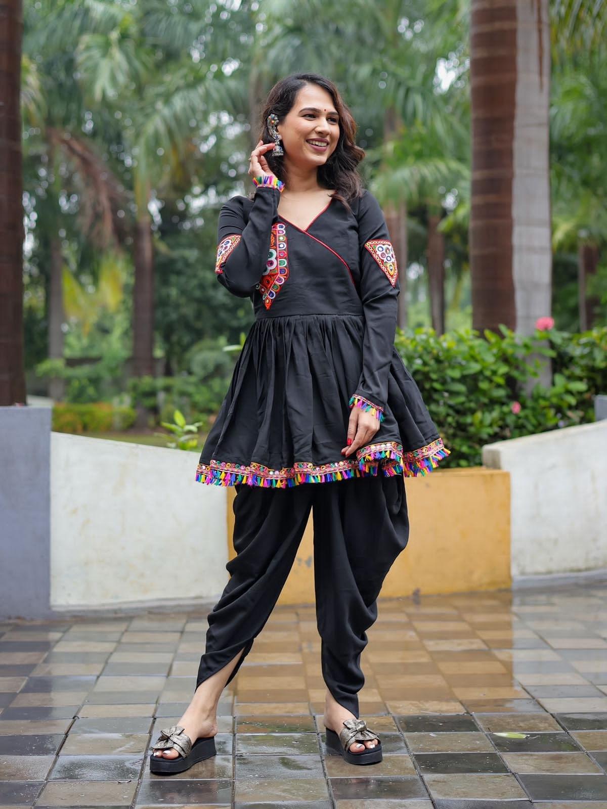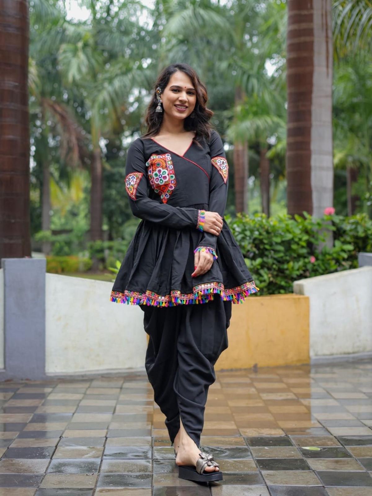 Prepping up for a night of garba dancing is always exciting. If you happen to find the perfect outfit for the night, even better. This outfit from kumi is definitely the right choice to get that garba feel. Designer top and dhoti set with embroidery and lace work is a must this festive season.