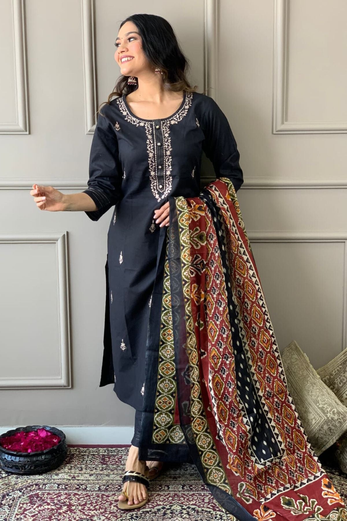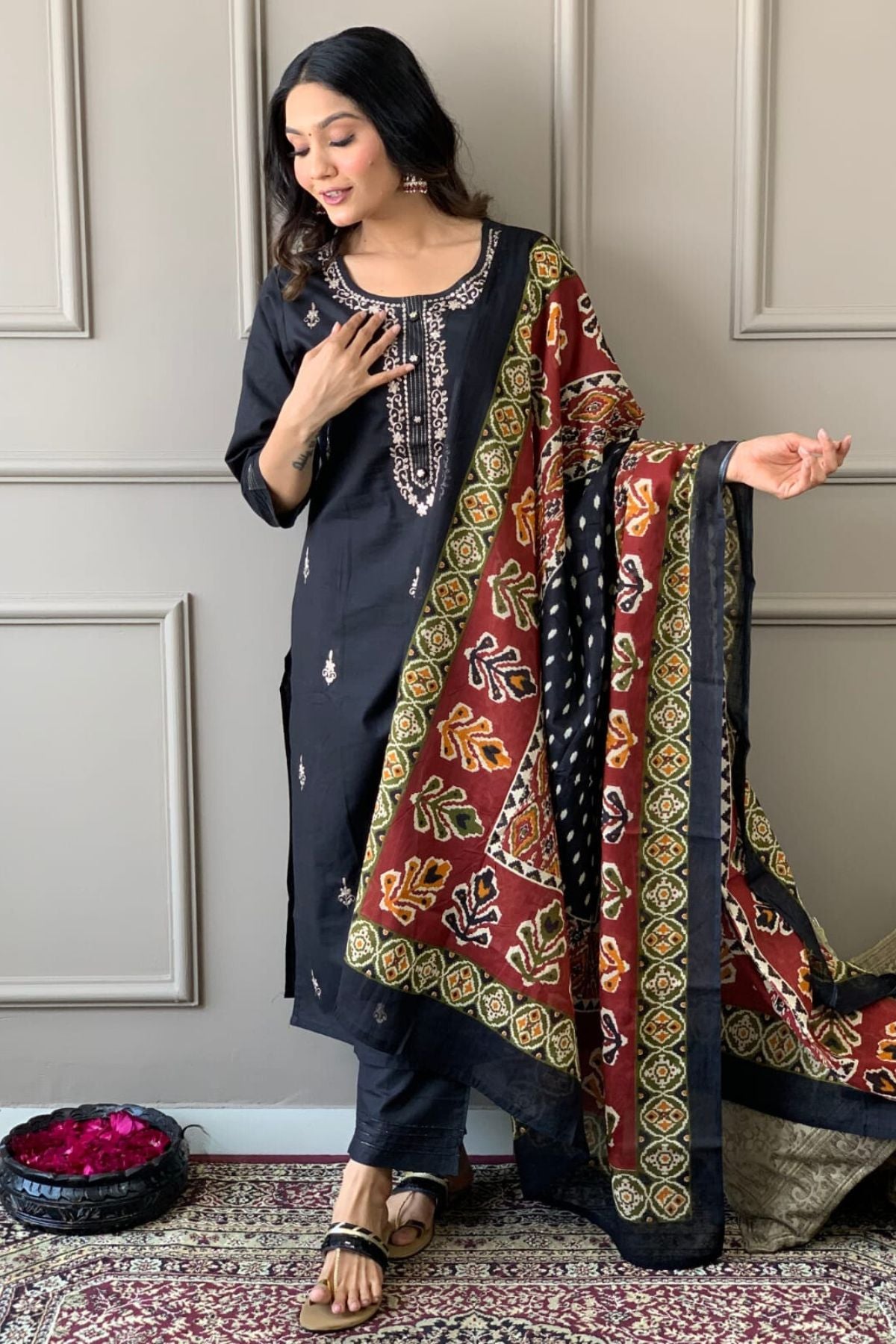 Beautiful kurta with pant dupatta set with pittan work. A perfect outfit for formal gatherings.