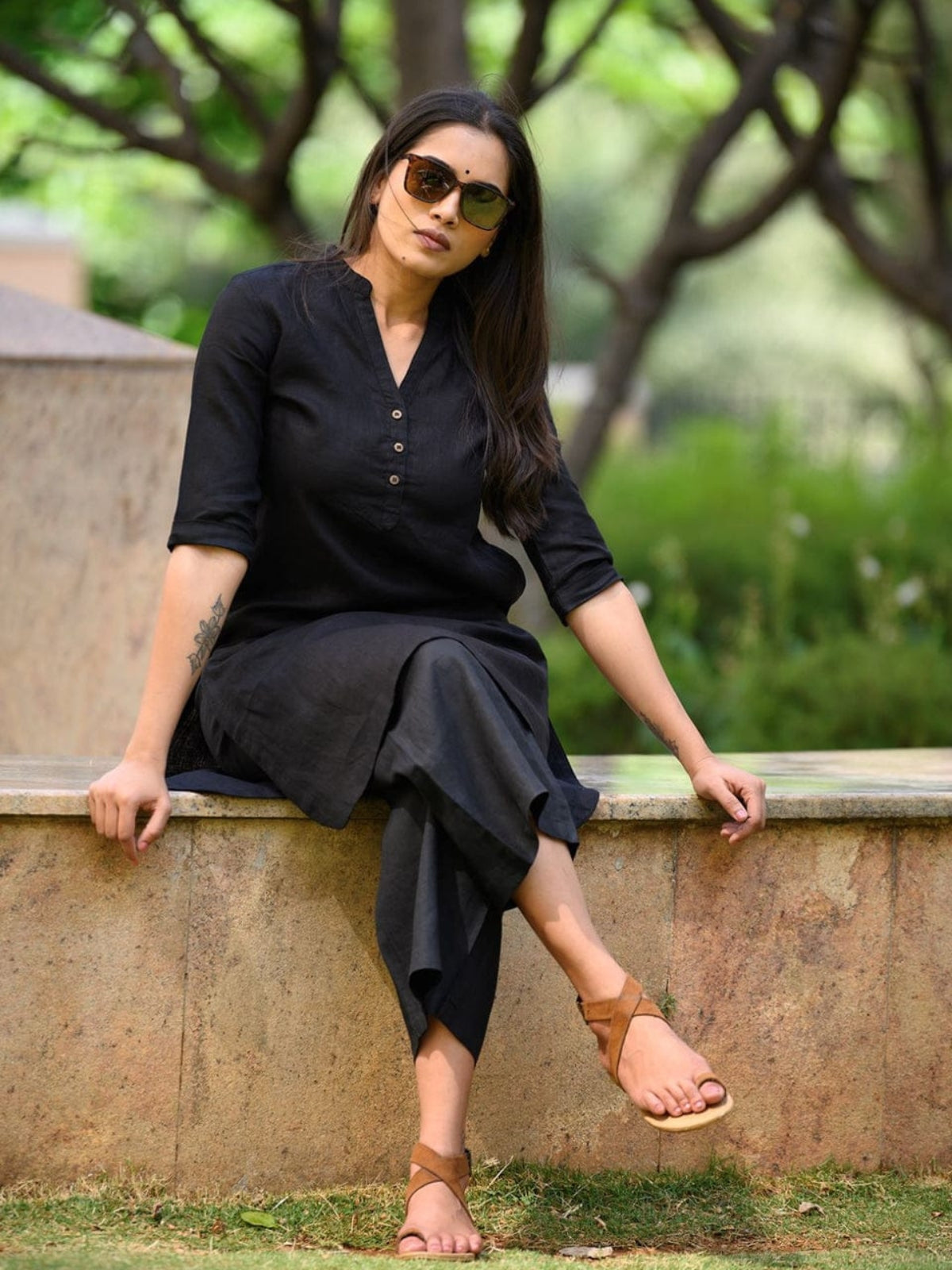 Plain Black V Neck Kurta Pant Set