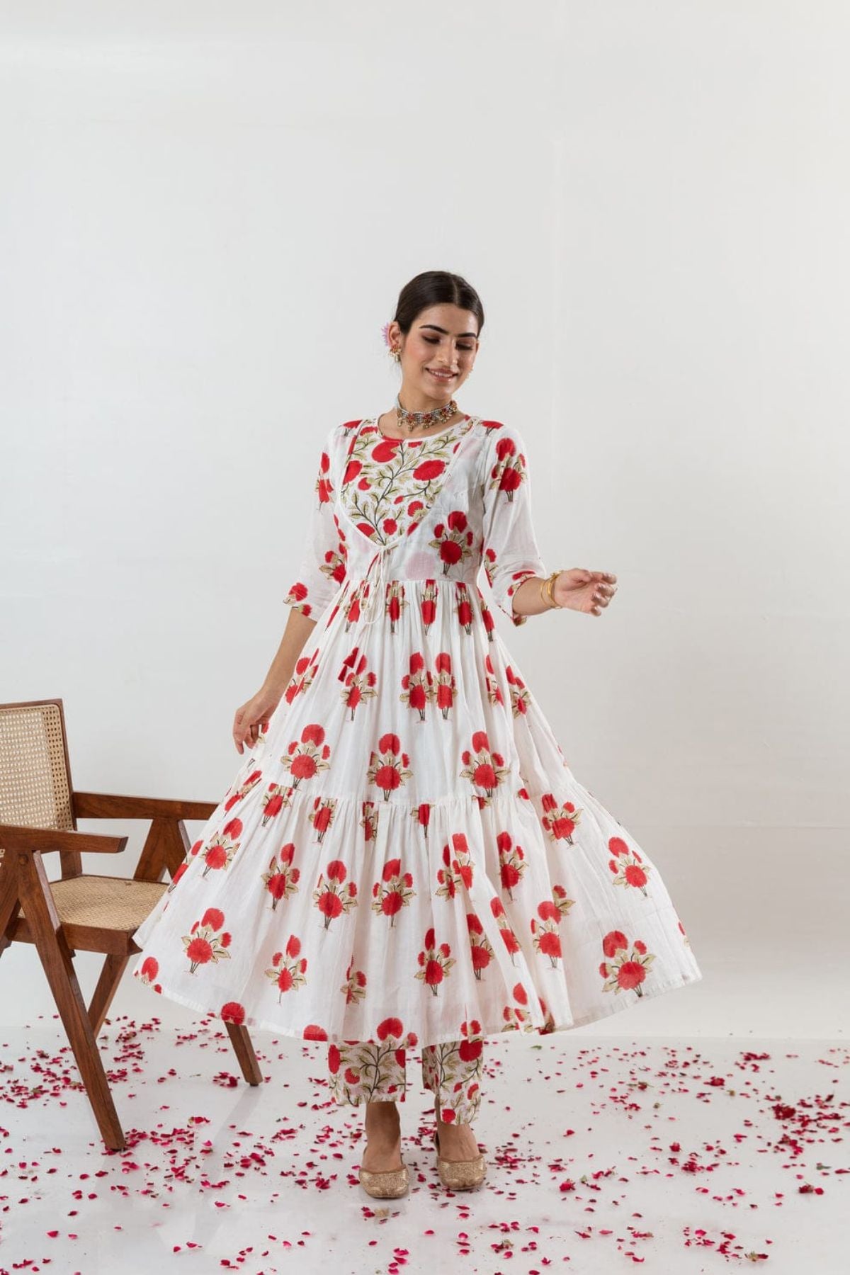 ulabi Poppy print gathered kurta with round neck with tie up details.