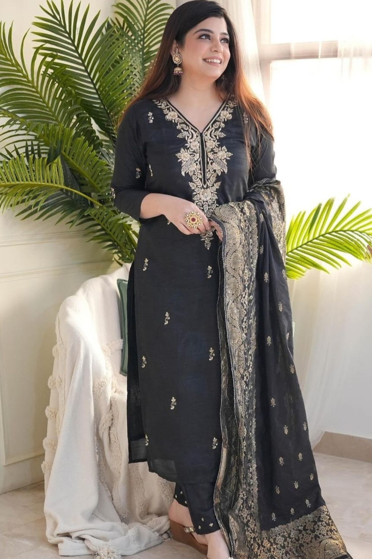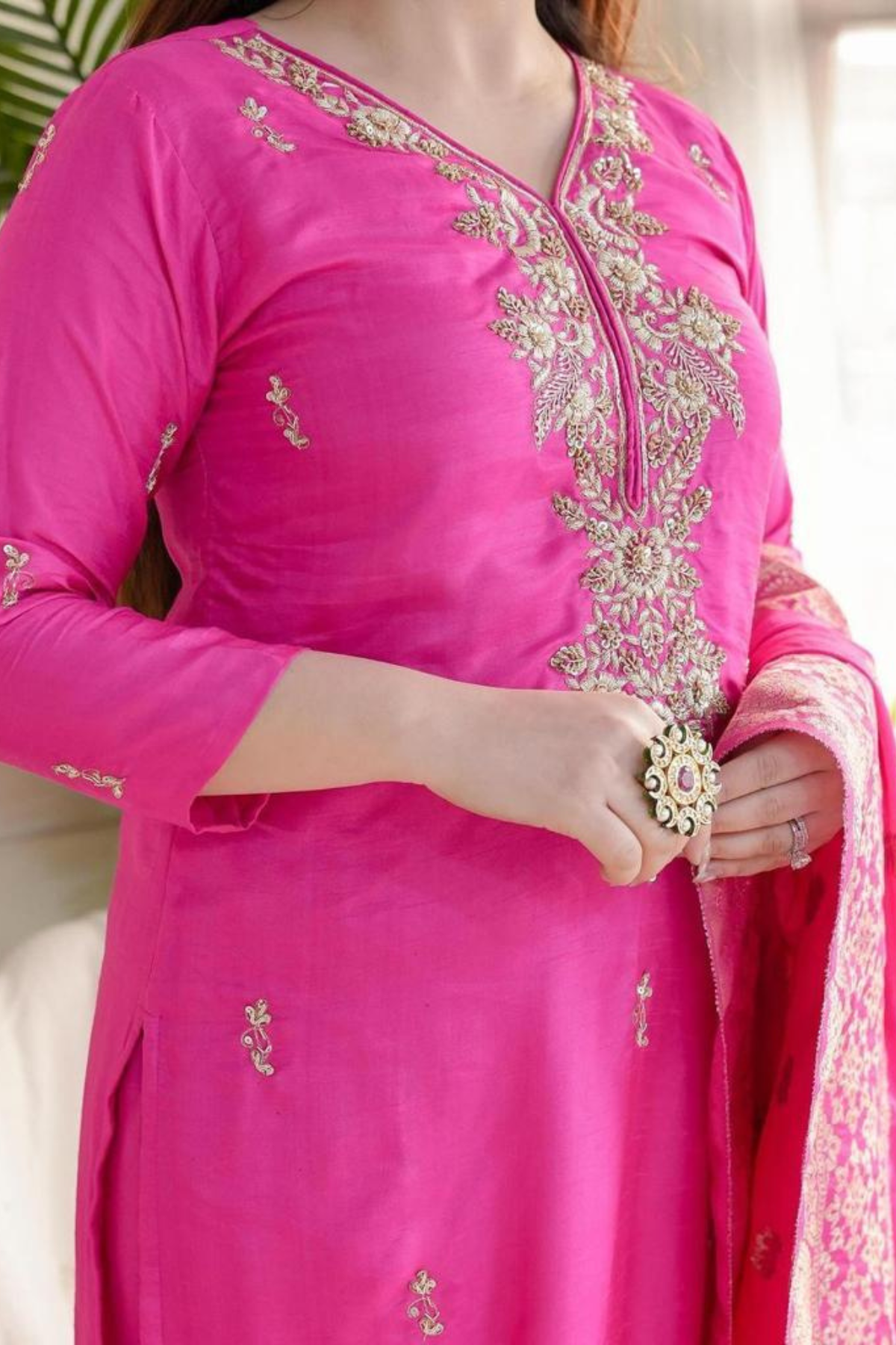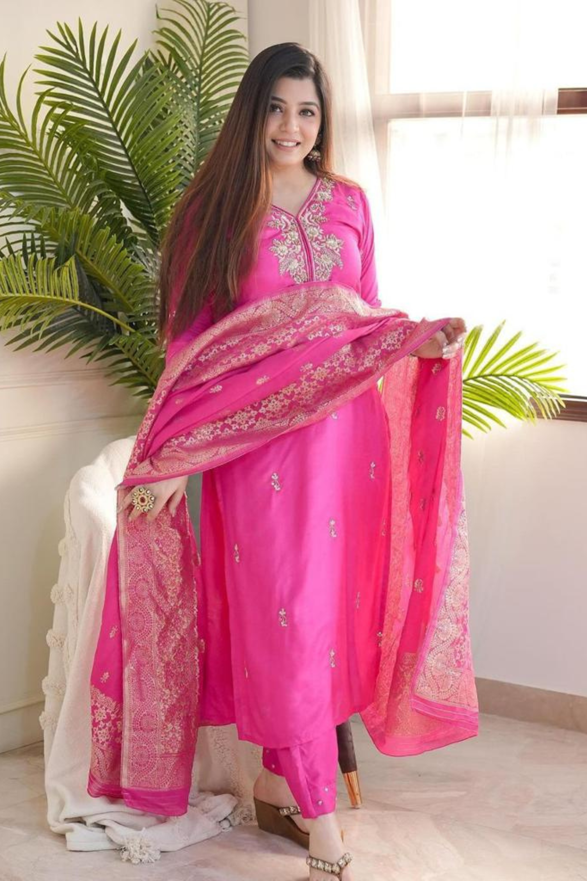 Go and ready this beautiful collection of Gorgeous Premium silk kurti with work on yoke and sleeves paired with matching pant and premimum bnarasi duppata