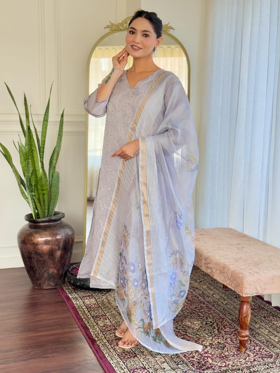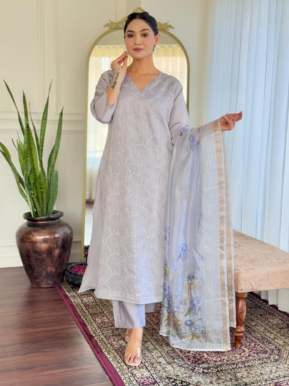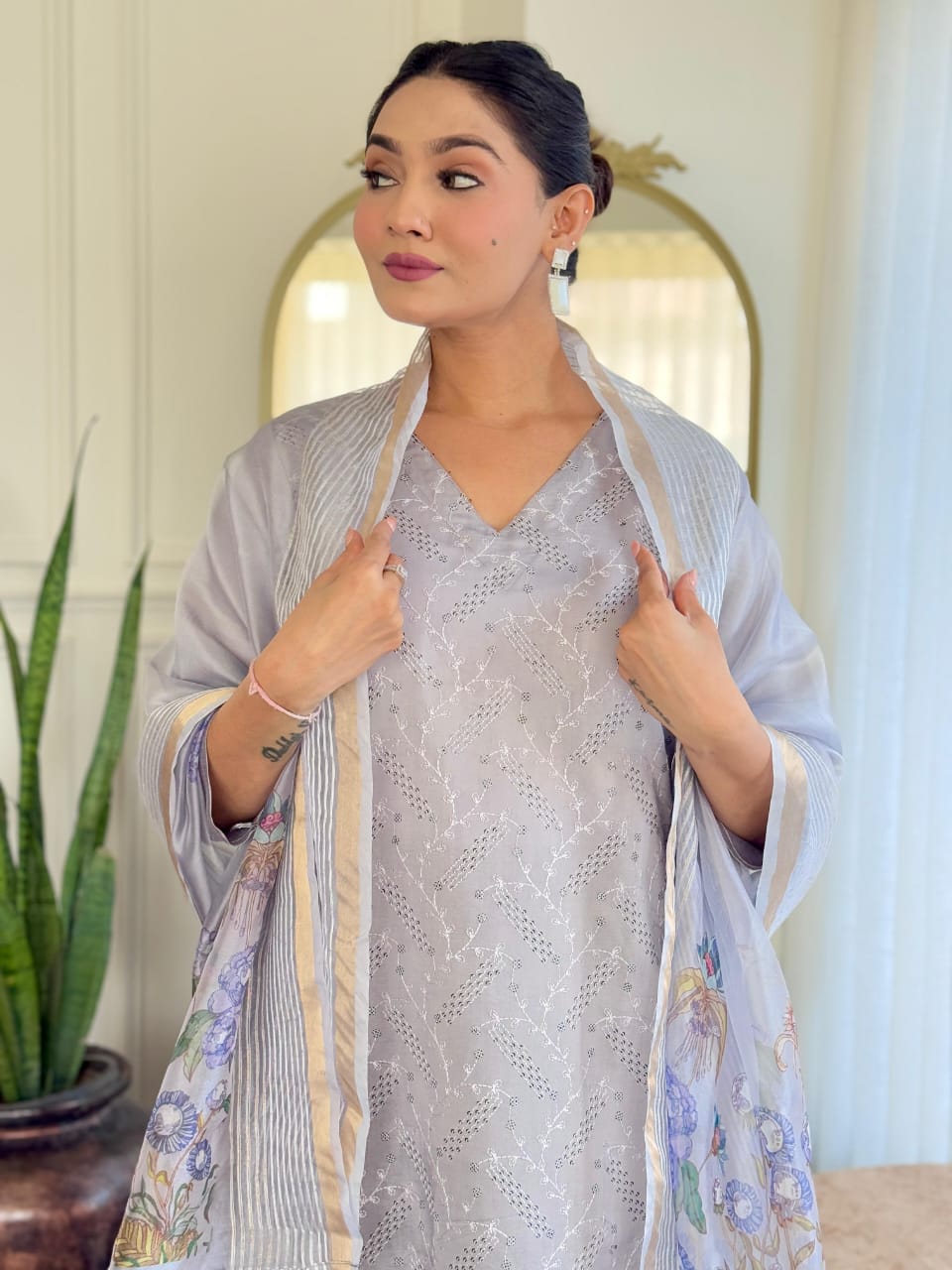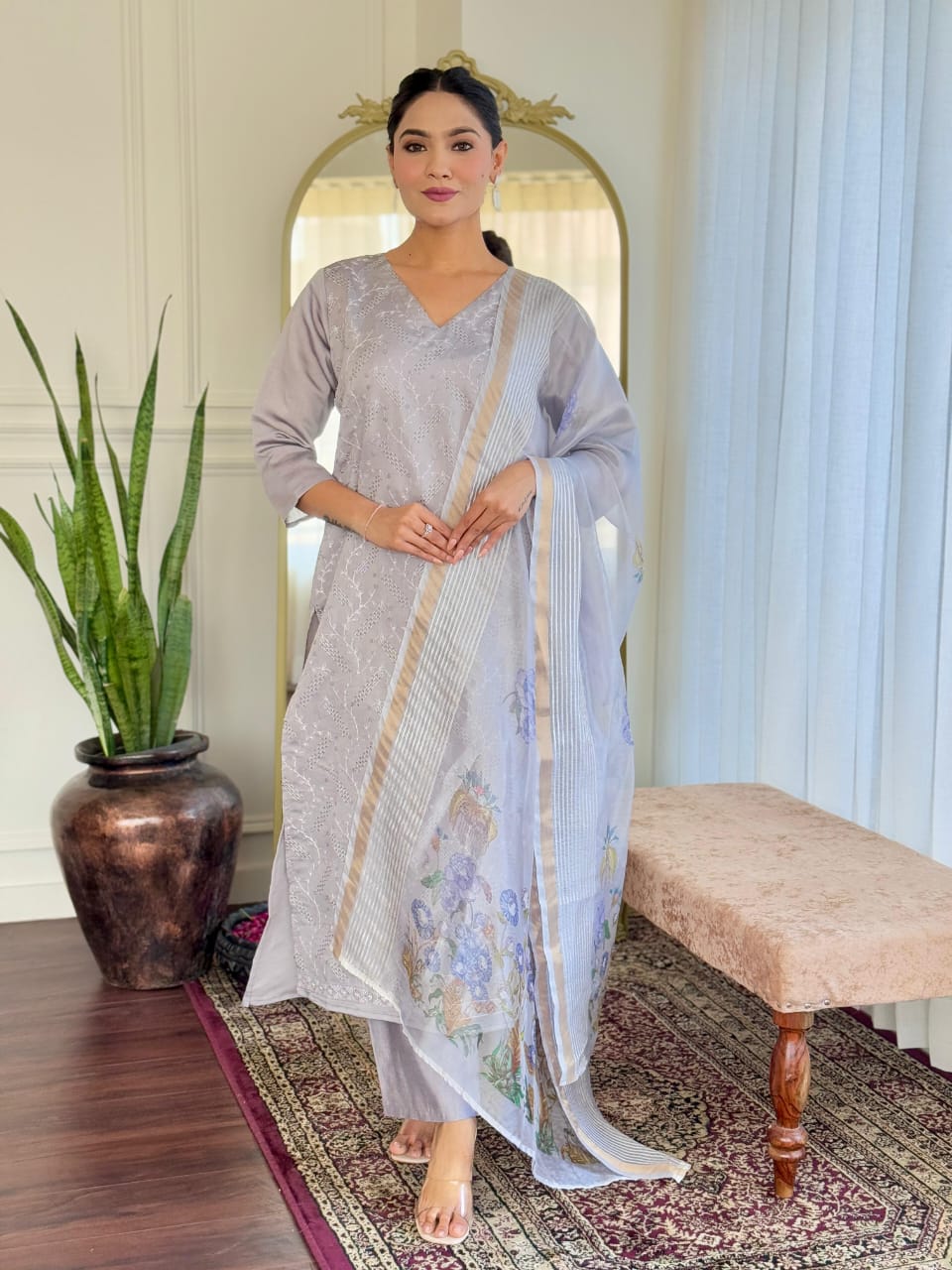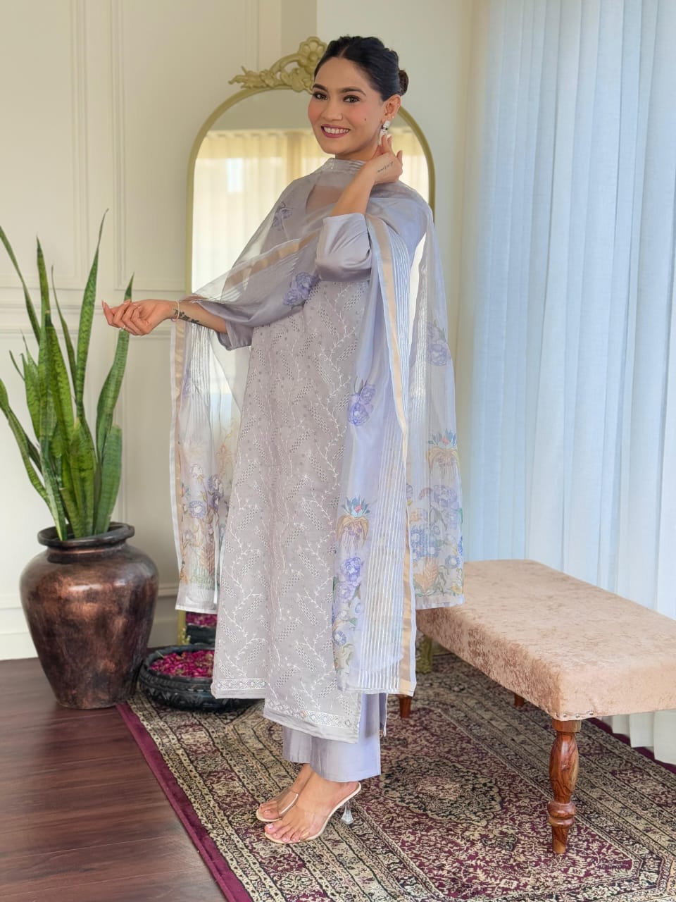 Featuring Fully Elegant Roman silk Suit Set Which is Beautifully Decorated With Beautiful chikan kari Sequence work . It Is Paired With Matching Pants And Printed Dupatta